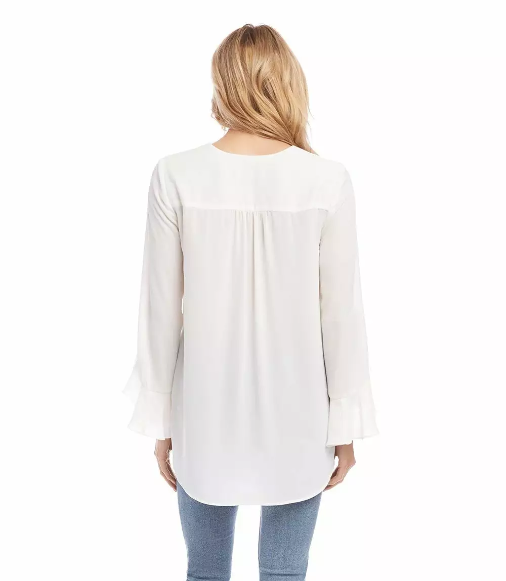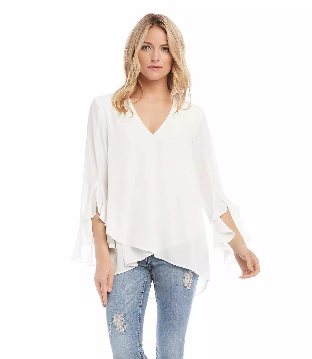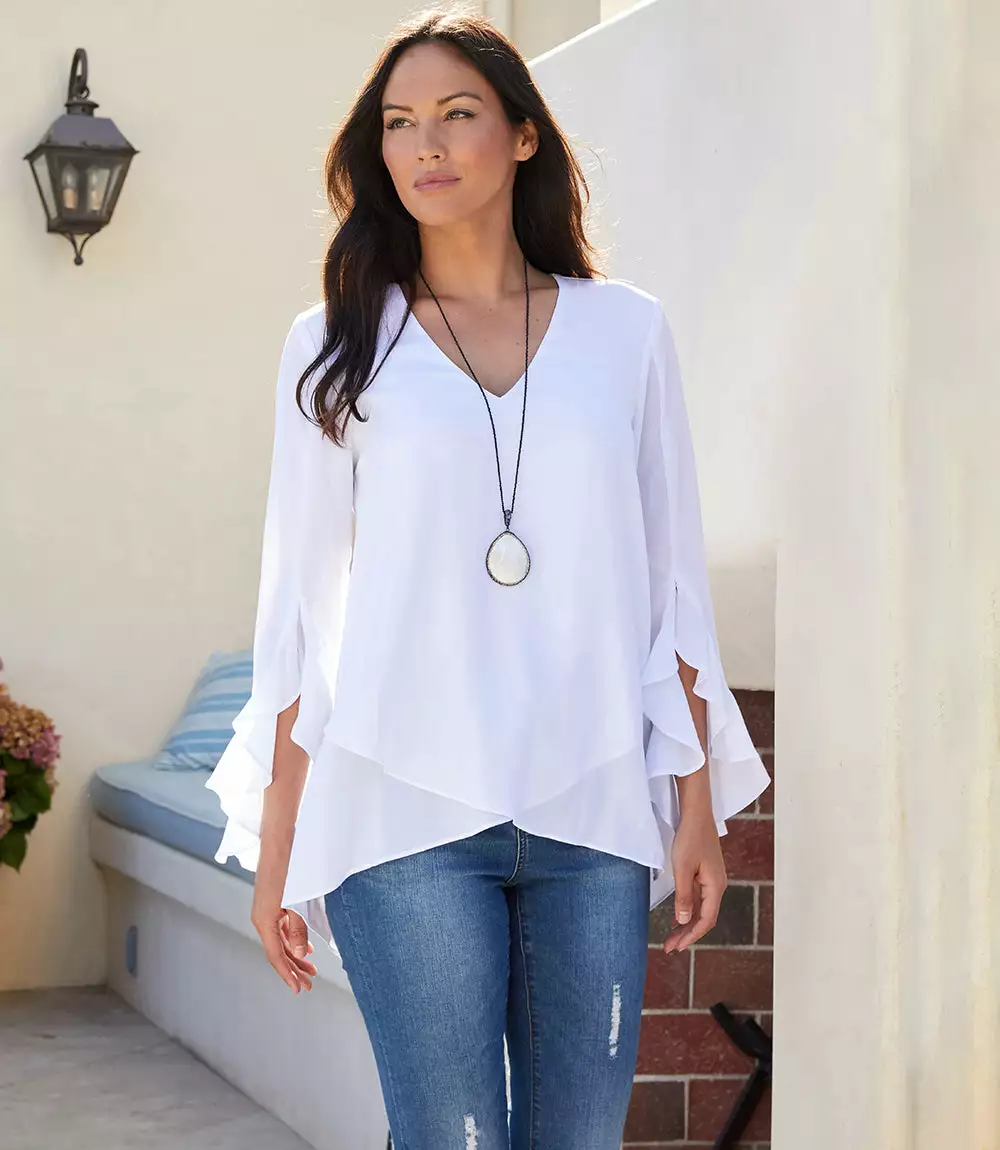 Flouncy ruffles decorate the sleeve of a silky crepe blouse styled with a crossover front panels that drape to a hi-lo hem.