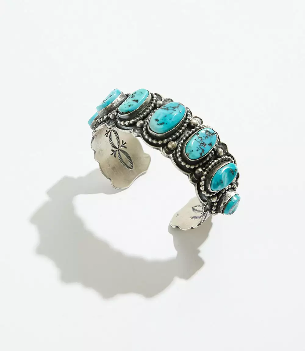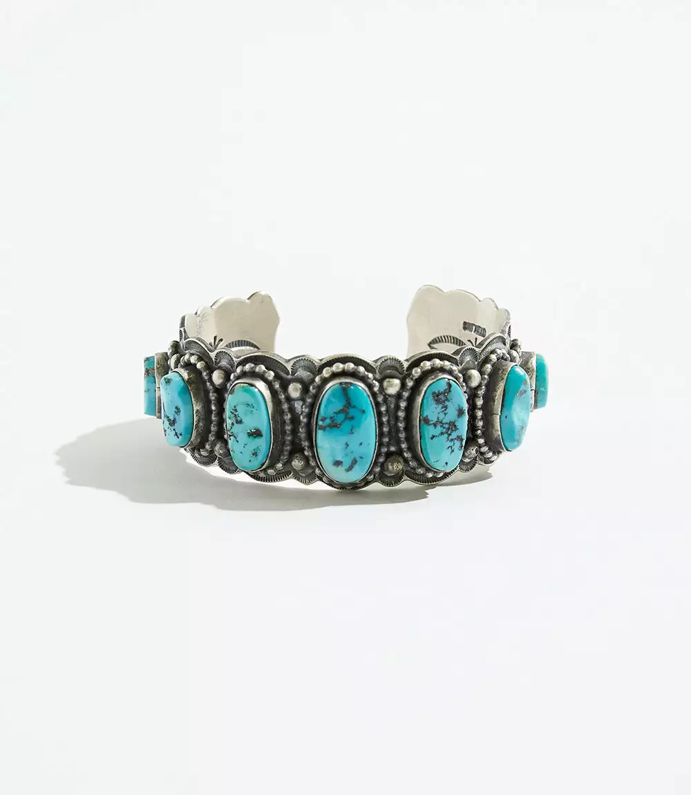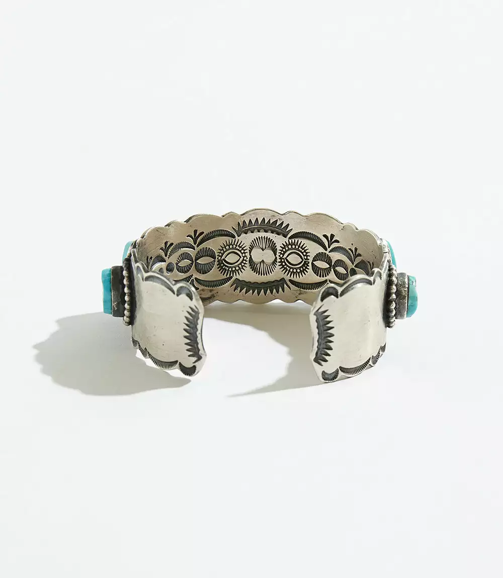 One-of-a-kind turquoise stones are encased in a sterling-silver cuff that is detailed with exquisite deep stampwork and silver droplets that decorate the edges.