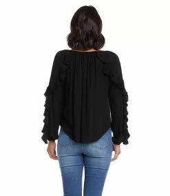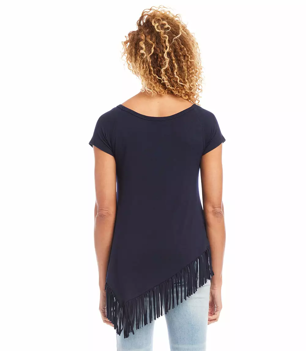 Swishy fringe details the hem of this super soft top cut from jersey-knit. This top can easily transition from desk to dinner with a simple switch of shoes and accessories.