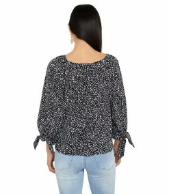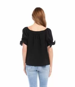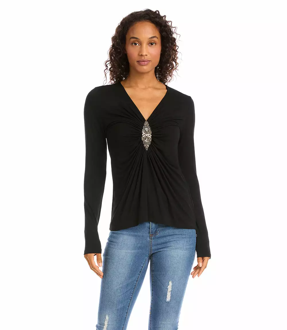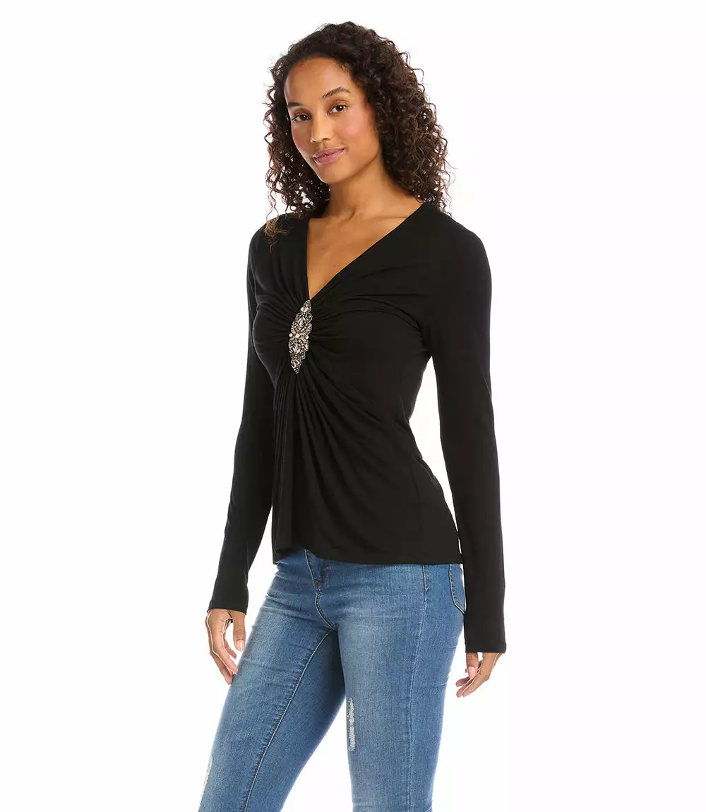 Romantic rippled ruching and a beaded applique define this jersey-knit top. This top is ideal for date nights or special events.