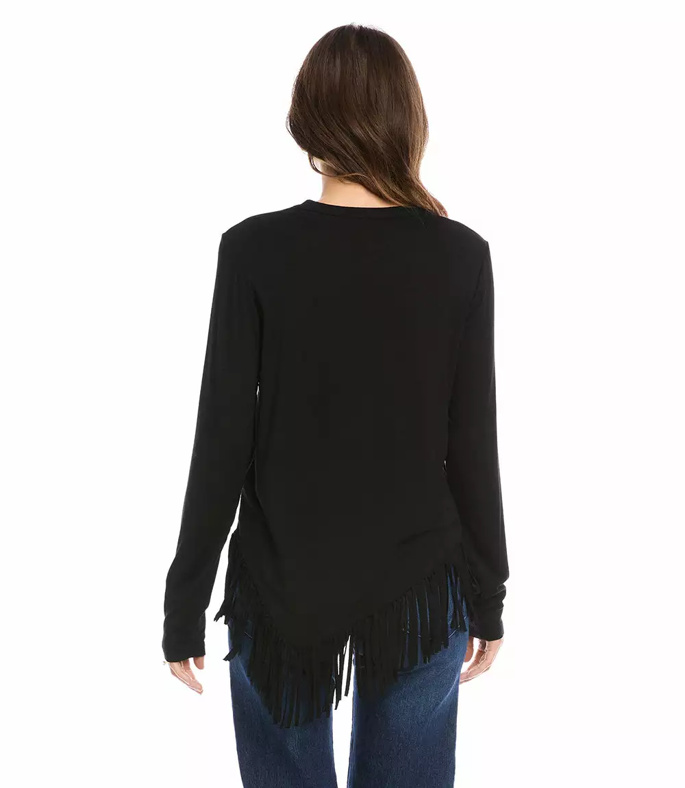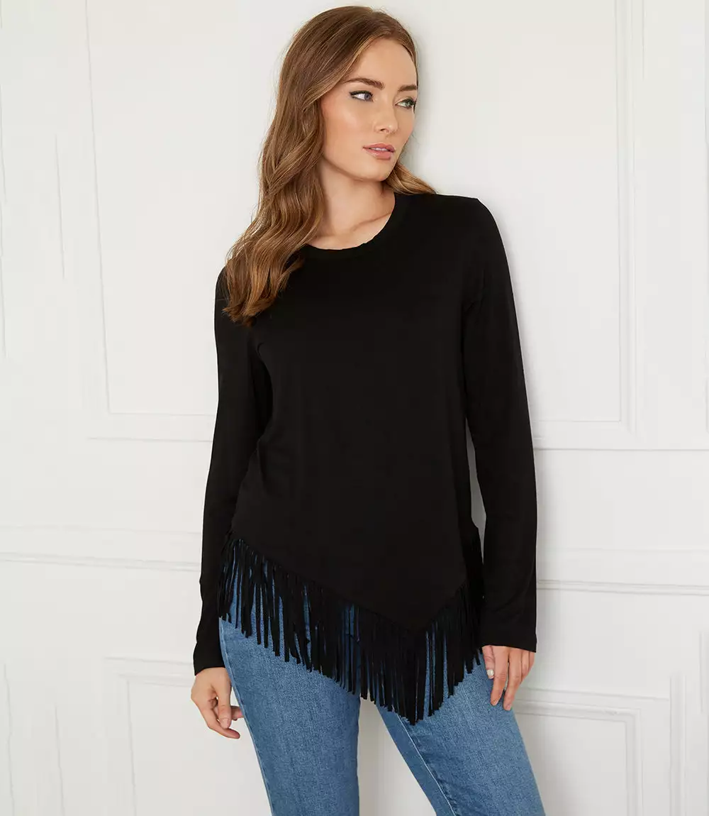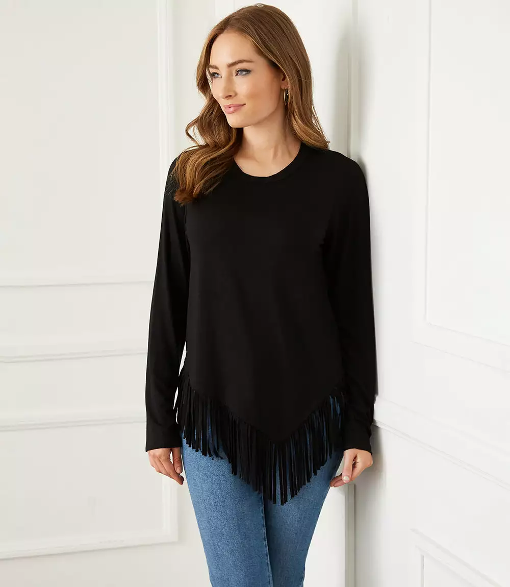 Swishy fringe details the hem of this super soft top cut from jersey-knit. This top can easily transition from desk to dinner with a simple switch of shoes and accessories.