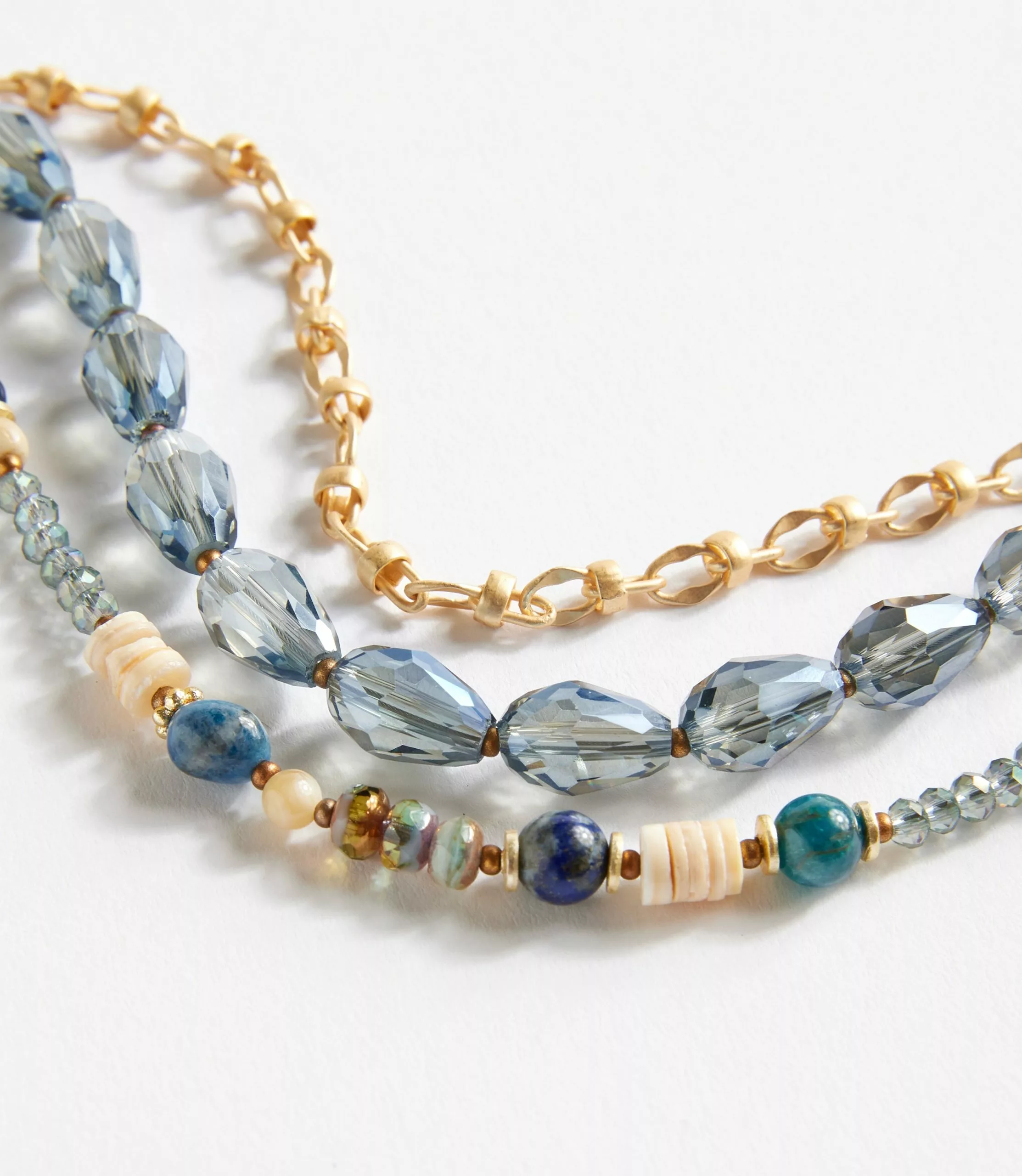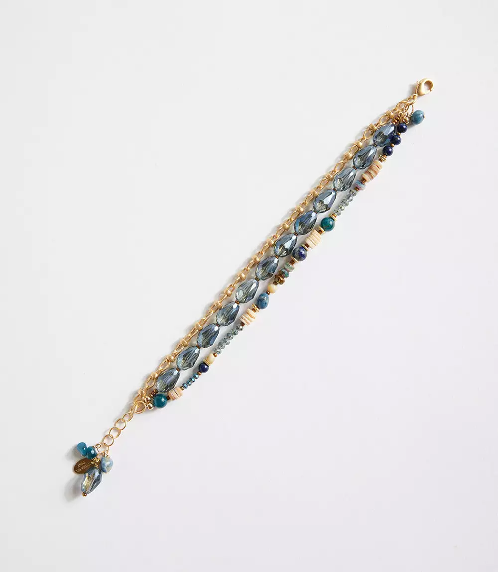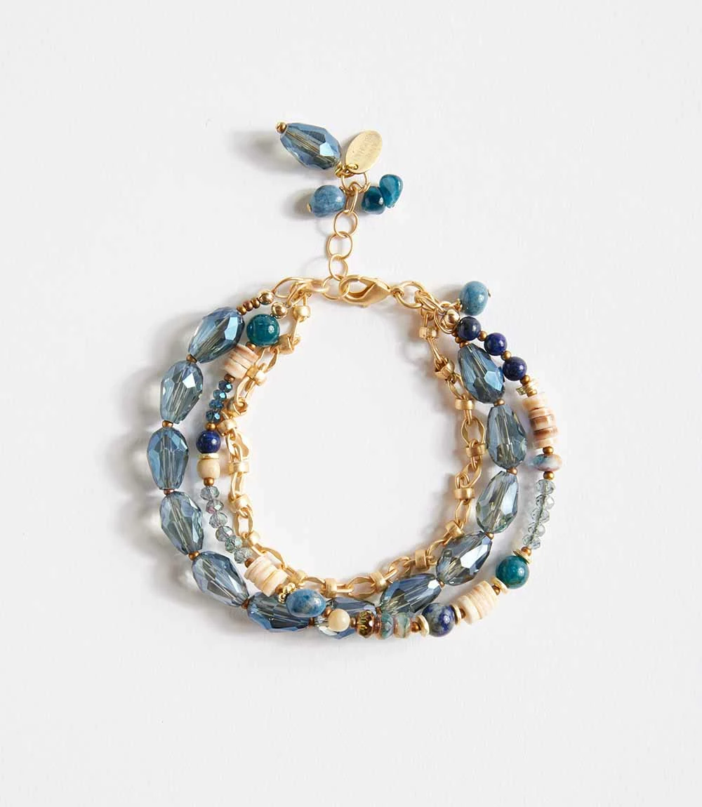 An easy way to create a stacked look, this multi-strand blue and gold bracelet is finished with gems in a variety of patterns and textures. Handcrafted with strands of lapis, apatite stones, blue crystal, and matte gold-plated brass. 7.5-9″ with an adjustable lobster claw clasp.