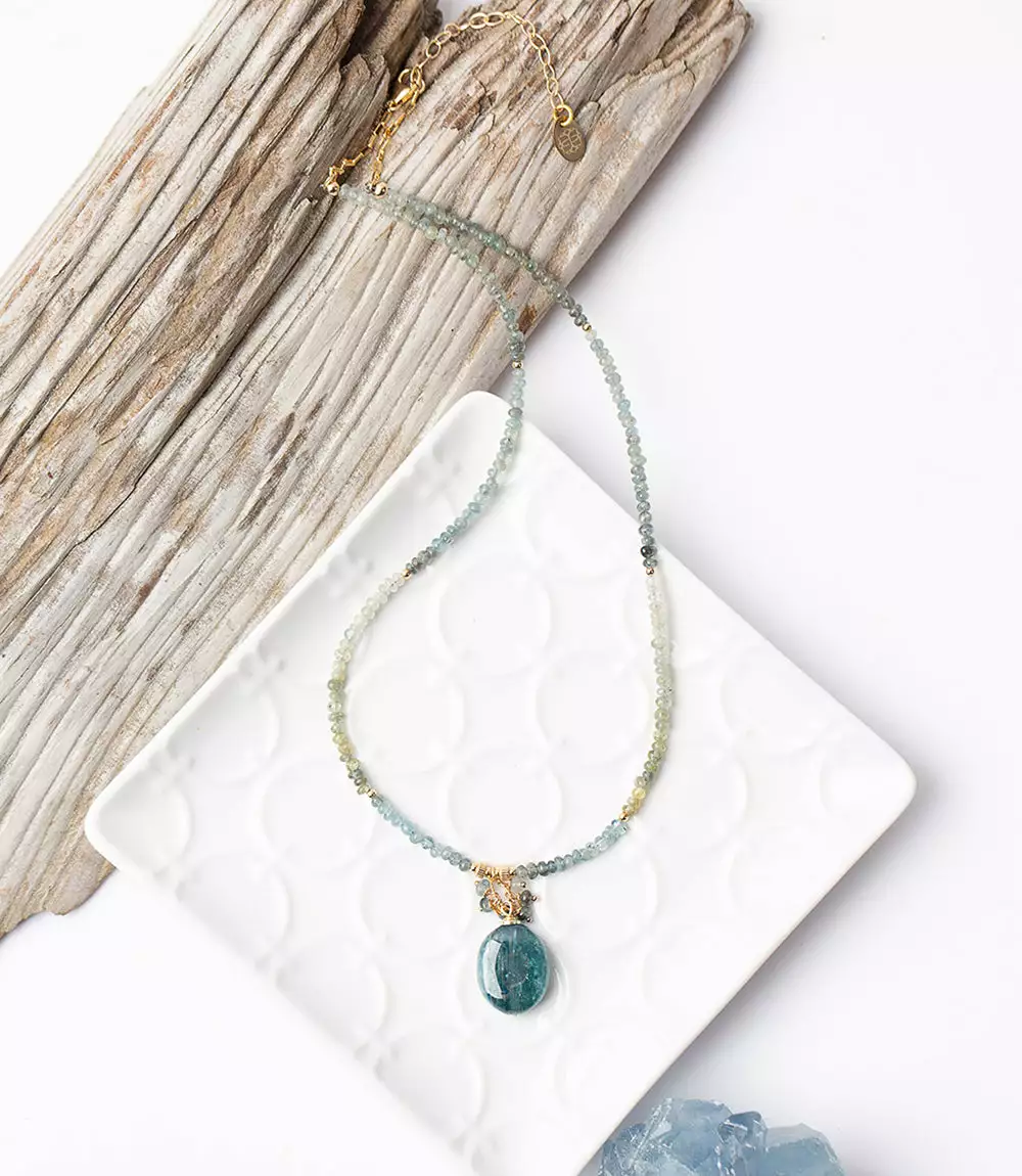 A handcrafted collage design is accented by a pop of kyanite on this handcrafted piece.