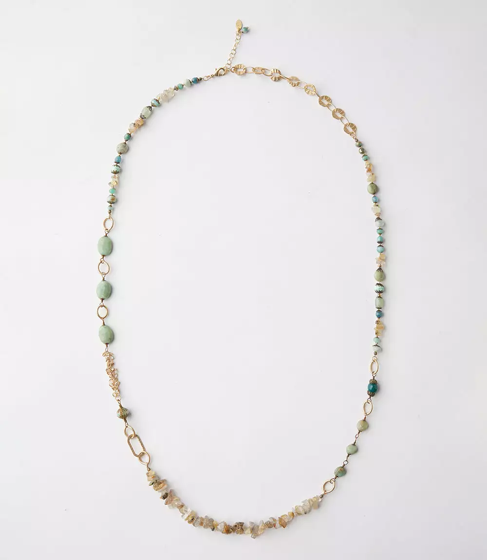 Made by hand in Virginia, this soothing necklace consists of an assortment of beautiful earth-toned crystals and gemstones. With its long length, it’s perfect to wear with other pieces for a multi-layered look, or by wrapping it and achieving a layered look all by itself.