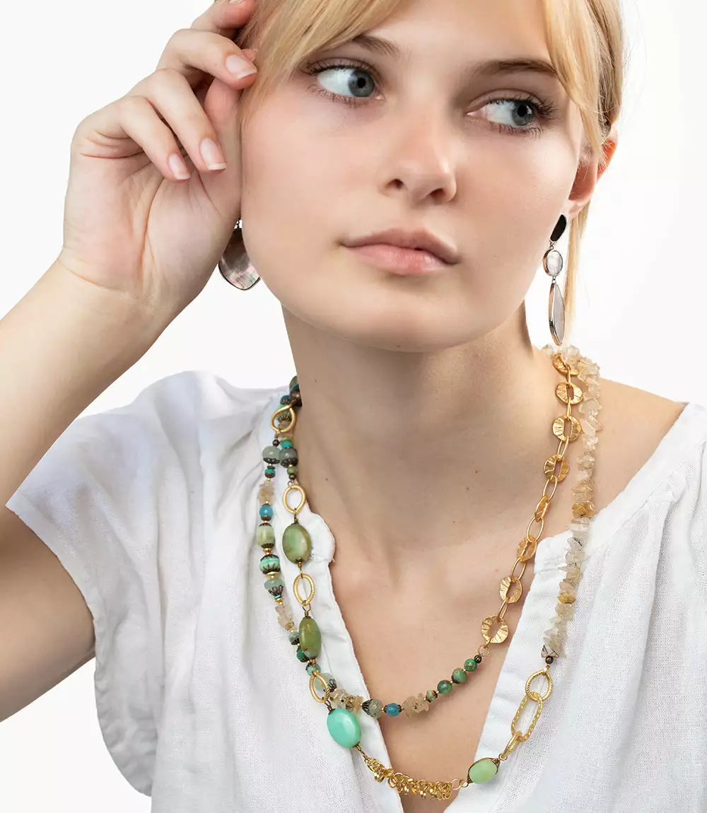 - Made of natural chrysophase, apatite, gold rutilated quartz and matte gold-plated brass