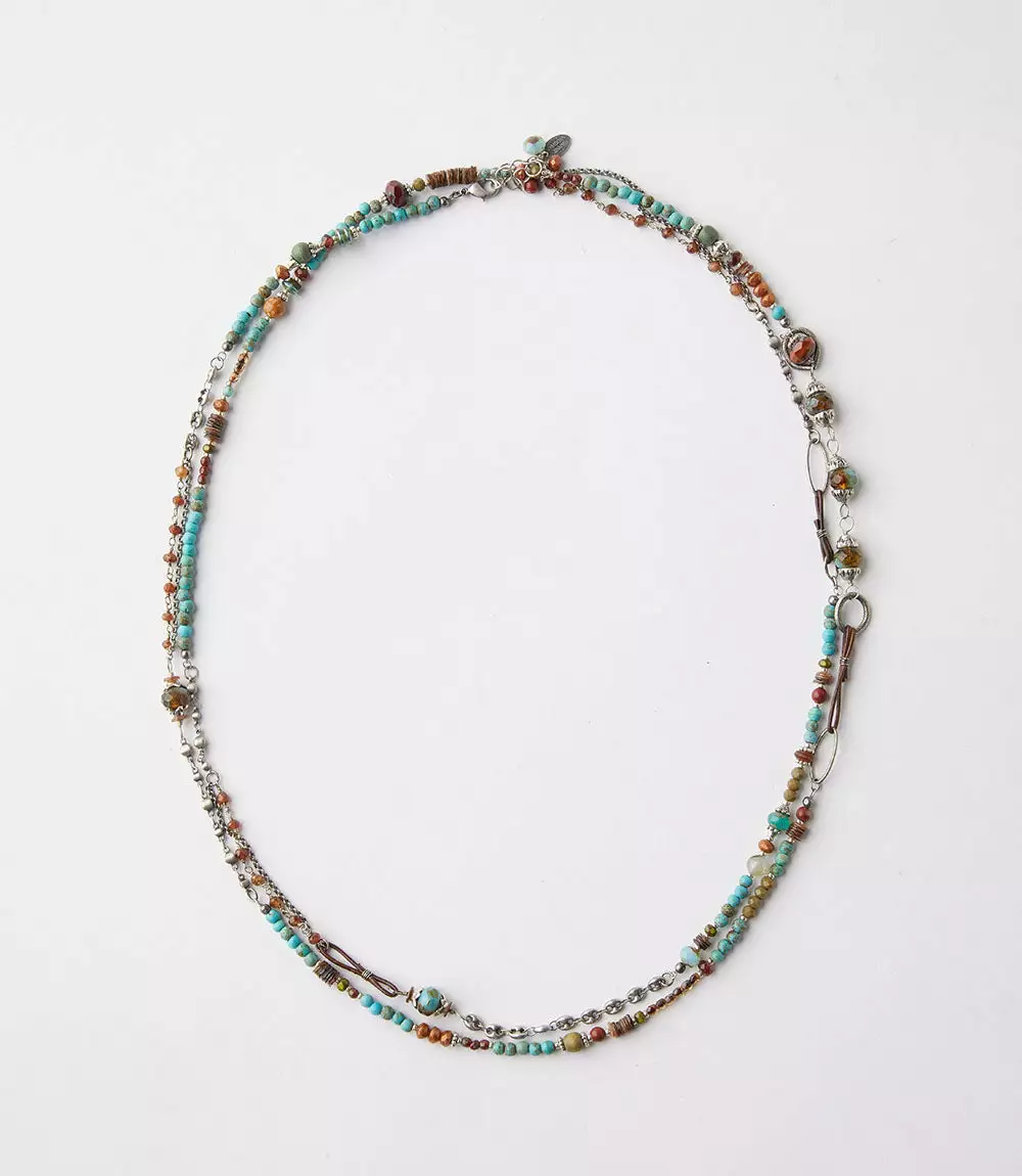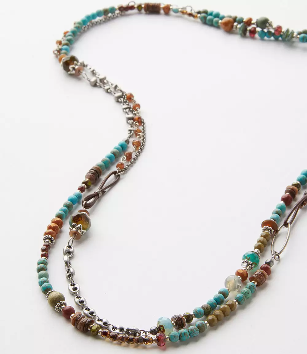 This handcrafted necklace consists of two silver-plated chains that have been detailed with a beautiful assortment of natural gemstones and glass beads. It’s a perfect layering piece that can easily accent any look.