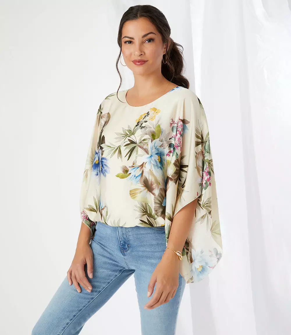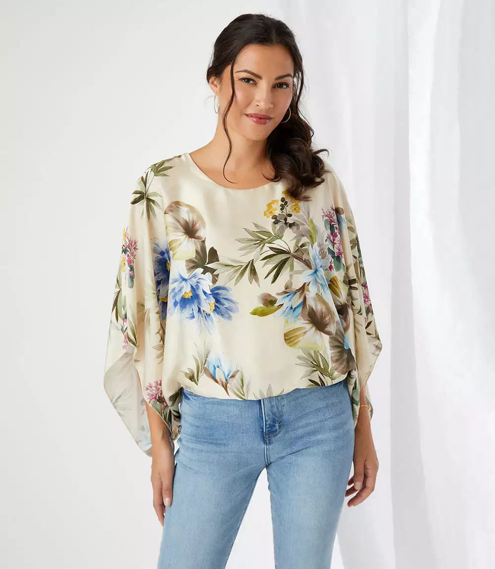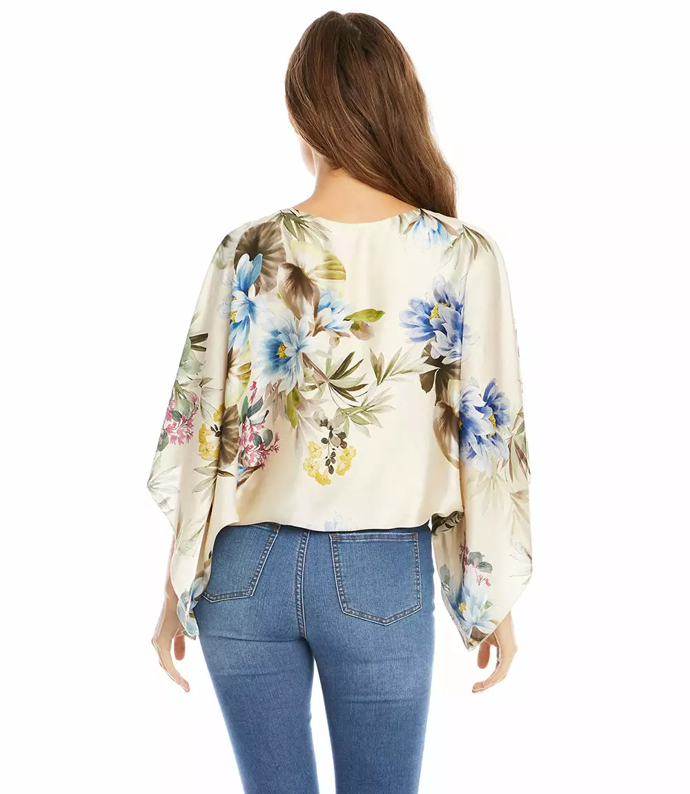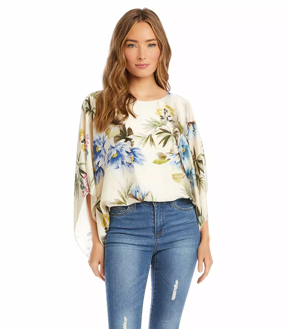 Designed to set a romantic tone, this painterly floral print top features a flattering silhouette with an elastic bottom and built in jersey knit lining.