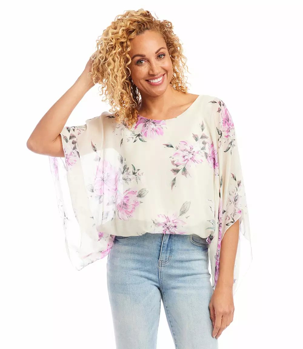Fluttering scarf sleeves frame this flowery blouse crafted in a drapey silhouette.