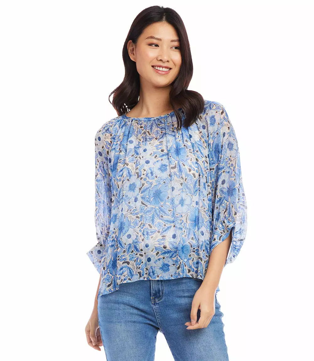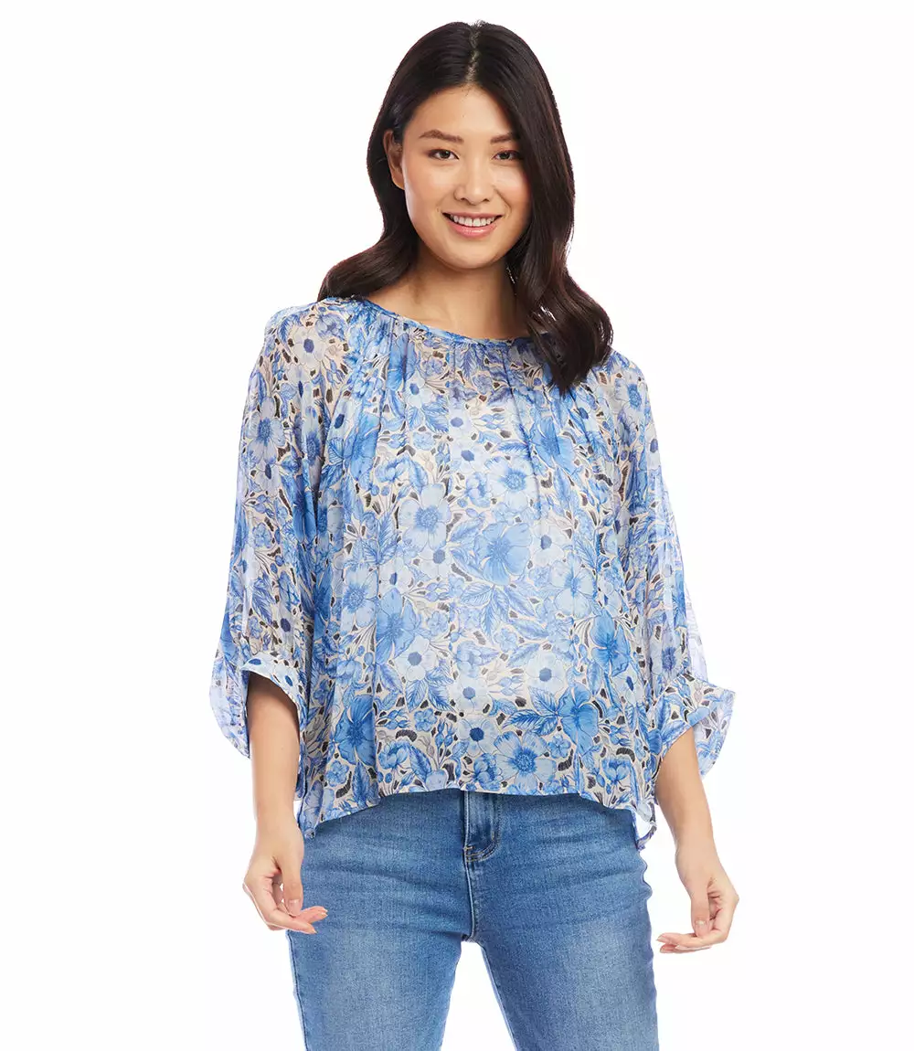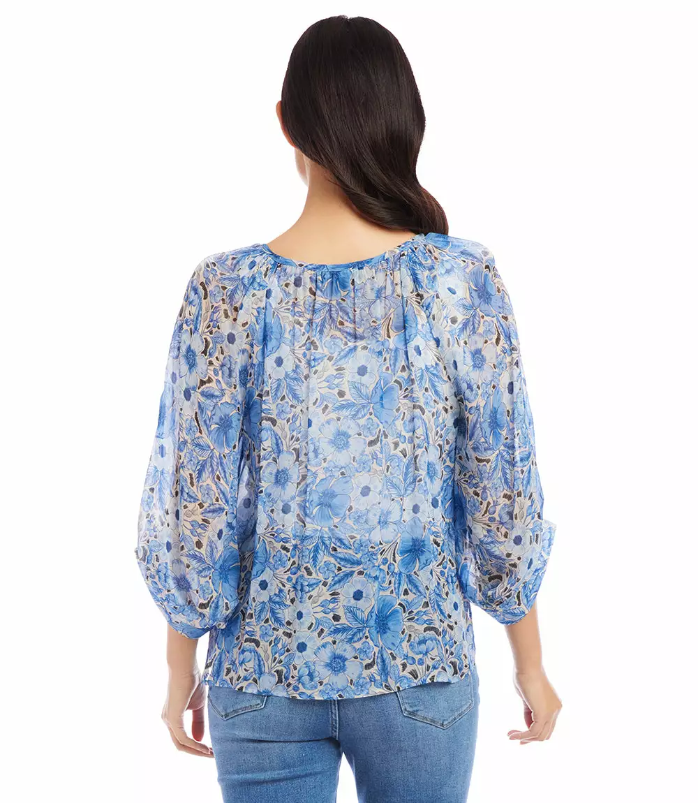Billowy blouson sleeves add a feminine flourish to this watercolor floral print top. This top pairs perfectly with your favorite denim or linen shorts.