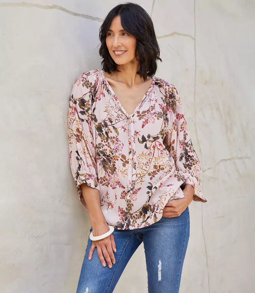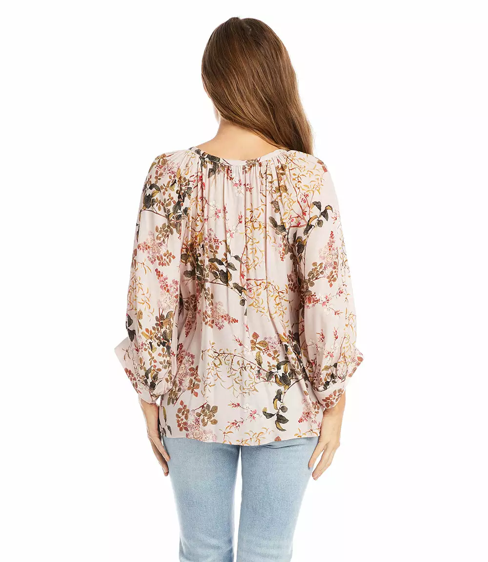 Designed to set a romantic tone, top features a retro floral print in soft shades of pink and olive. This comfortable blouse features billowy blouson sleeves and stylish ties at the neckline.