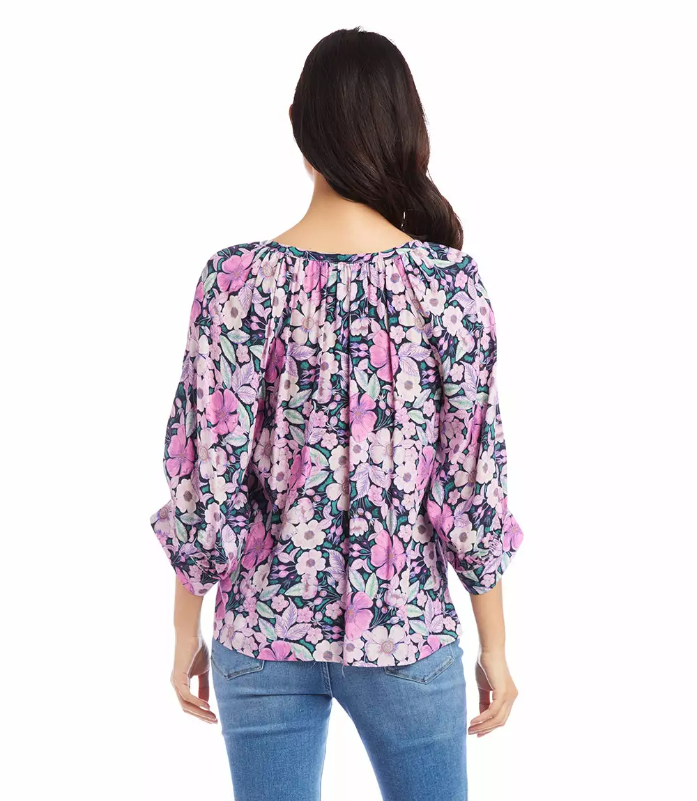 Designed with drapey ties at the neck, billowy blouson sleeves add a feminine flourish to this crepe constructed top.
