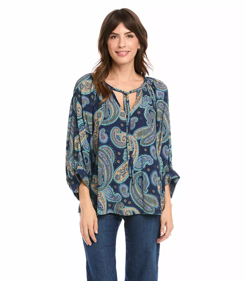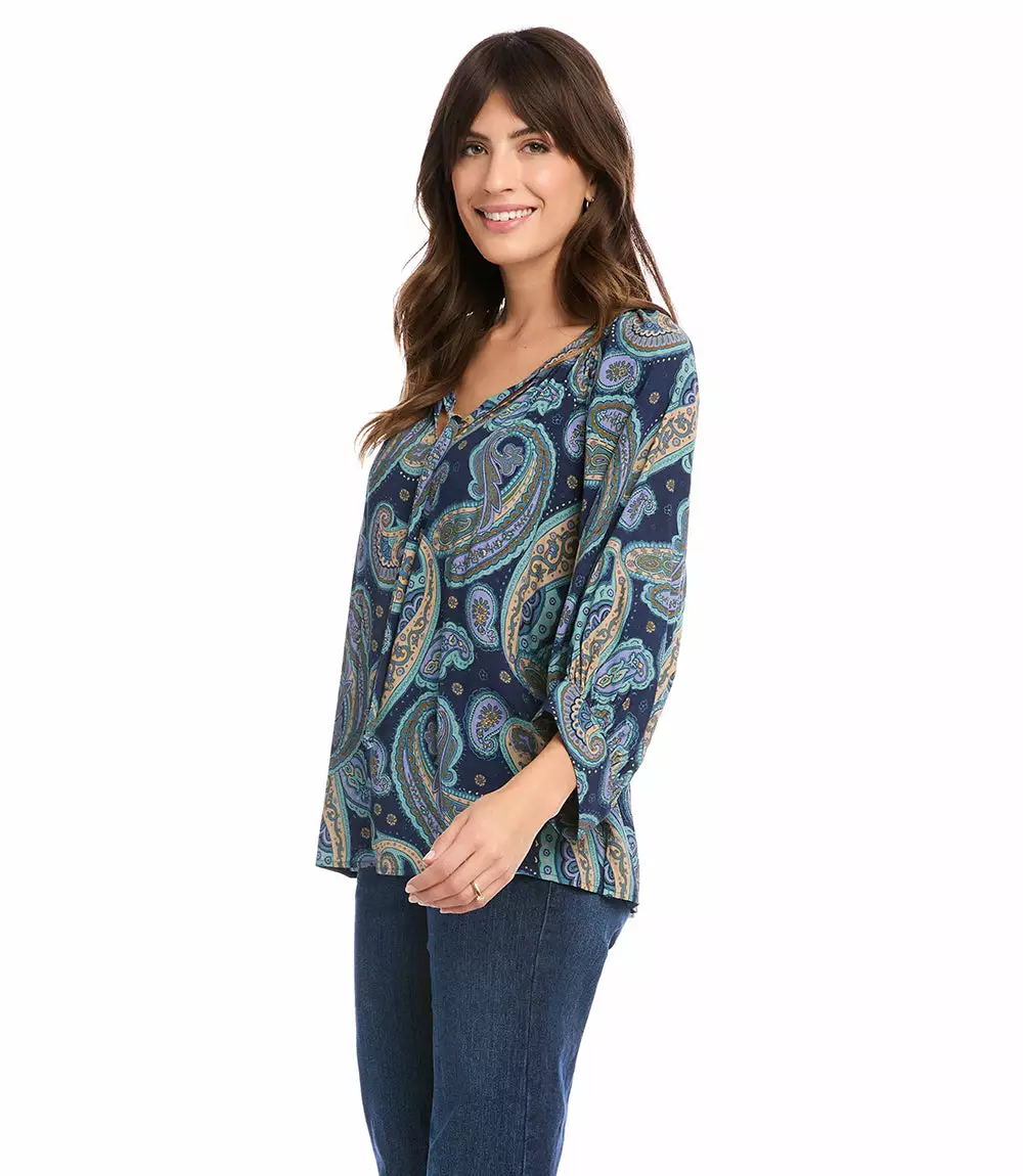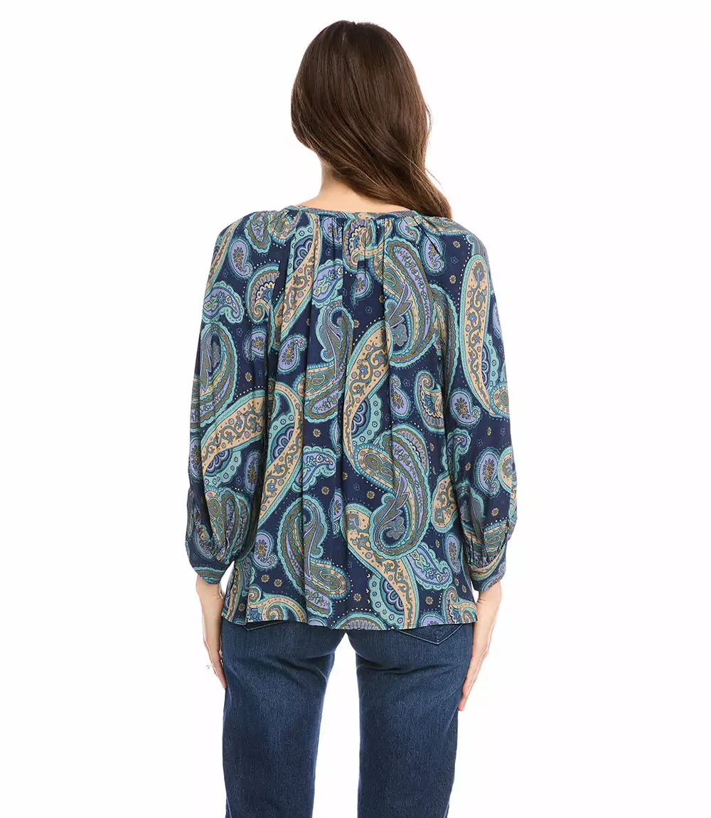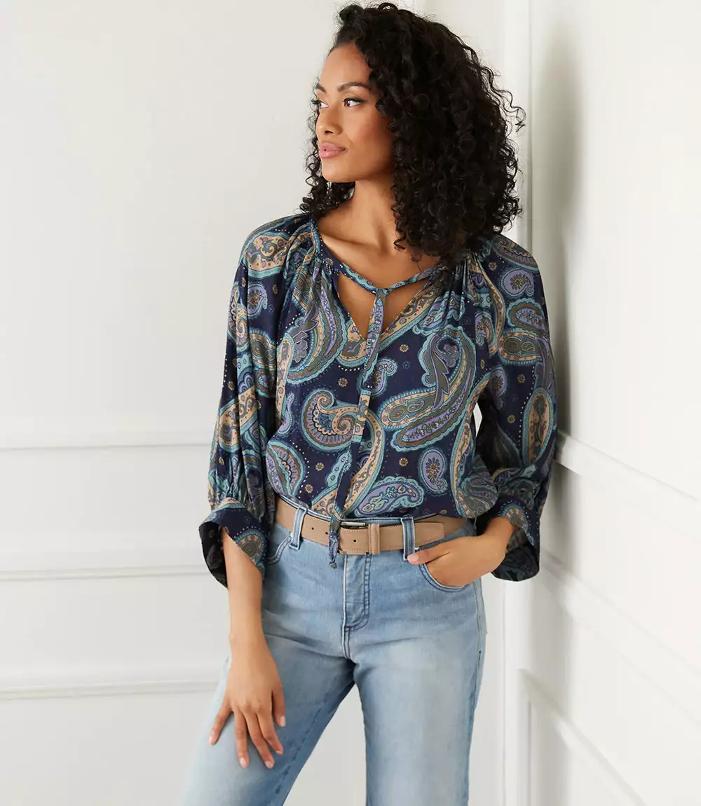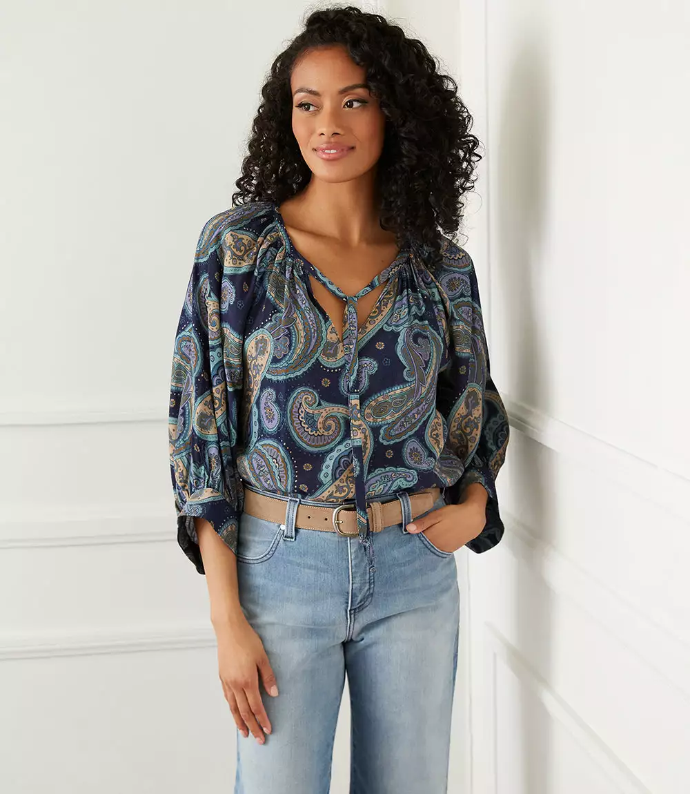 A bohemian-infused paisley print distinguishes this crepe top detailed with billowy blouson sleeves.