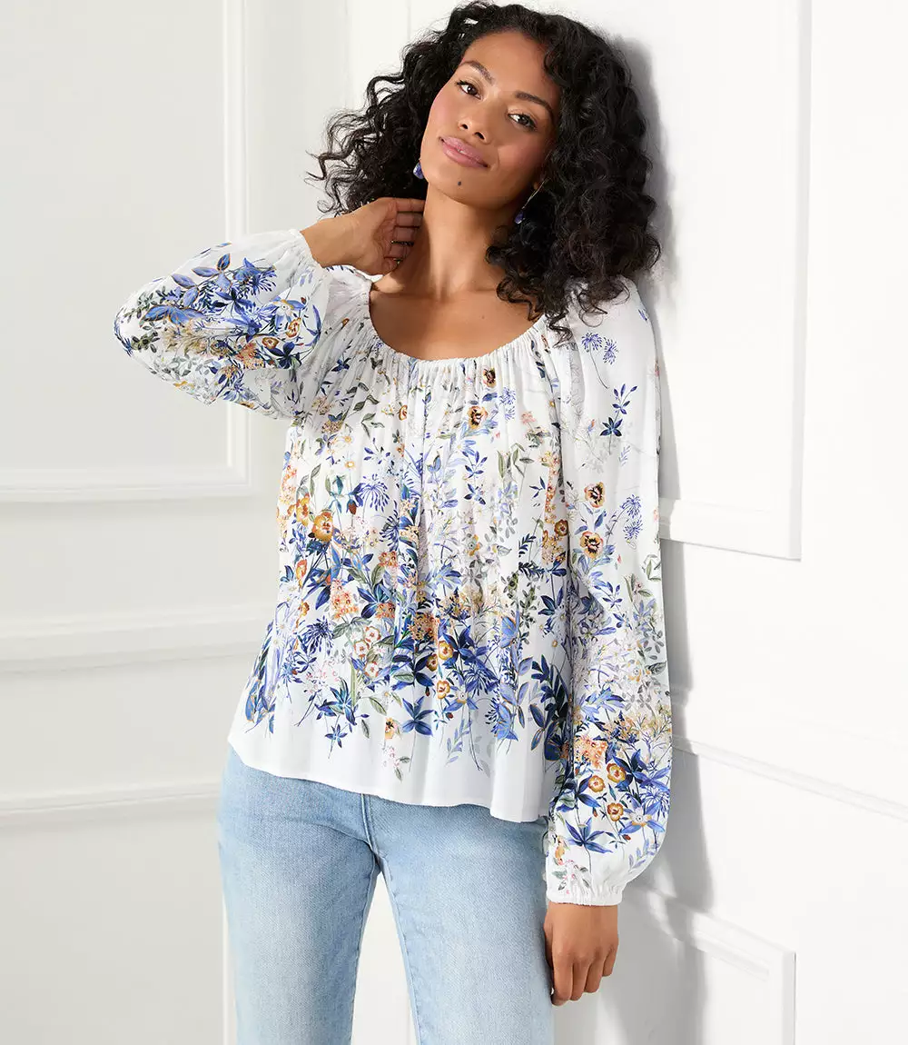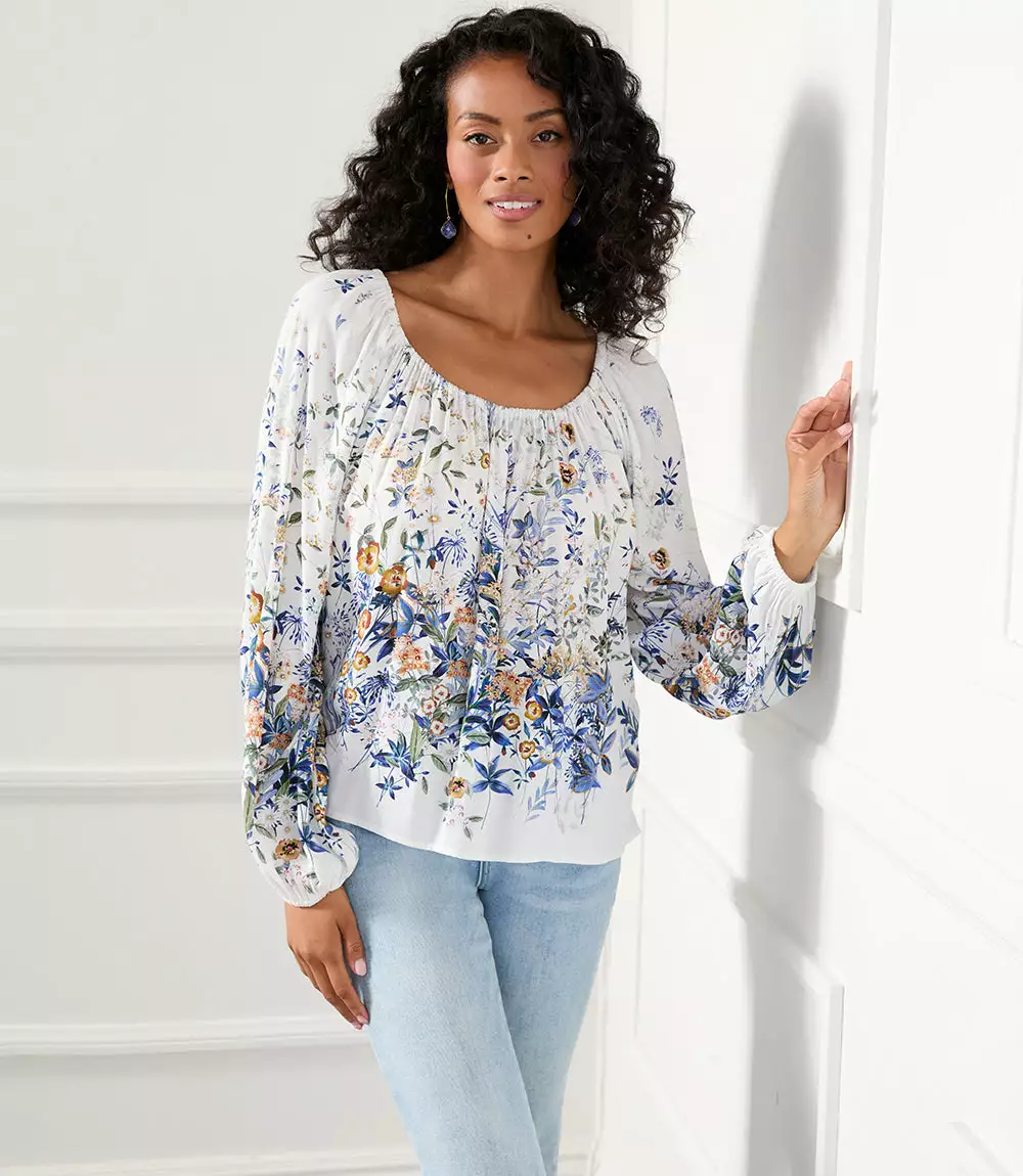 Lush wild florals shape this swingy crepe top detailed with billowy blouson sleeves. The beautiful pattern is uniquely designed and expertly lined up to provide a flattering look.