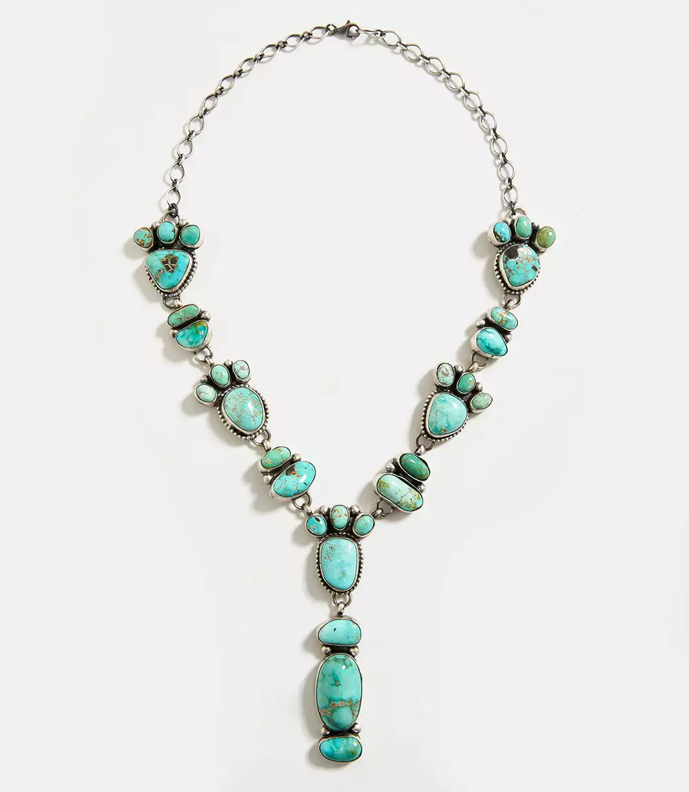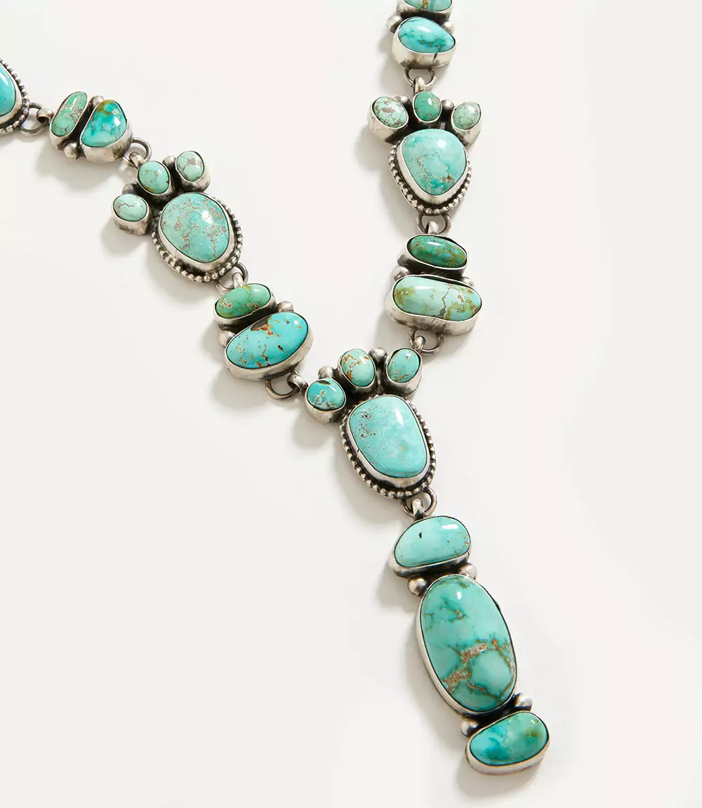 This stunning necklace is made of an assortment of earthy-toned turquoise stones that are encased in a sterling-silver setting.