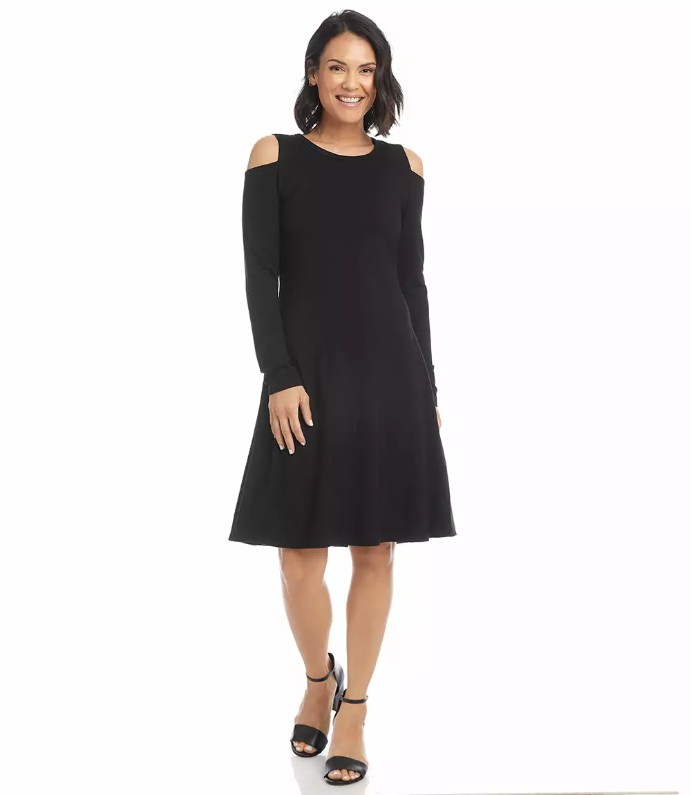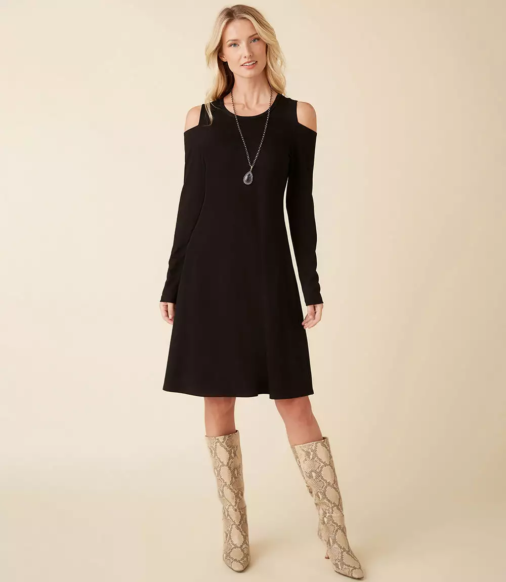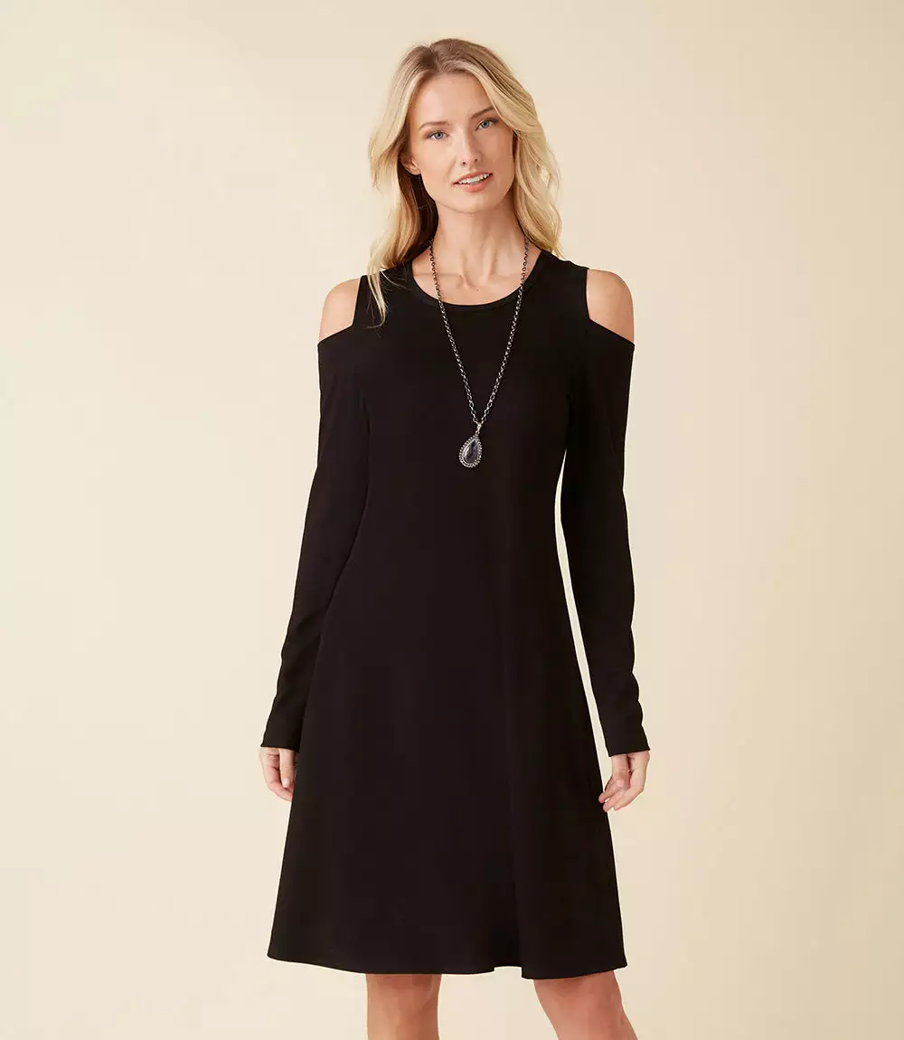 Cold-shoulder cutouts and a flattering a-line silhouette add unique detail to this comfortable dress cut from fluid stretch jersey.
