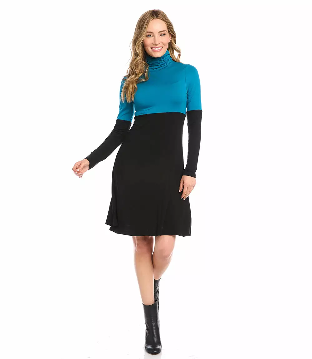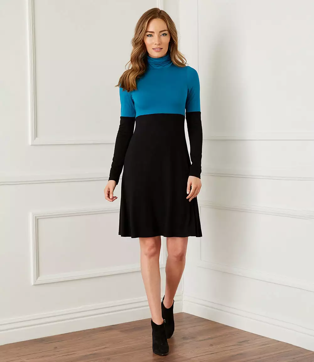 A great piece for transitioning into cooler temperatures, on trend color blocked long sleeves and turtleneck ensure warmth and comfort. Fashioned in soft and cozy jersey, this dress is timeless and makes for a sophisticated office to evening look.