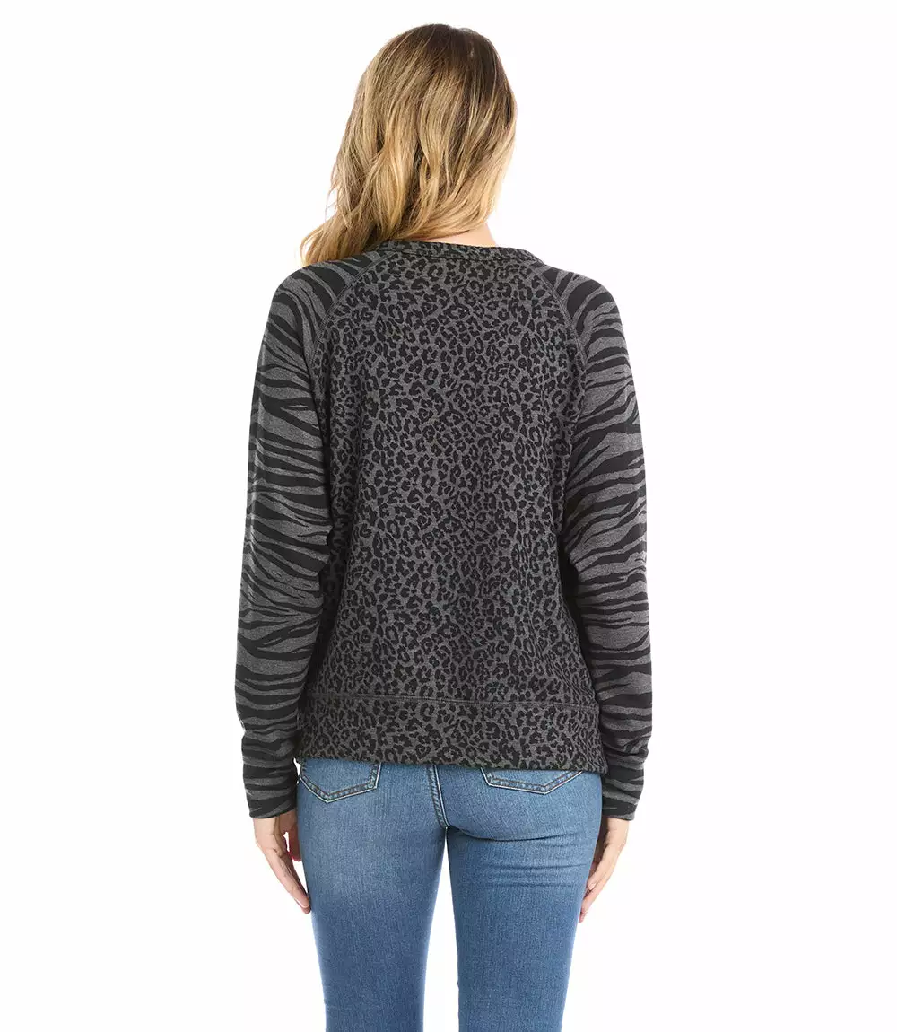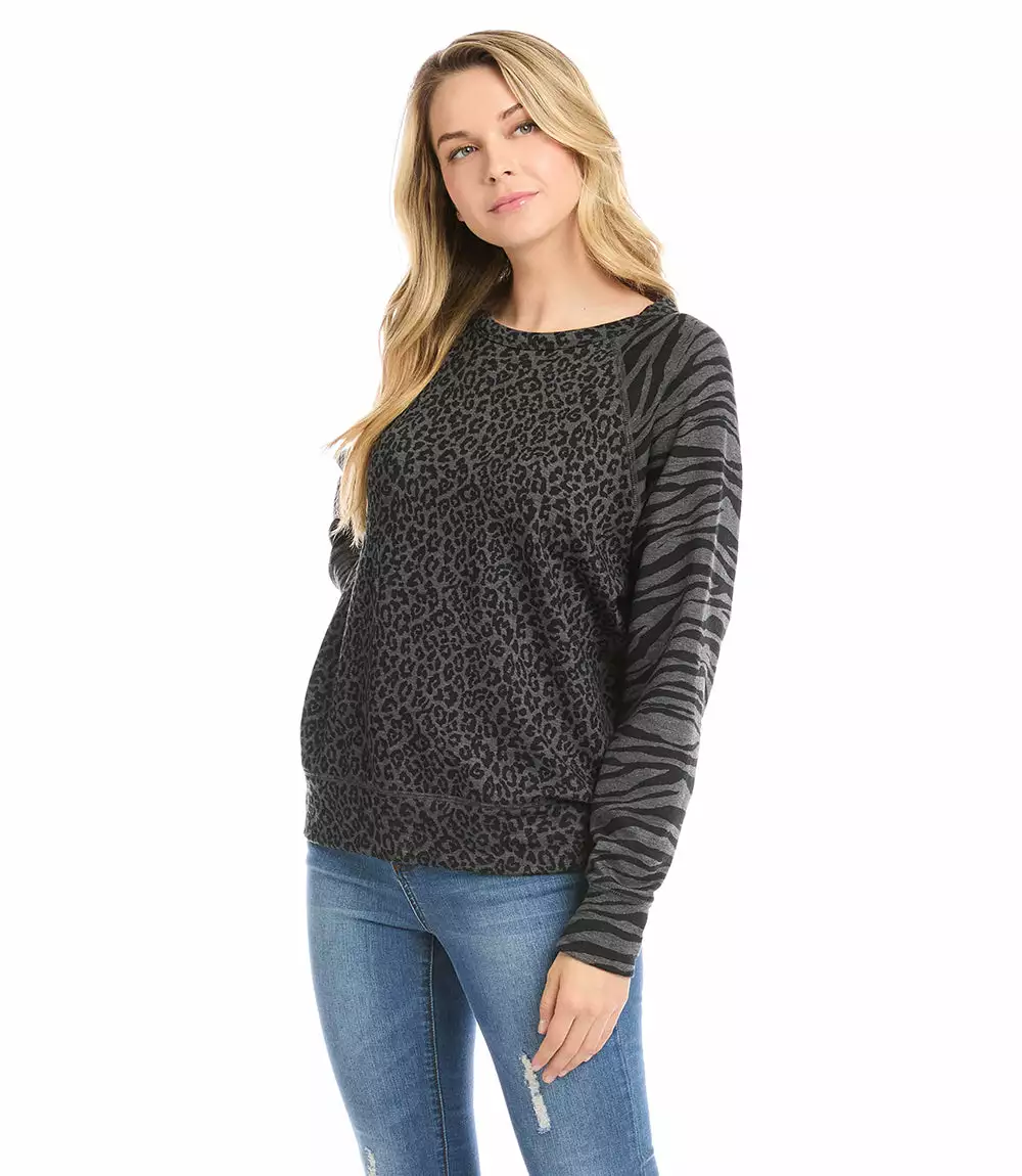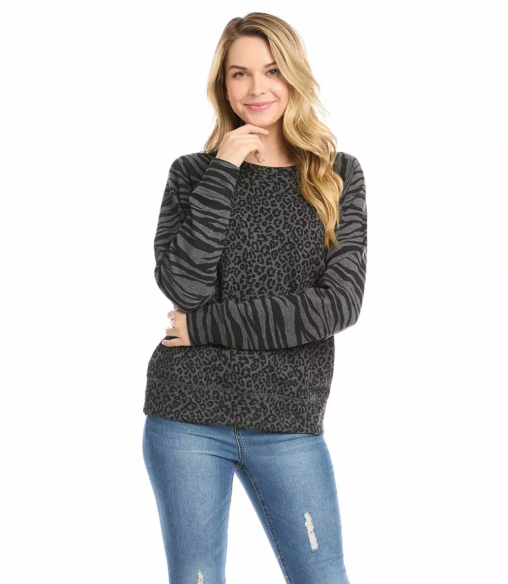 Indulge in the buttery-softness of this fleece pullover detailed with a contrasting animal print.