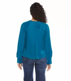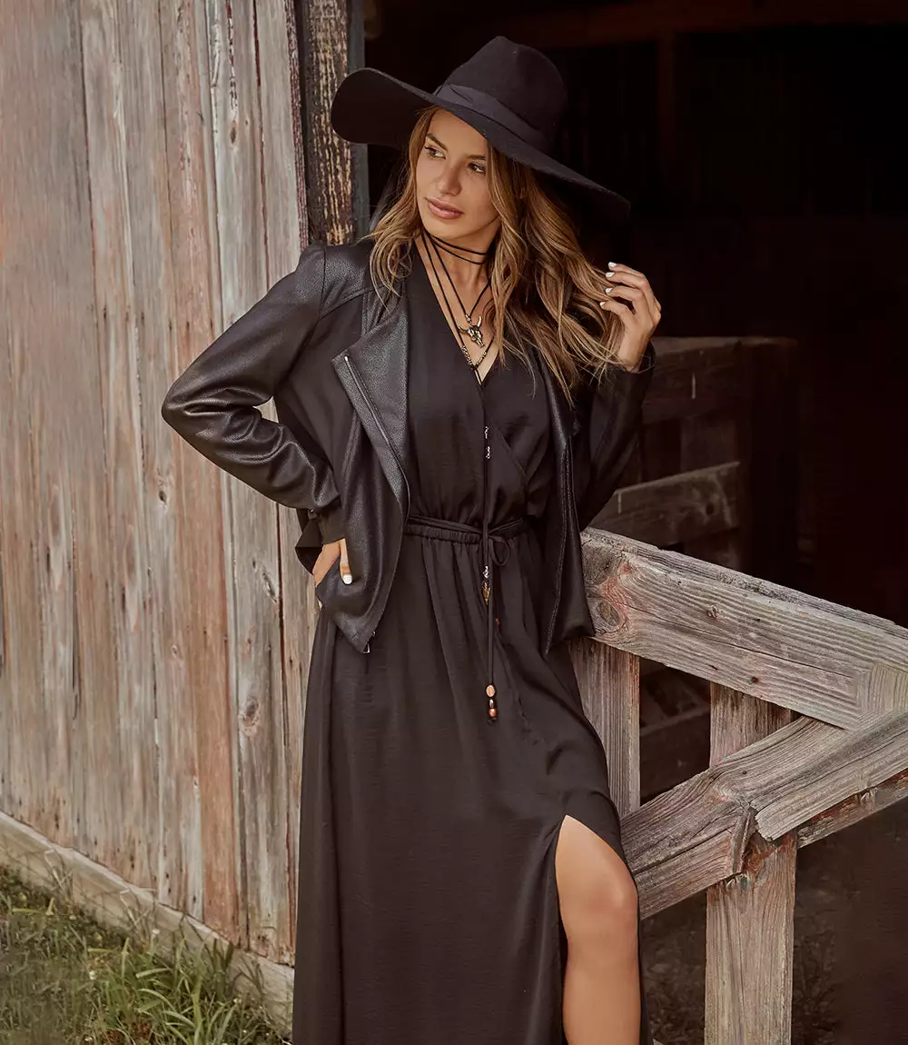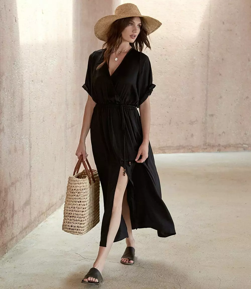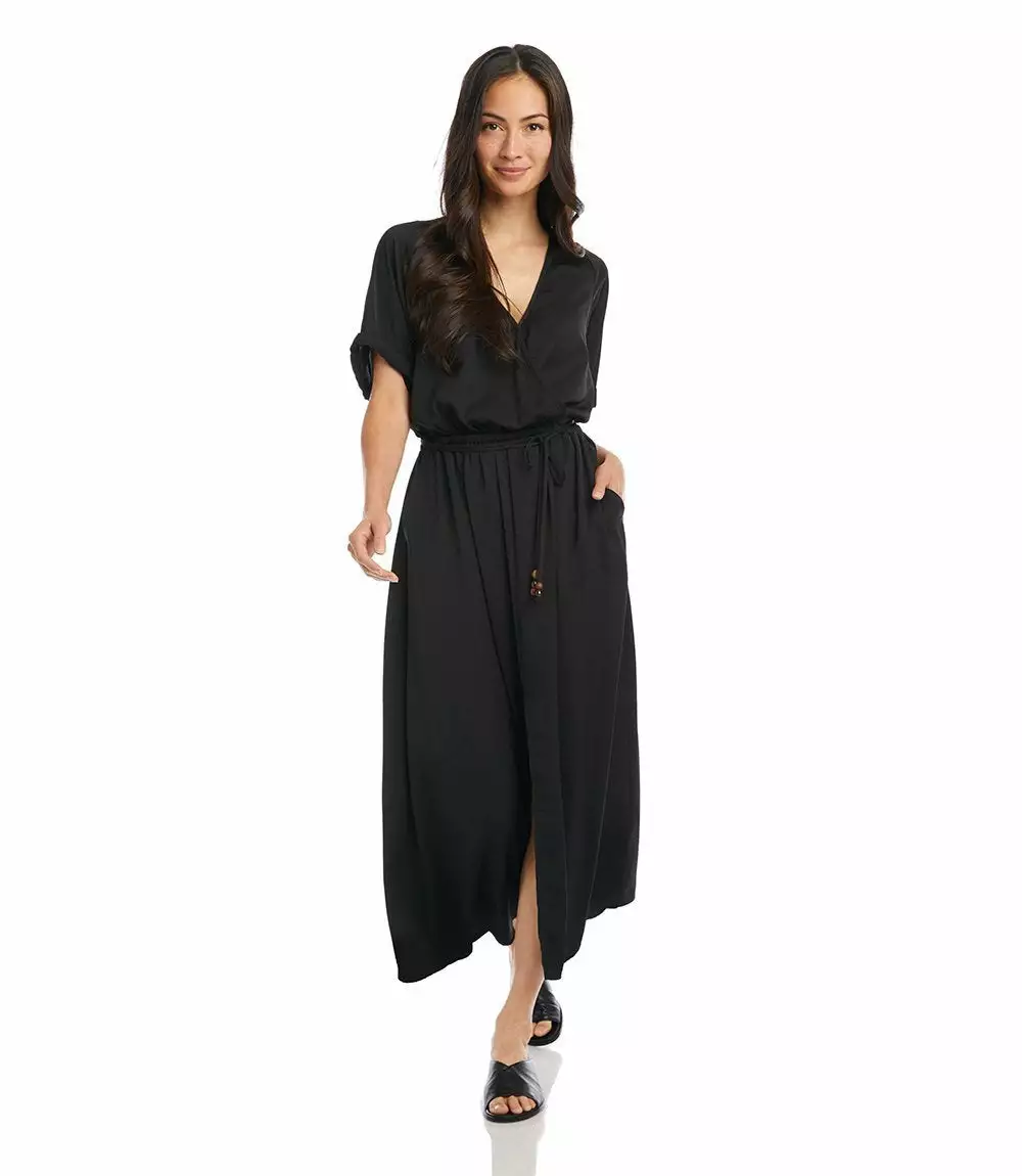 Indulgently smooth, this breezy dress features extended roll sleeves and a front-slit hem. Cinched at the waist for a uniquely tailored look. Belted tie includes wood and resin tiger’s eye beads.