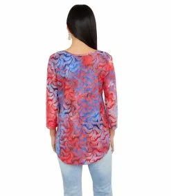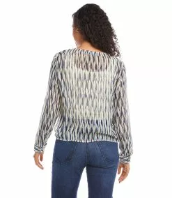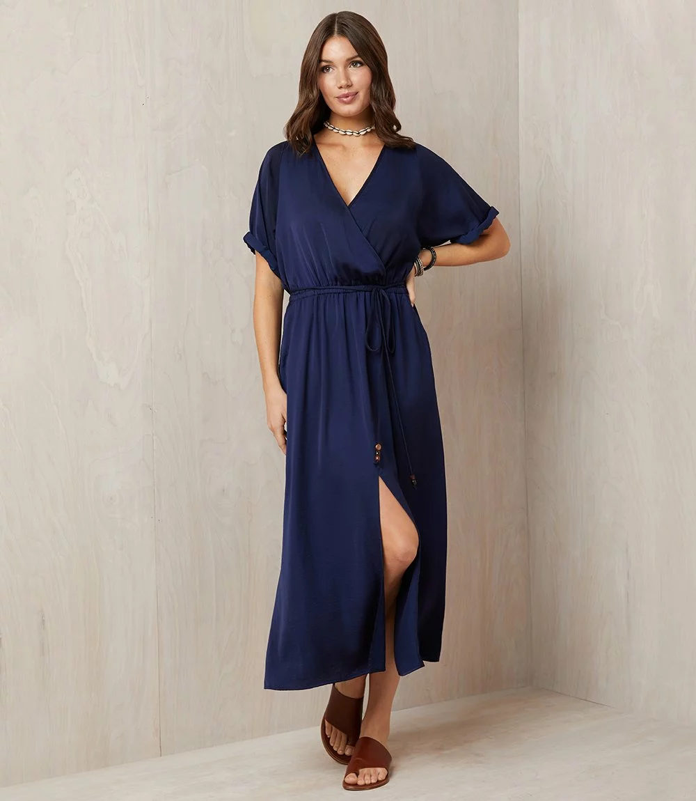 Indulgently smooth, this breezy dress features extended roll sleeves and a front-slit hem. Cinched at the waist for a uniquely tailored look. Belted tie includes wood and resin tiger’s eye beads.