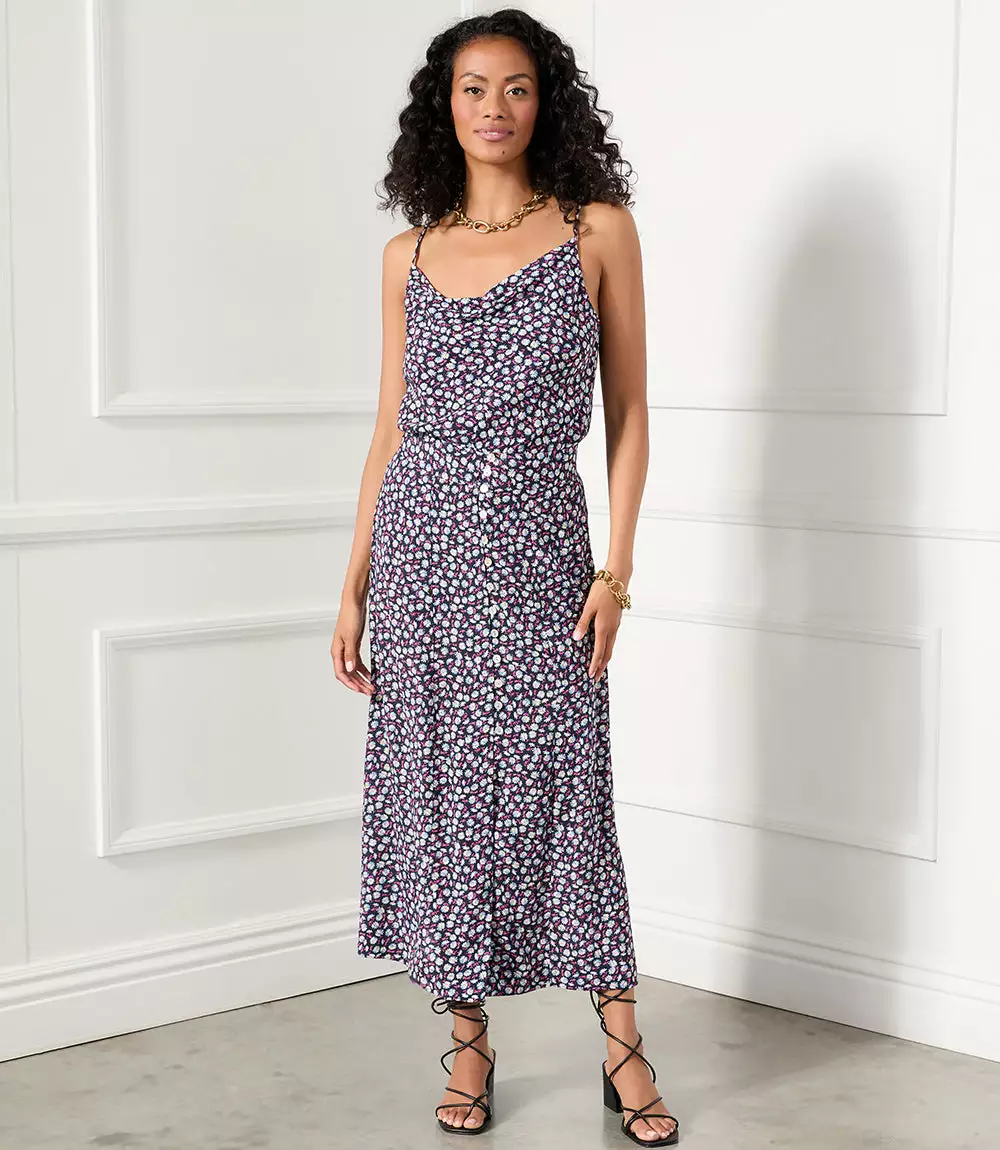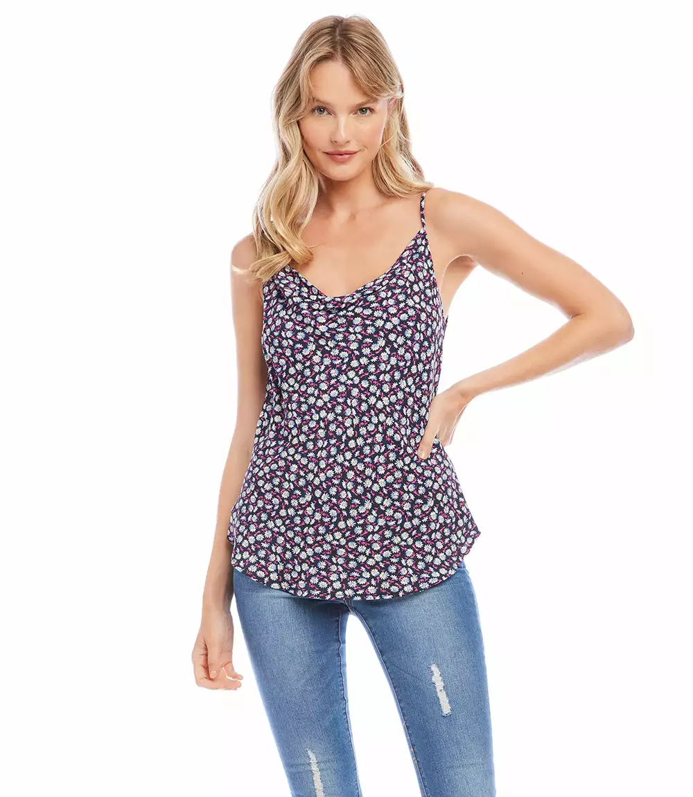 A delicate cowl neckline defines this lush floral print cami cut from crepe fabric. This top lends a dose of sophistication to your weekend look.