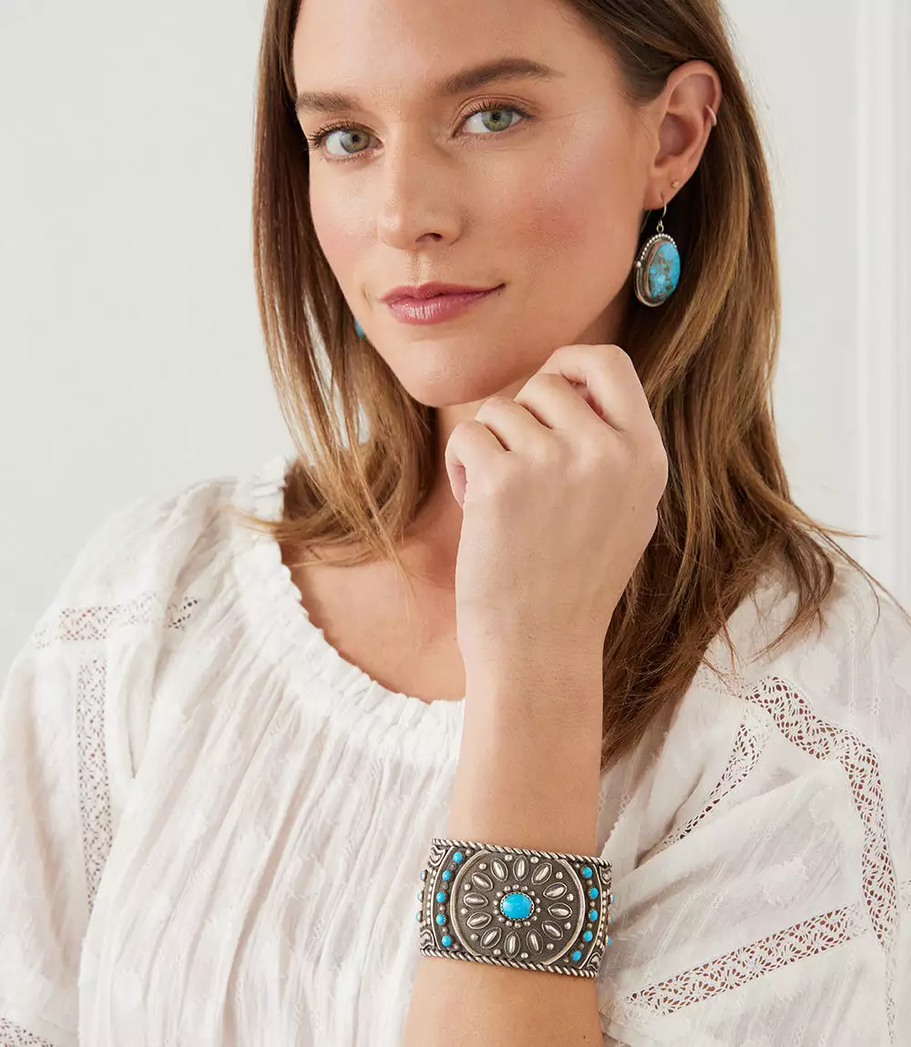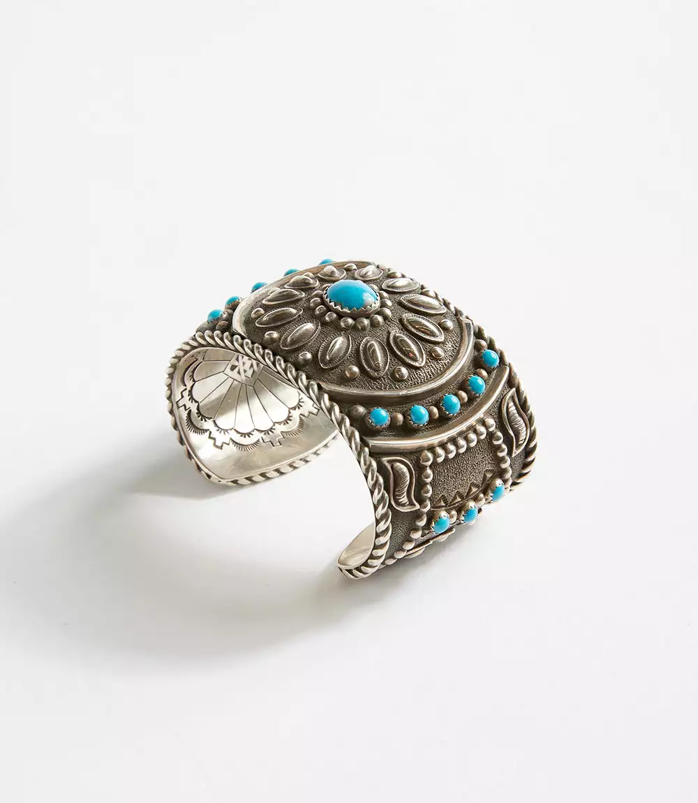 Shannon and Roberta Lee Tahe come from a family full of talented silversmiths. Their style is a little different, and this bracelet is like none we have seen before. A combination of bright blue Kingman turquoise, shiny cutouts, textured background and one wide design make this a one-of-a-kind creation. Plus, when you turn this piece over you will find the inside just as fancy as the top, nothing has gone untouched. Everything about this piece is impressive and is going to give you a piece of authentic Navajo silver and stone to wear for generations. Signed by the original Navajo artists. Only one available.