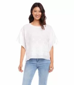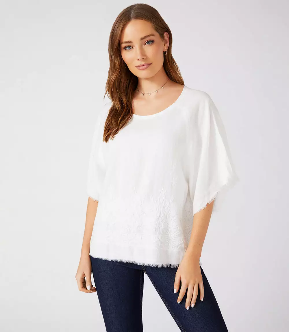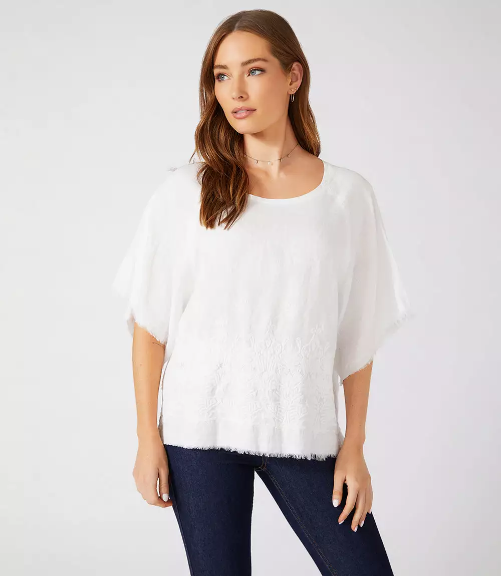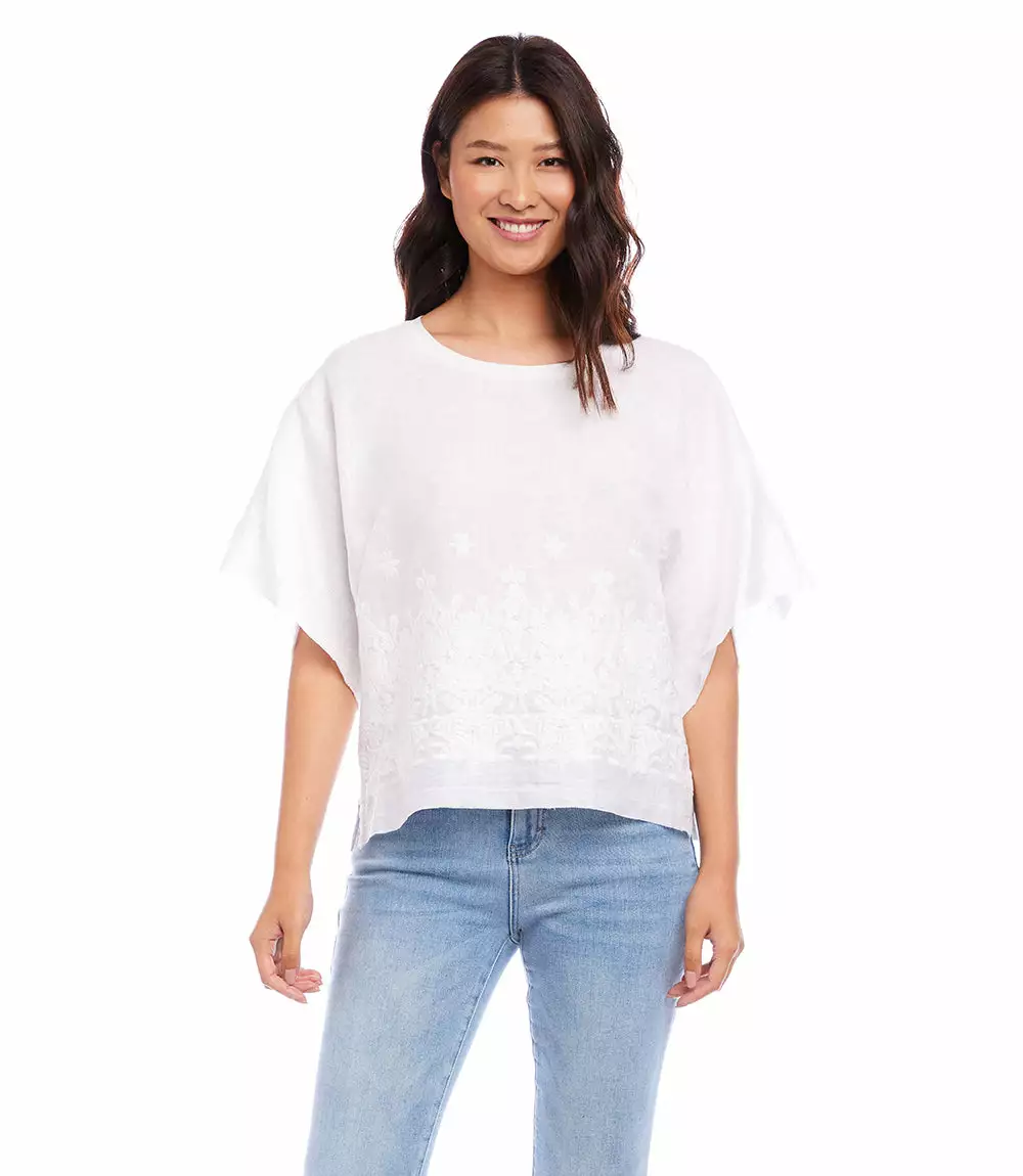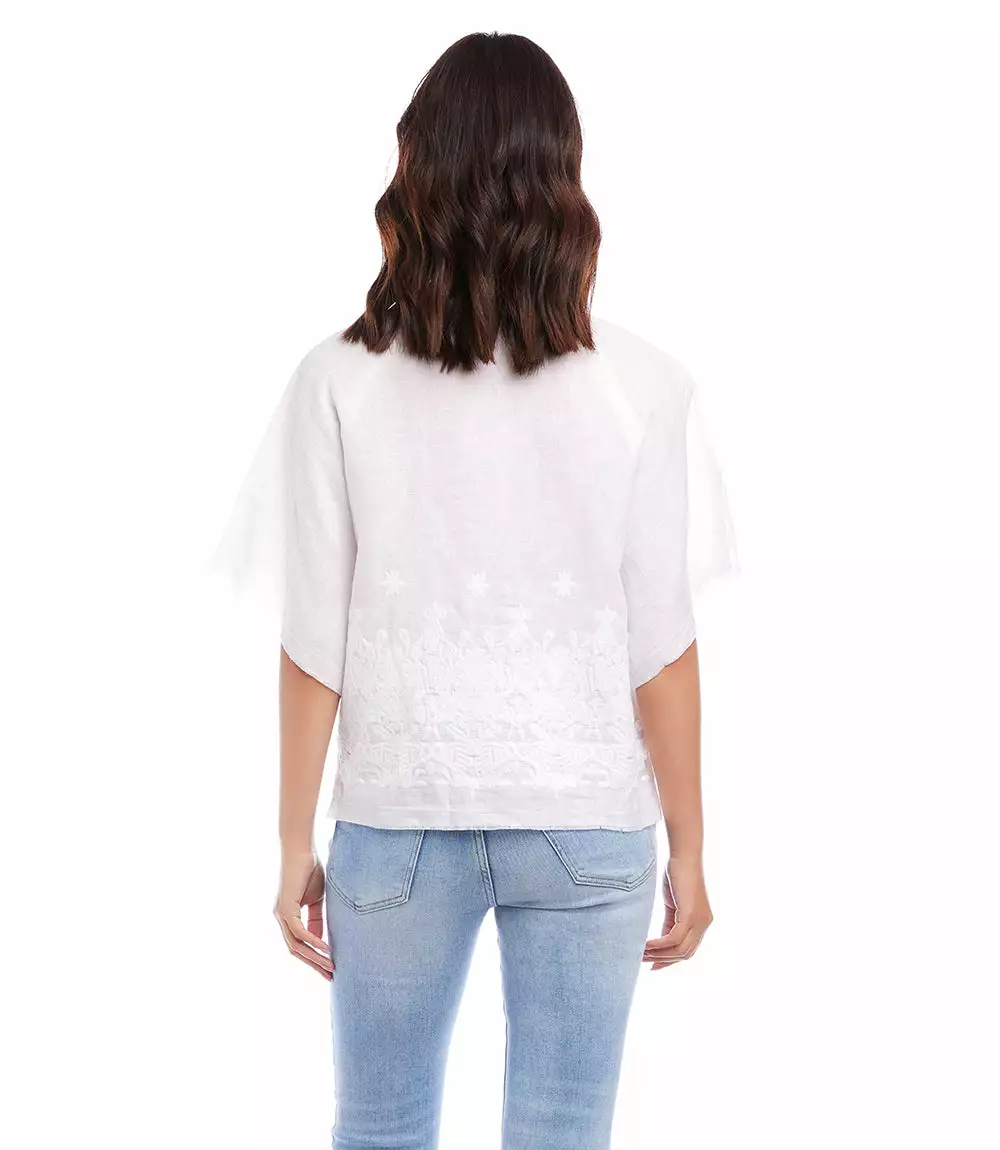 Designed to set a romantic tone, this breezy linen top features a delicate lace inset for an airy finish.