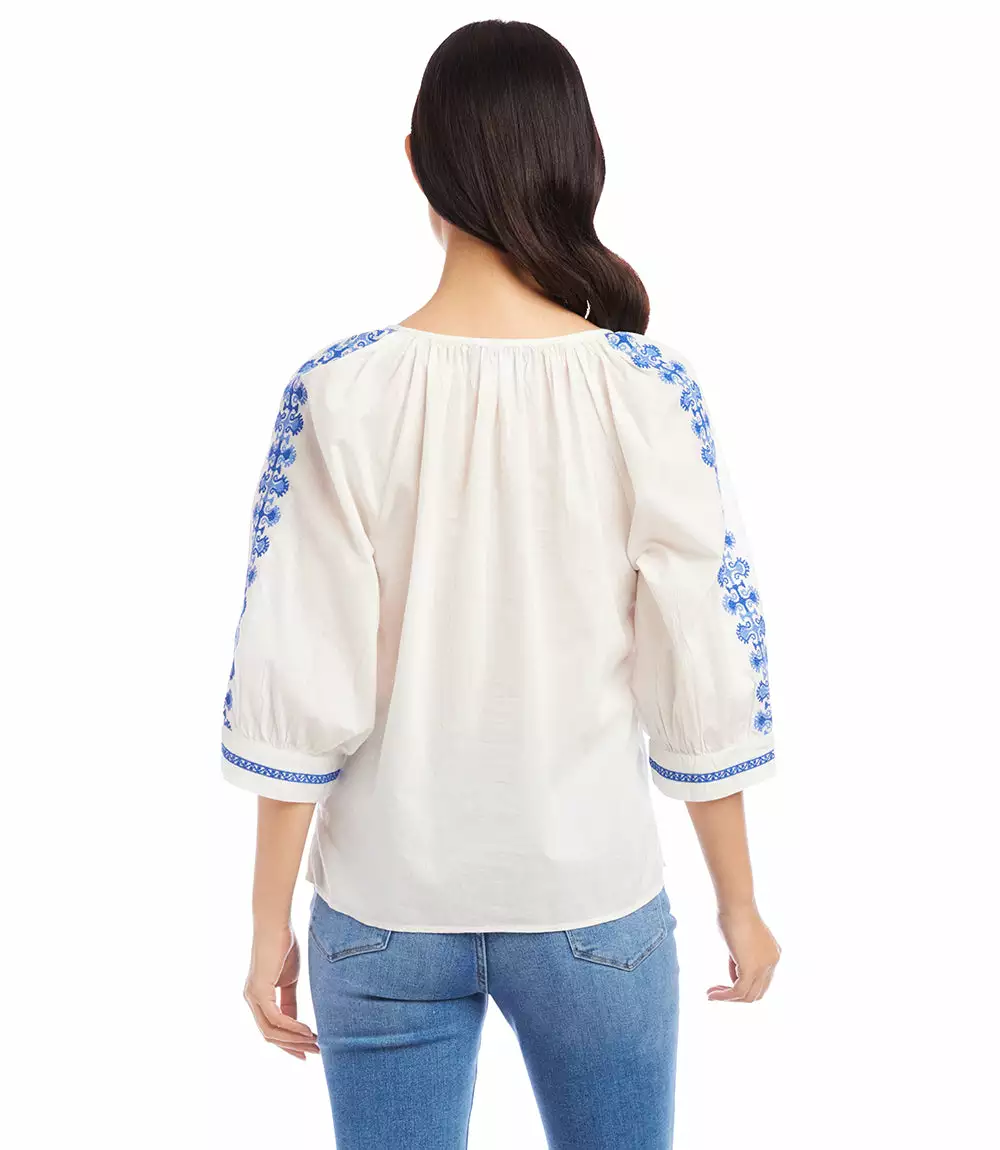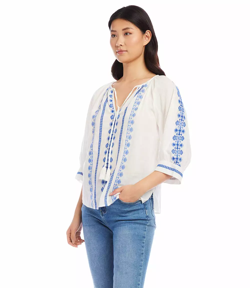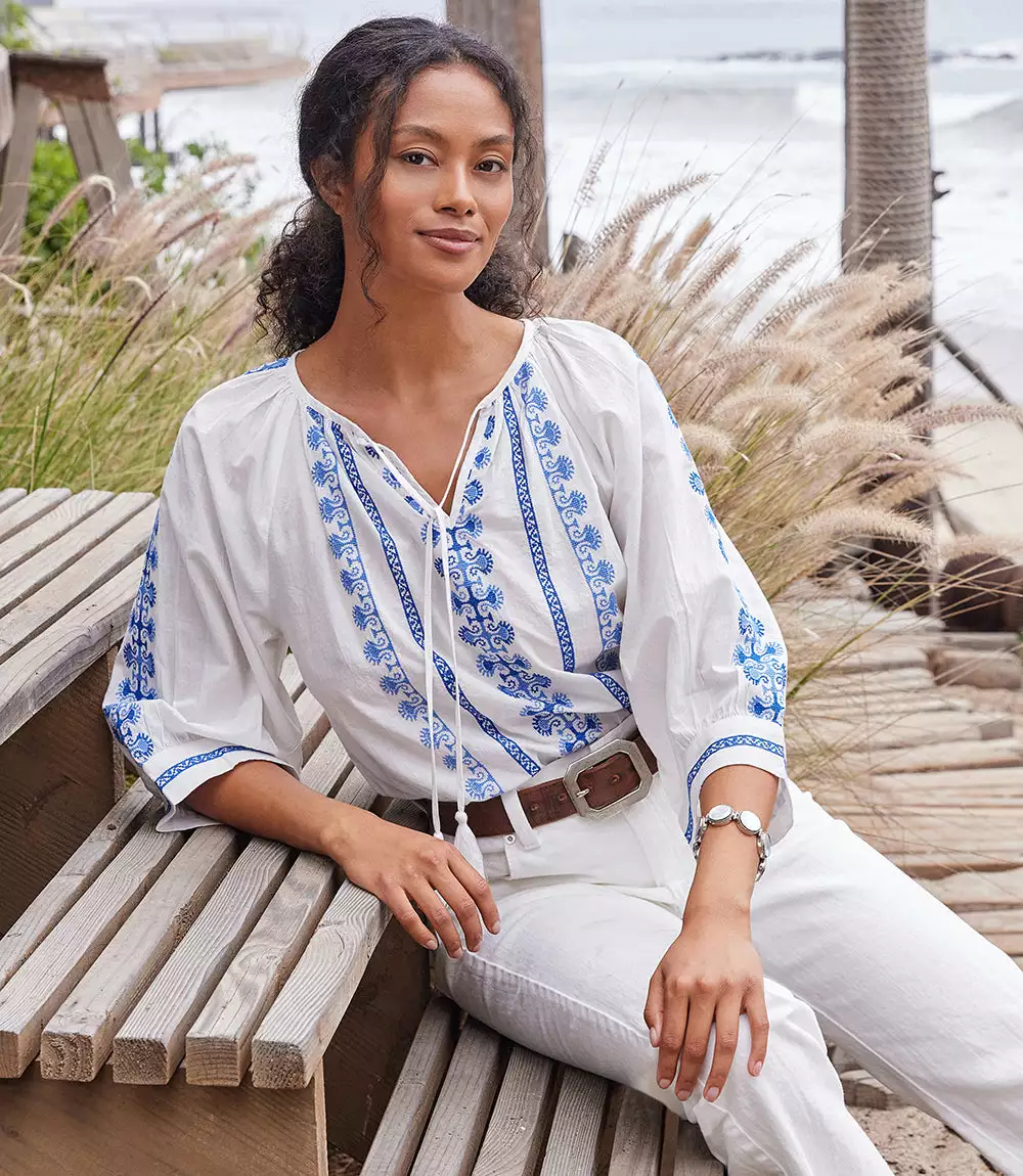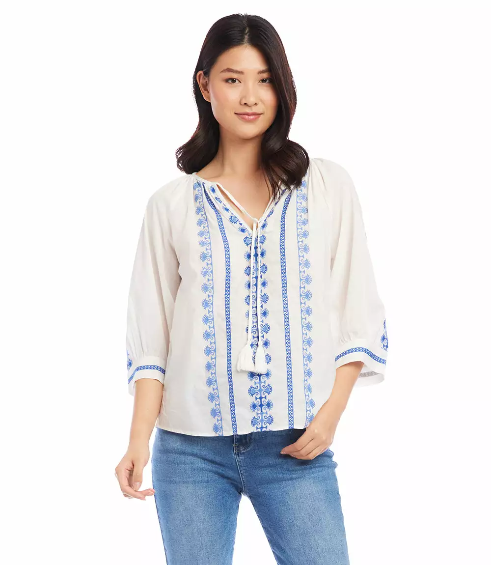 Lightweight cotton gives a breezy quality to this peasant top detailed with charming floral embroidery. Flouncy tassel ties give it the perfect finishing touch.