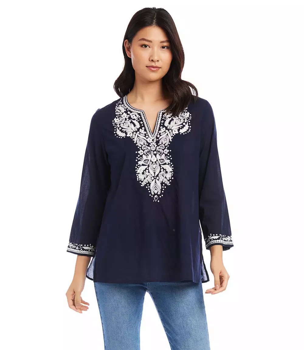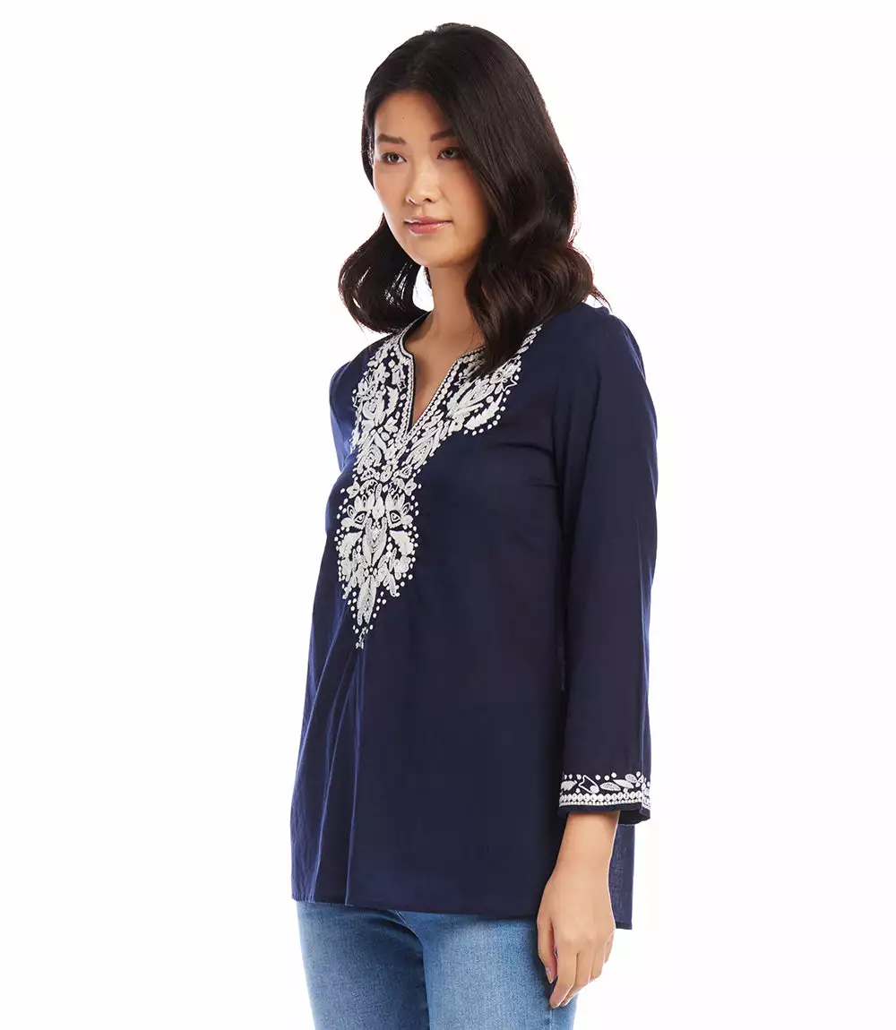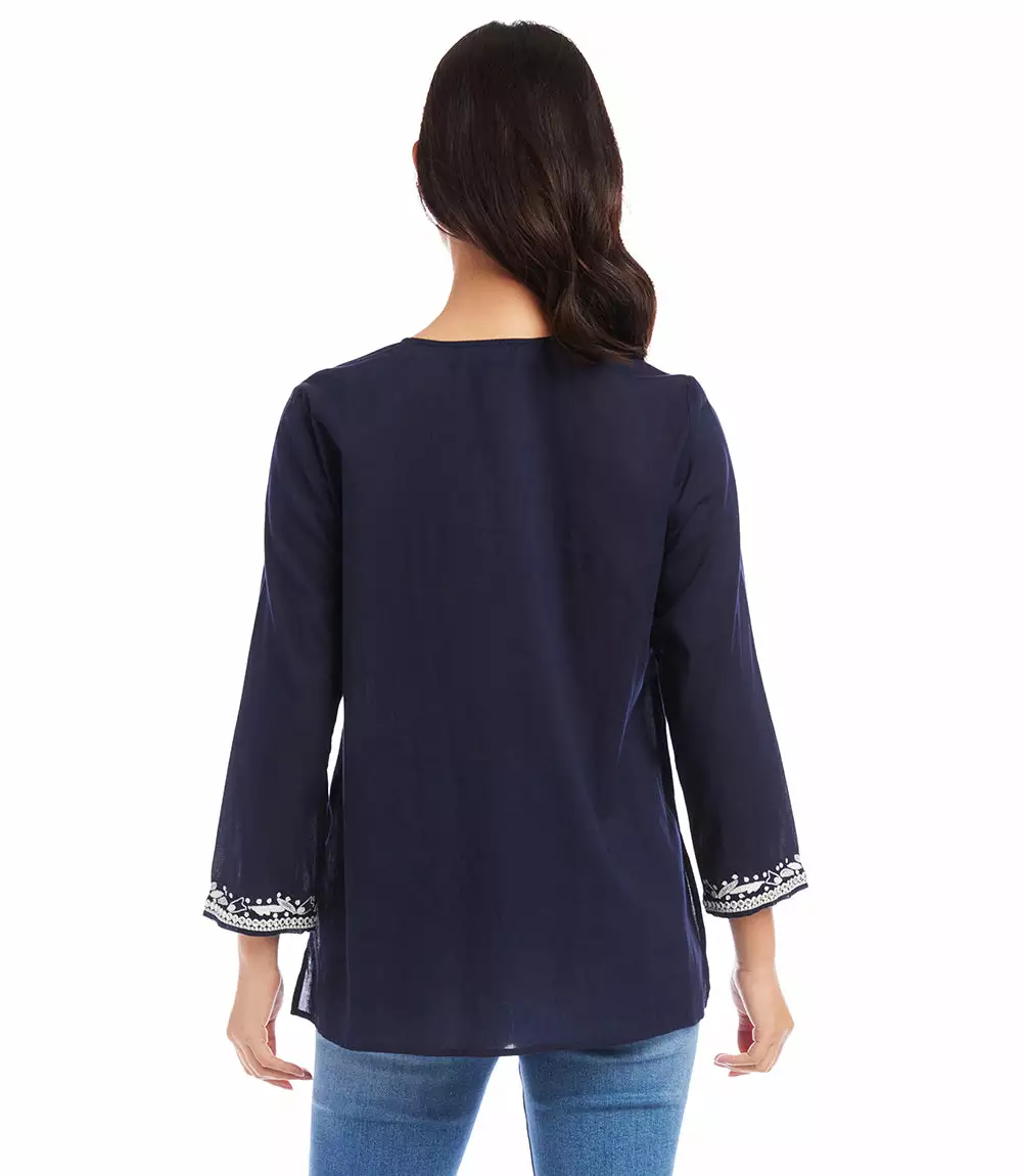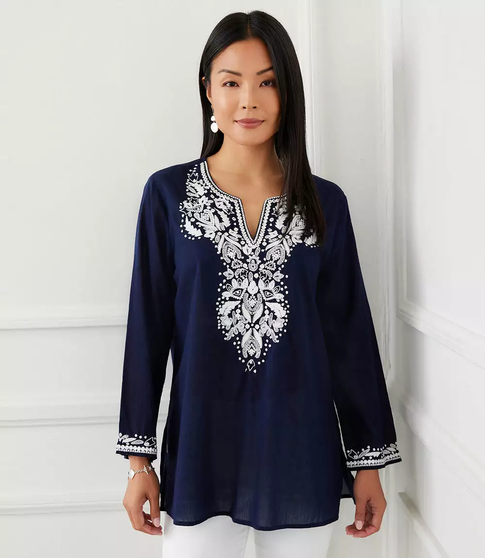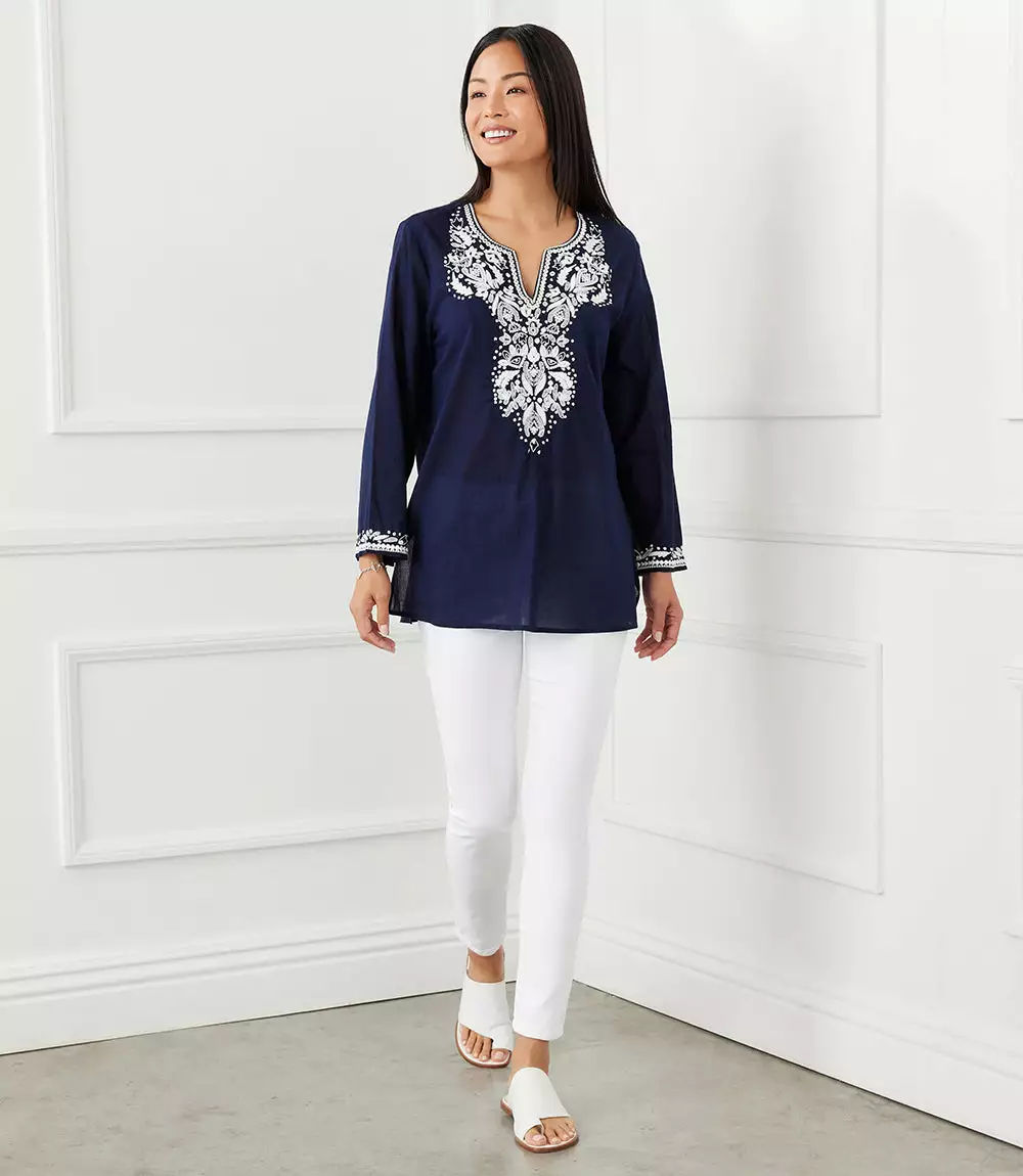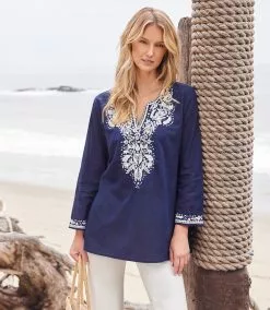Embroidered beads decorate the neckline and cuffs of this comfortable indigo-dyed top.