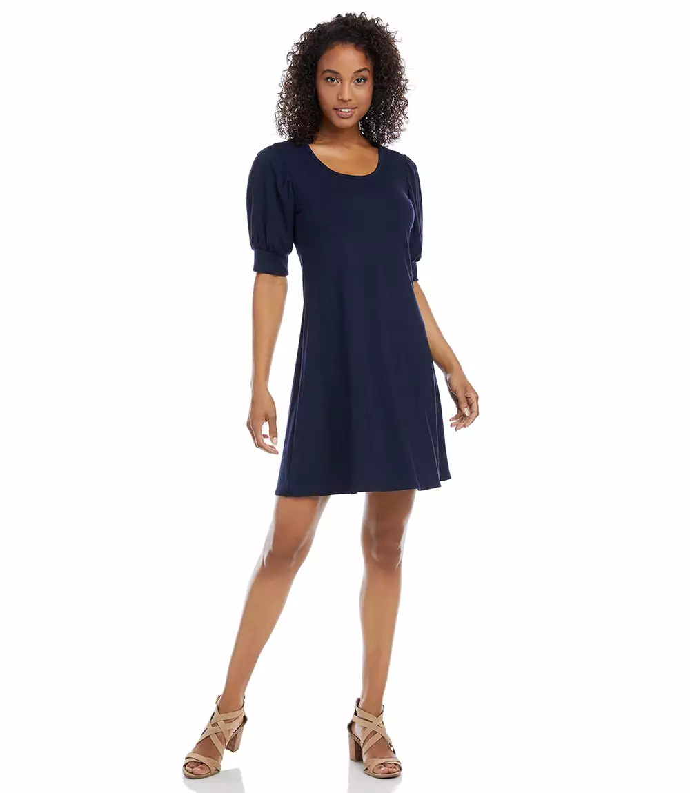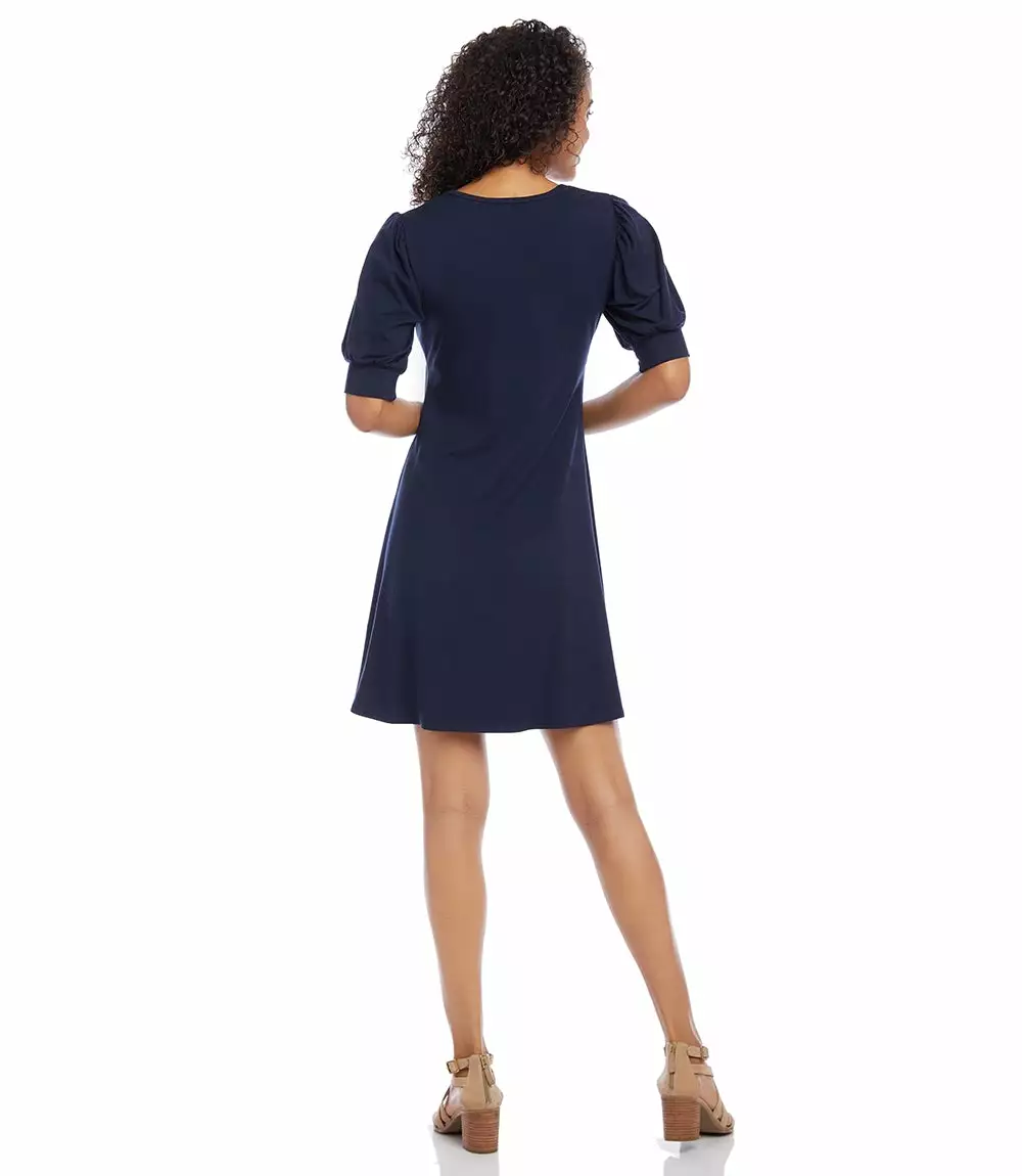 With statement-making puff sleeves, this swingy jersey knit dress offers easy elegance. This dress can easily transition from desk to dinner with a simple switch of shoes and accessories.