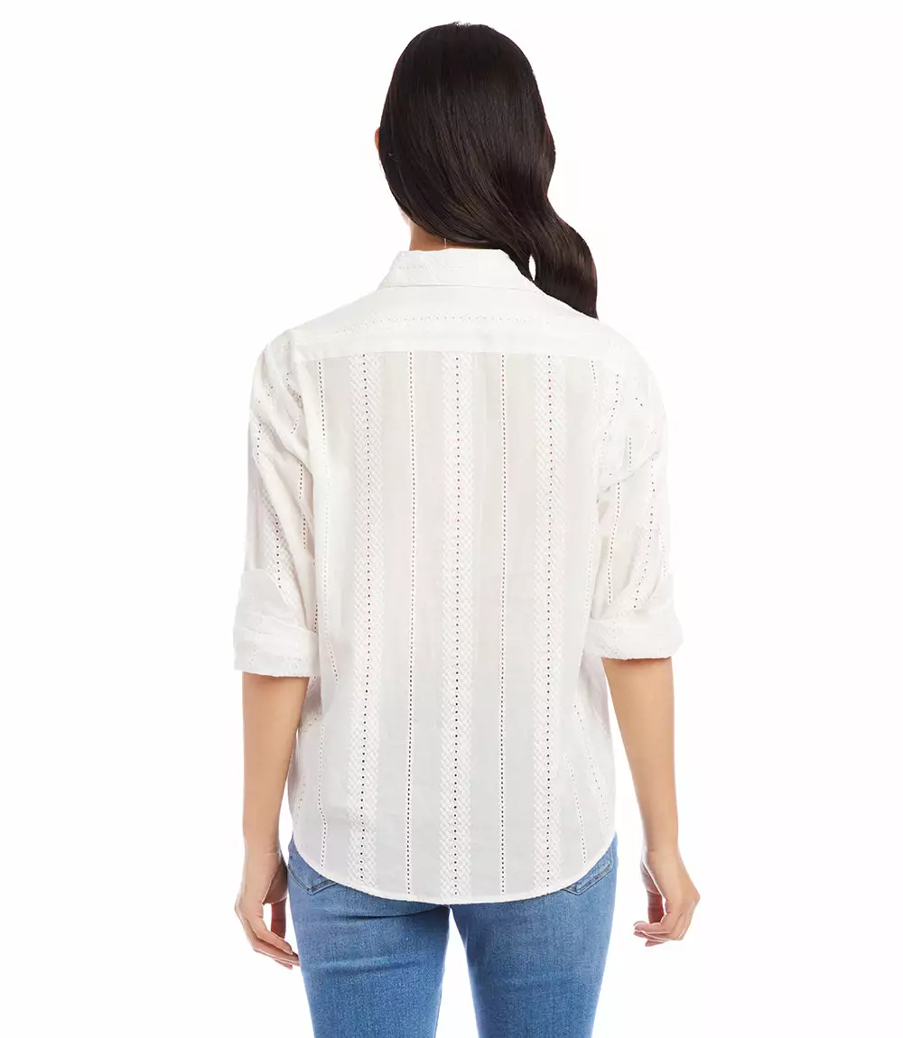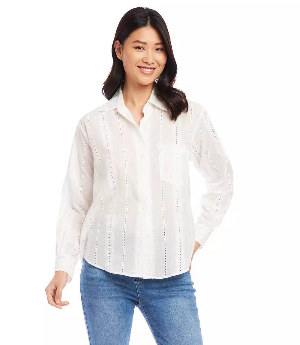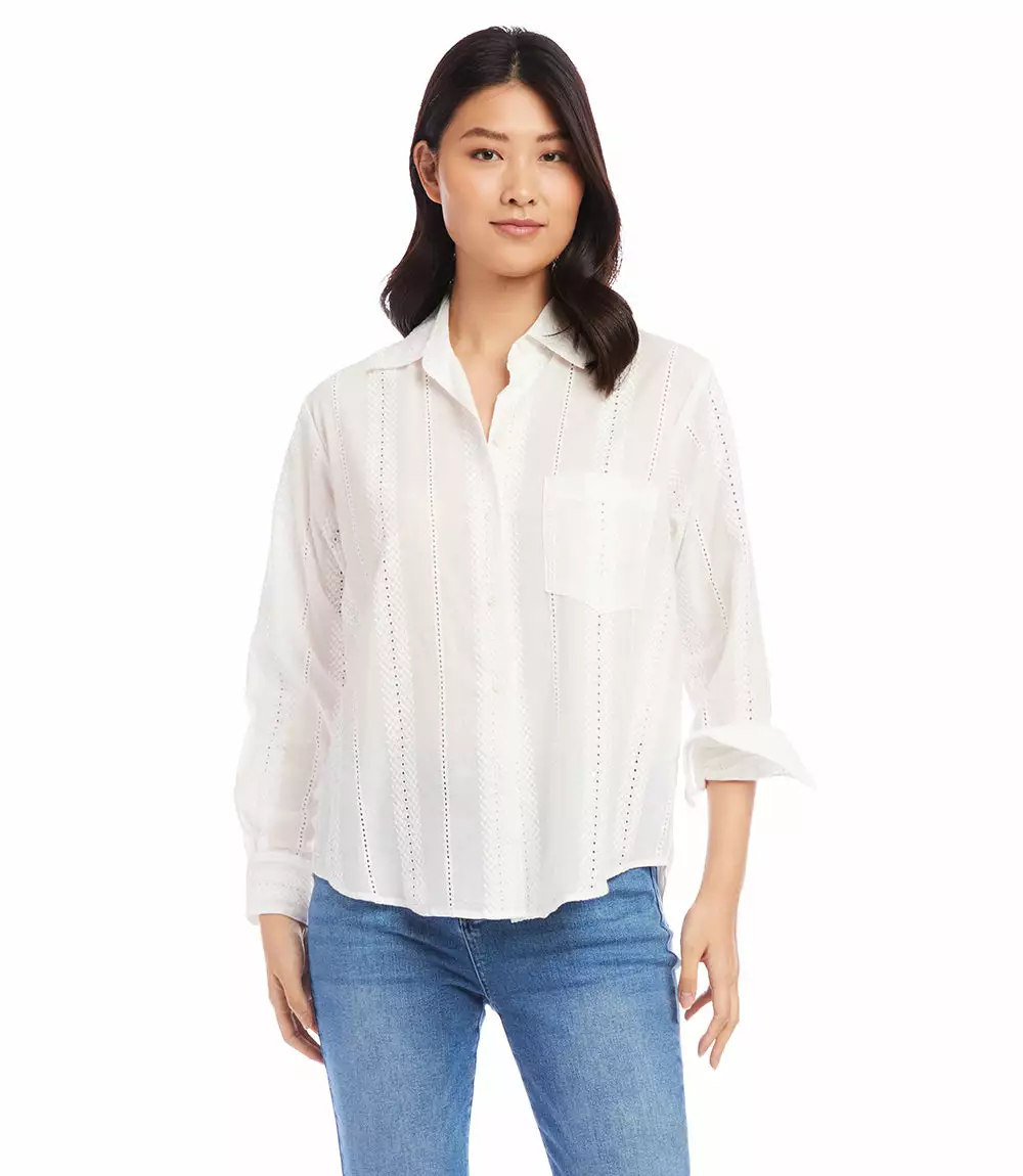 AÂ feminine top featuring intricately detailed embroidery and eyelets. Pairs perfectly with your favorite jeans or linen shorts.Â