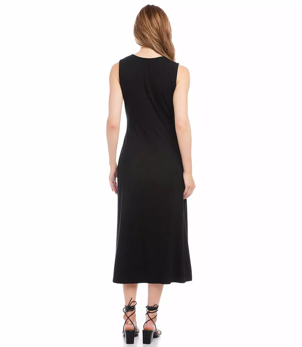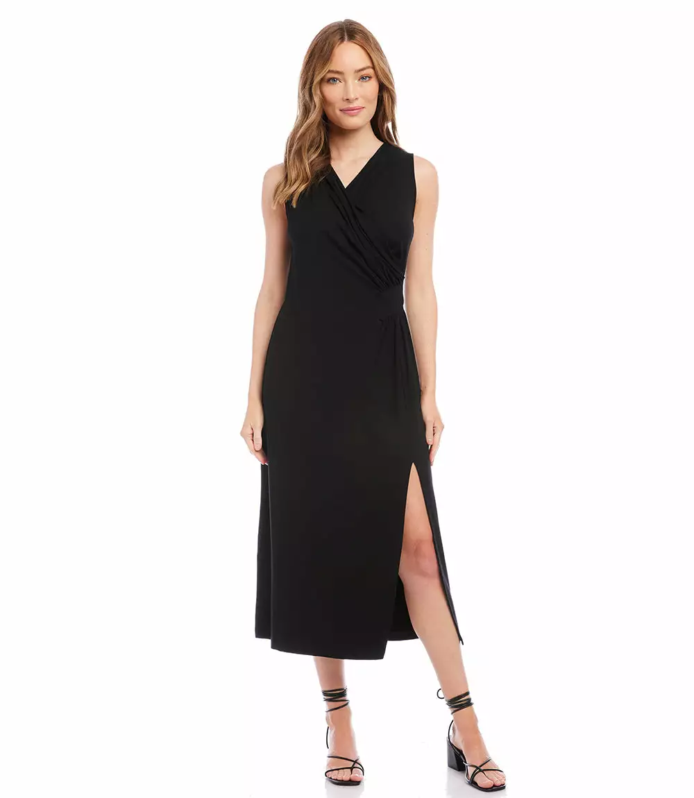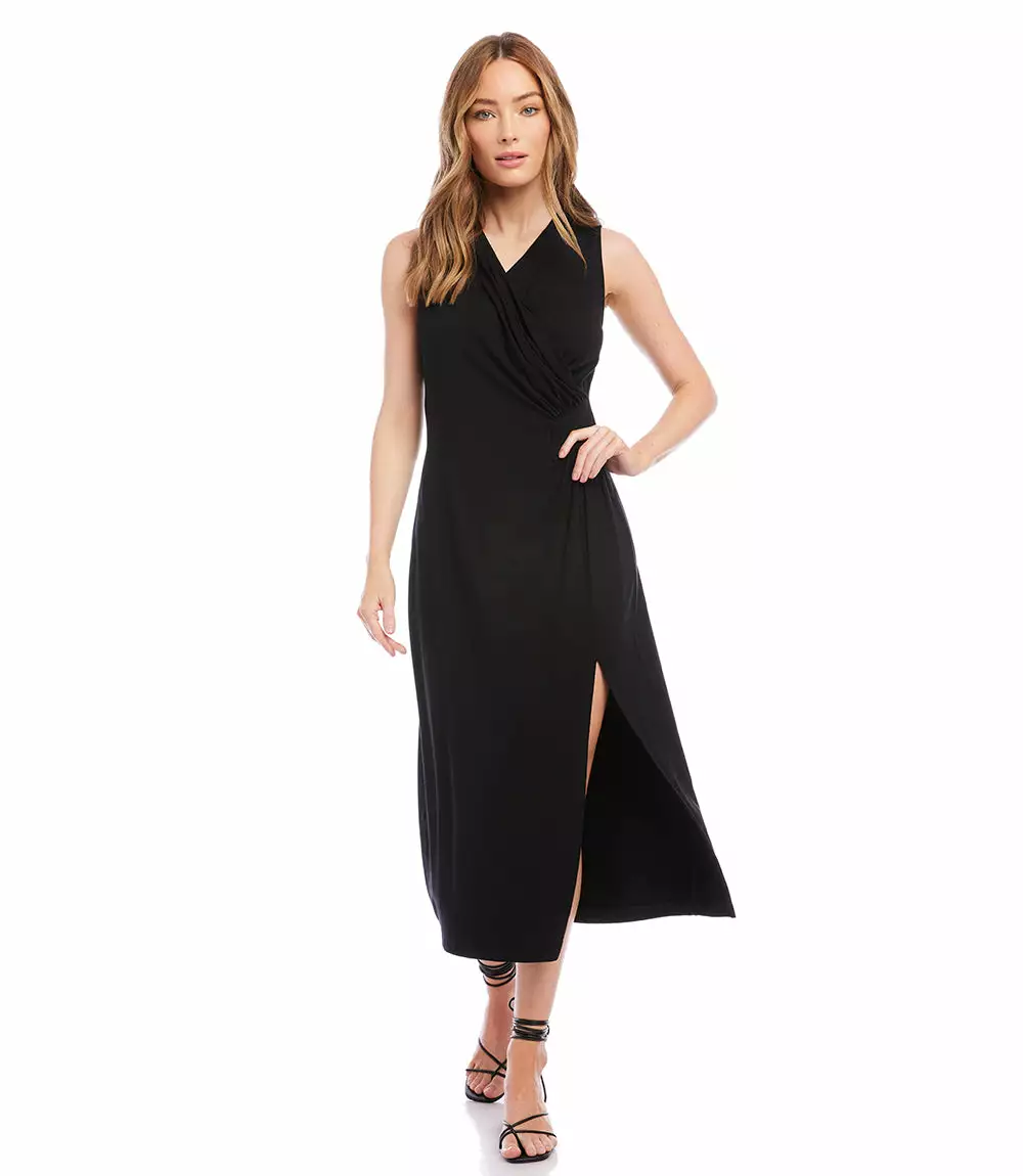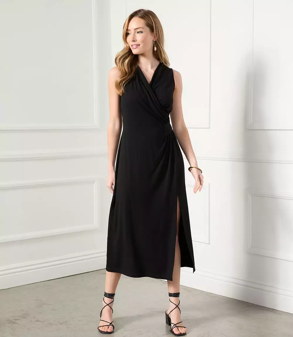 Our best-selling dress is back- now available without sleeves. Elegant and alluring, this evening-ready midi dress is cut from fluid jersey-knit fabric and detailed with graceful draping. It’s finished with a stylish side-slit. Pair it with a jacket for the Spring and Fall seasons, or wear it alone all Summer long