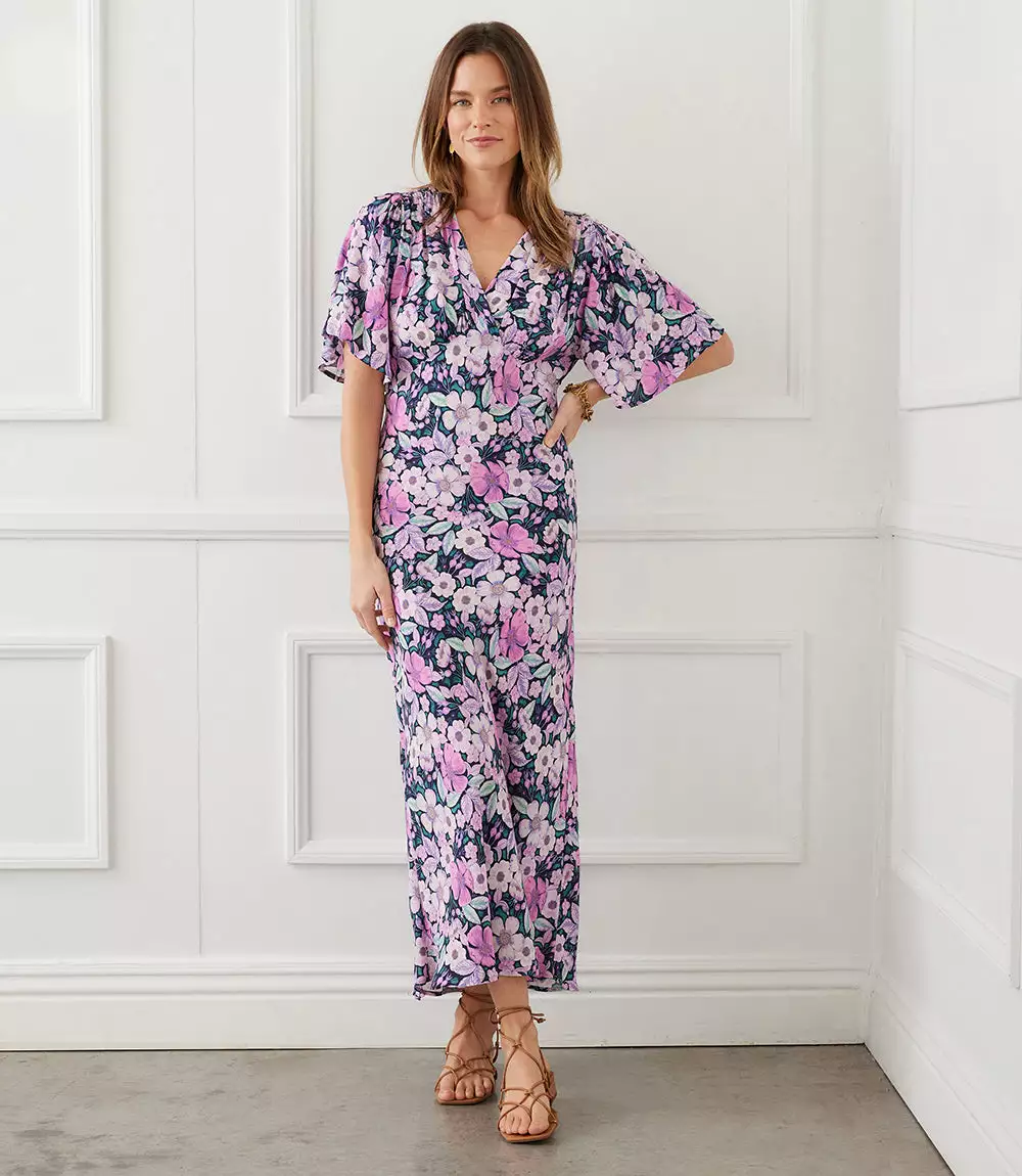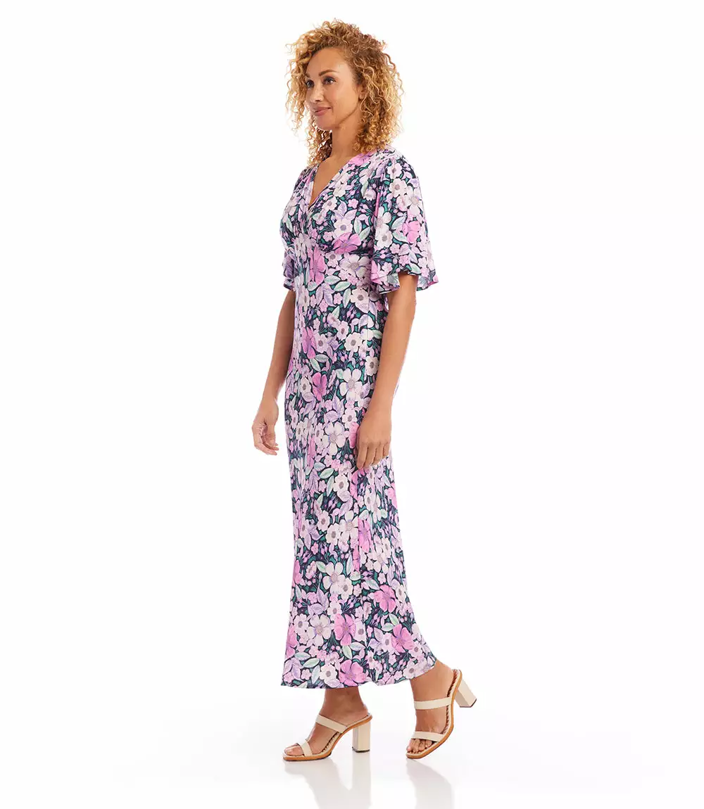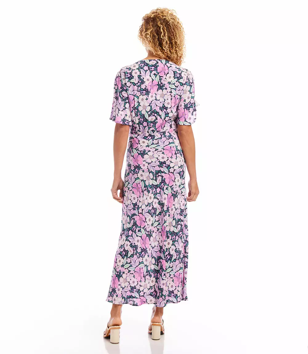 A chic new dress styled in a colorful bouquet of pink petals and contrasting shades of navy and off white.