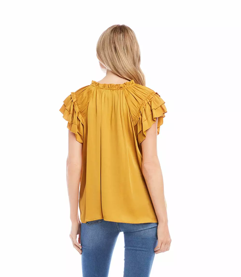 With tiered ruffles along the shoulders and tie-neck detail, this silky satin top gives you an effortlessly feminine look.