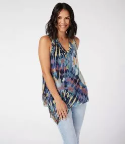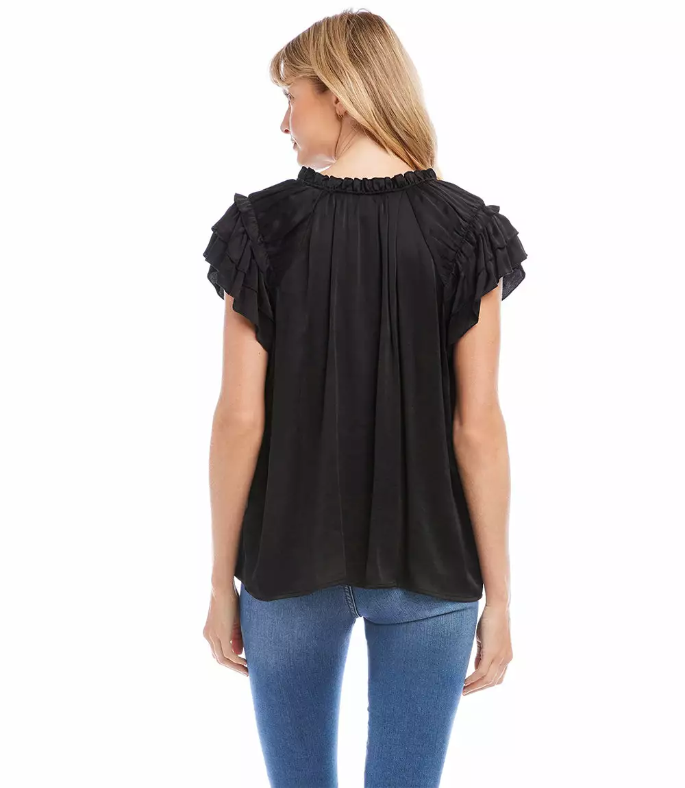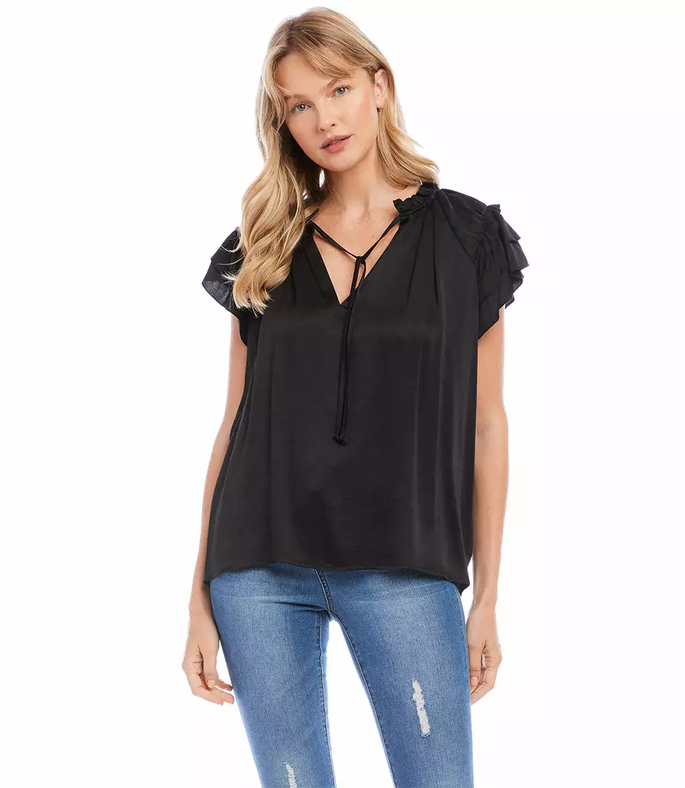 With tiered ruffles along the shoulders and tie-neck detail, this silky satin top gives you an effortlessly feminine look.