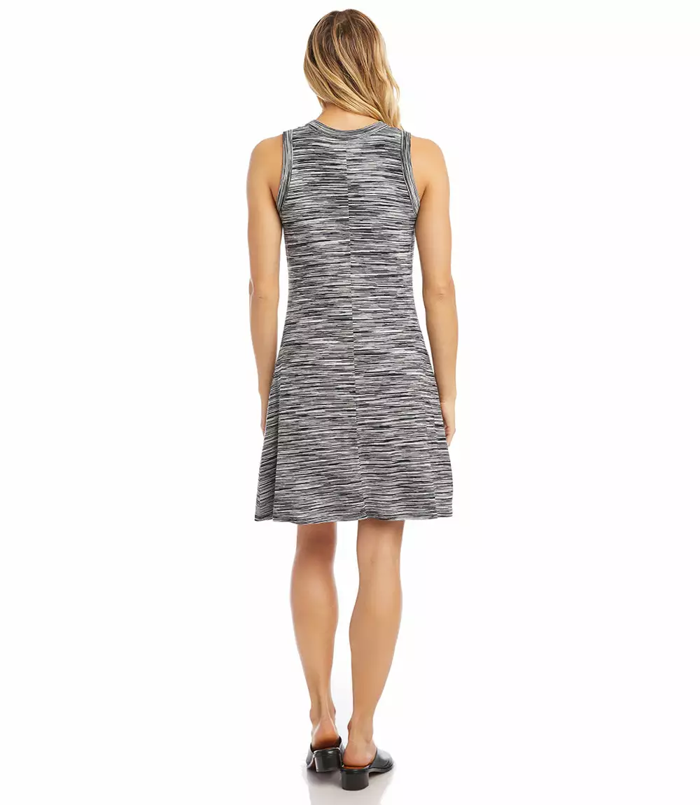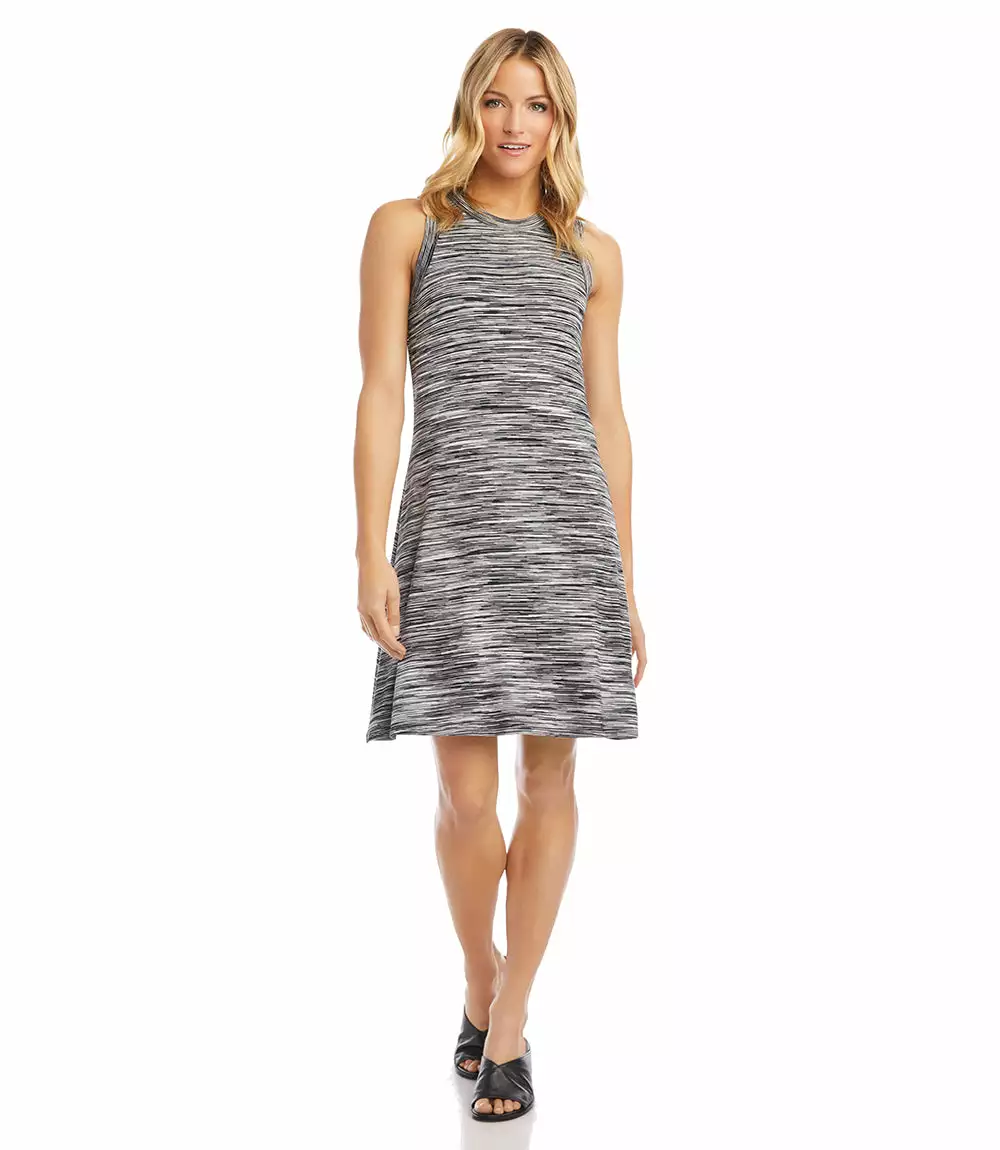 Soft knit fabric shapes this abstract print dress cut with a flattering a-line silhouette that flows over the body in streamlined sophistication. Pack this dress for your next weekend getaway.