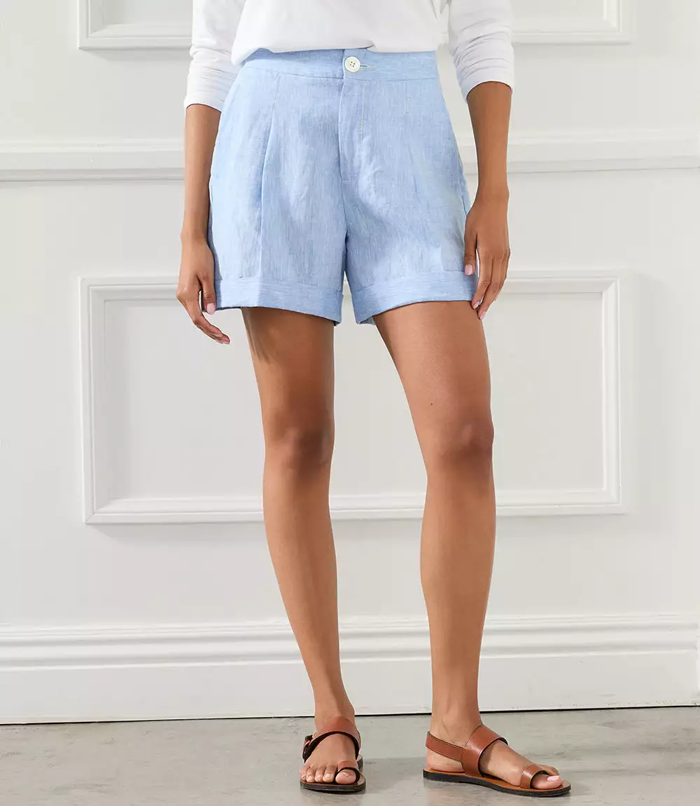 Casual, yet polished, this pair of shorts is cut from a cool and breathable yarn-dyed linen. With stylized pleats, convenient pockets, and a cuffed hem, this is a classic style you’ll keep in your closet for years to come.