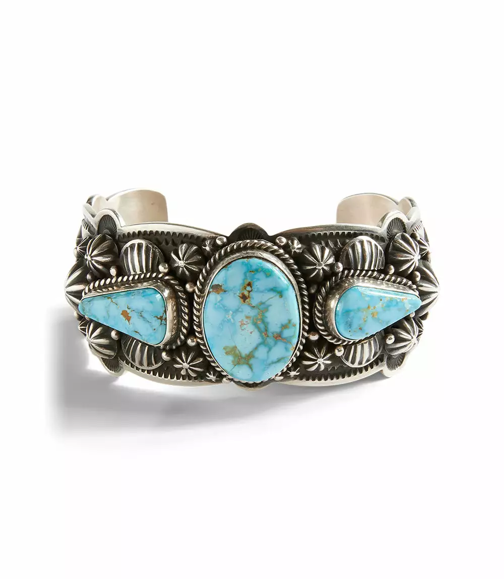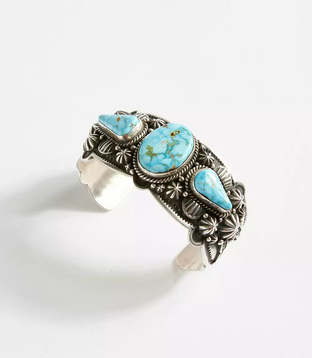 This sterling silver cuff was delicately made by a Navajo artist. Stunning happy piasso Kingman turquoise stones are encased in this sterling-silver cuff. It’s detailed with exquisite deep stampwork and silver droplets.