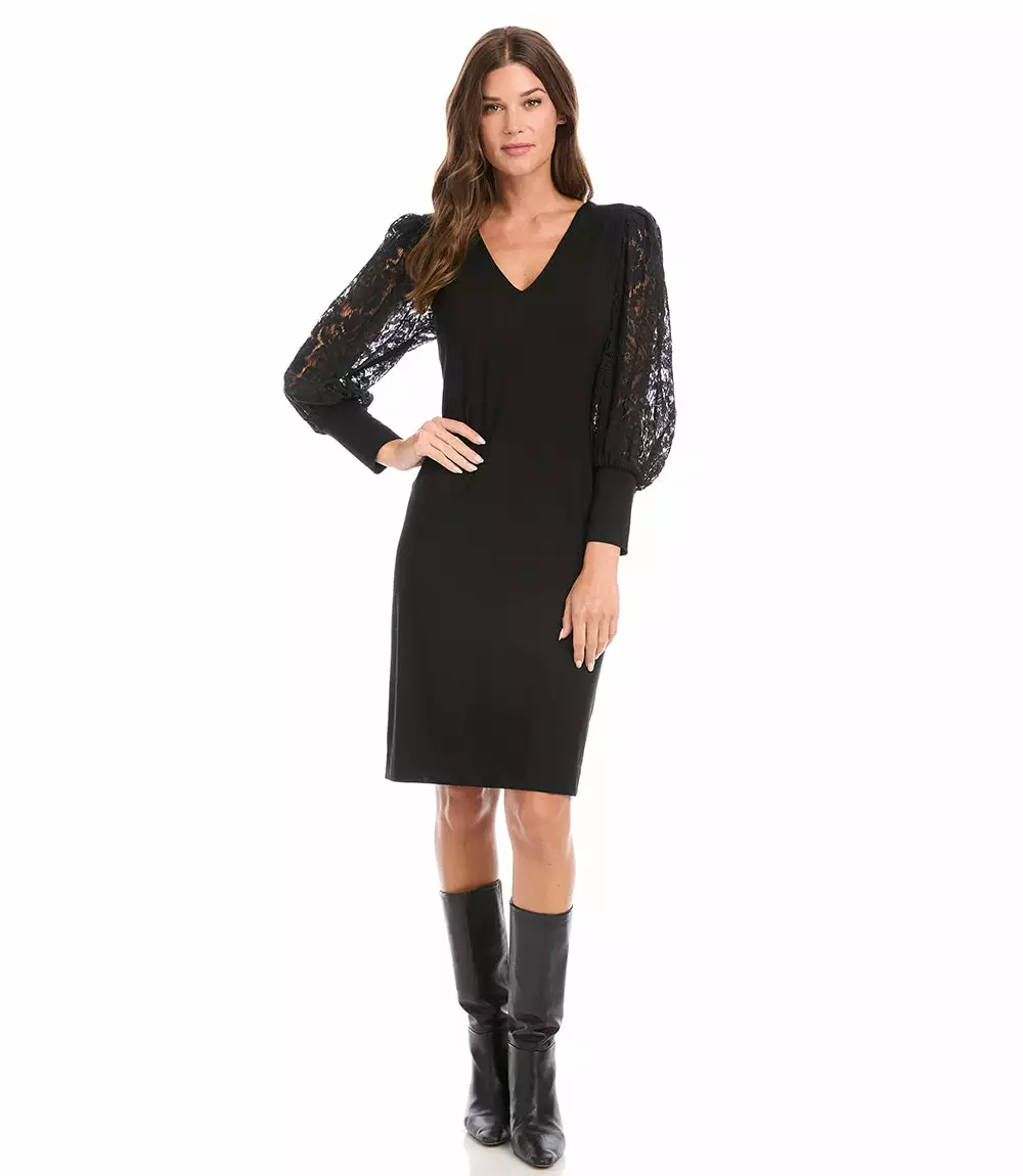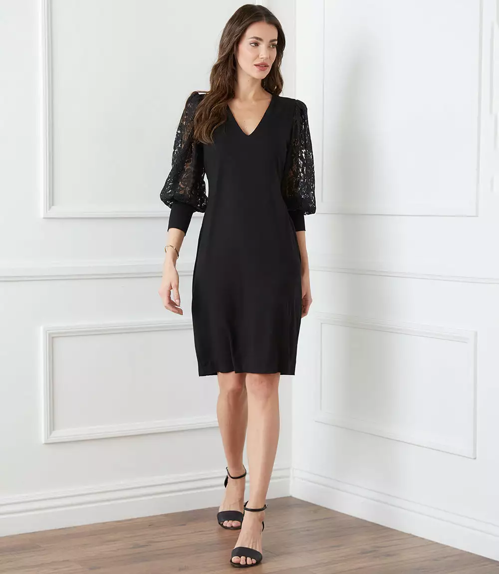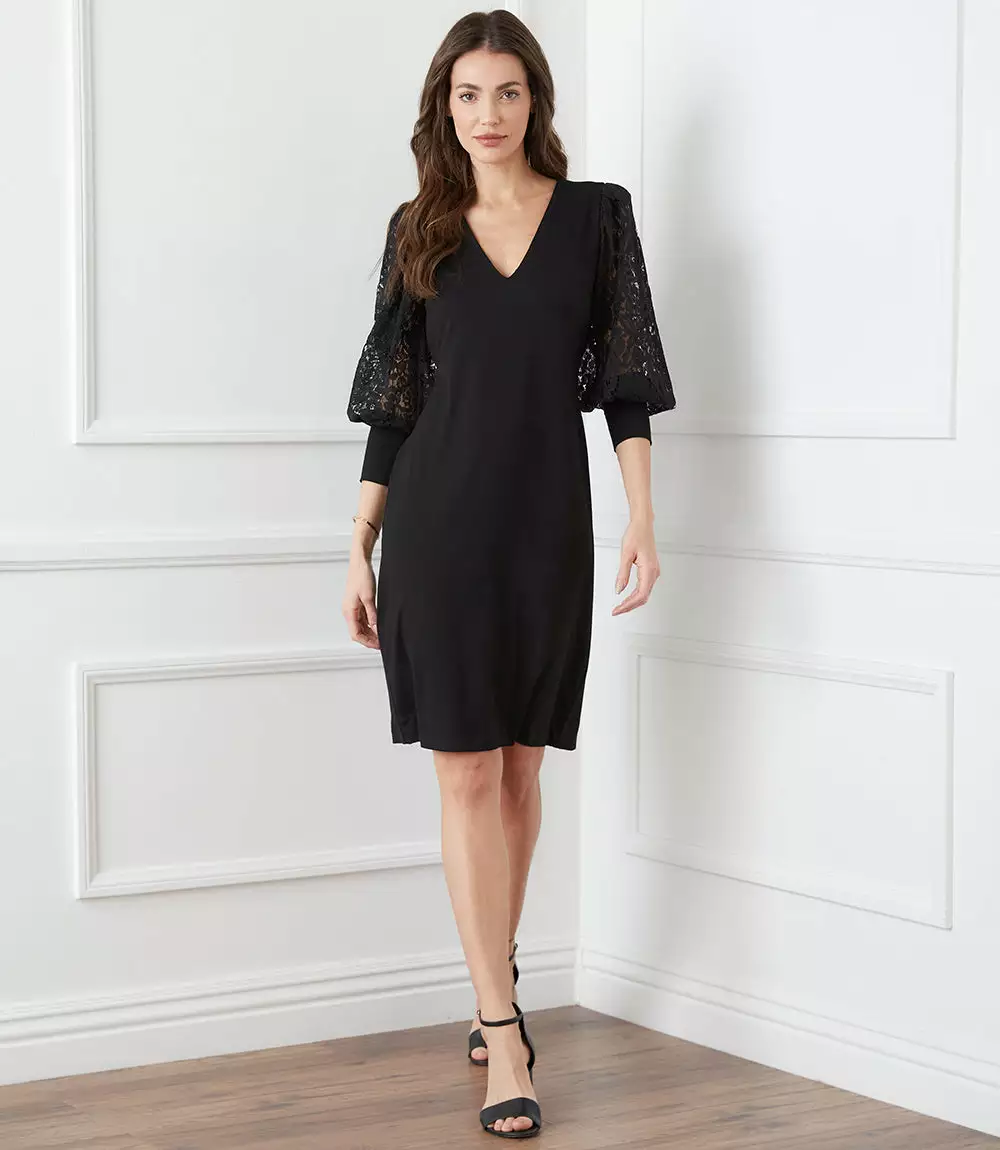 Romantic allure is found in these airy lace sleeves. This curve-defining dress is cut from soft jersey-knit for a comfortable, evening look.