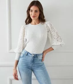 Buttery, soft brushed rib knit shapes this top detailed with airy lace sleeves. This romantic top adds the perfect amount of femininity to your wardrobe.