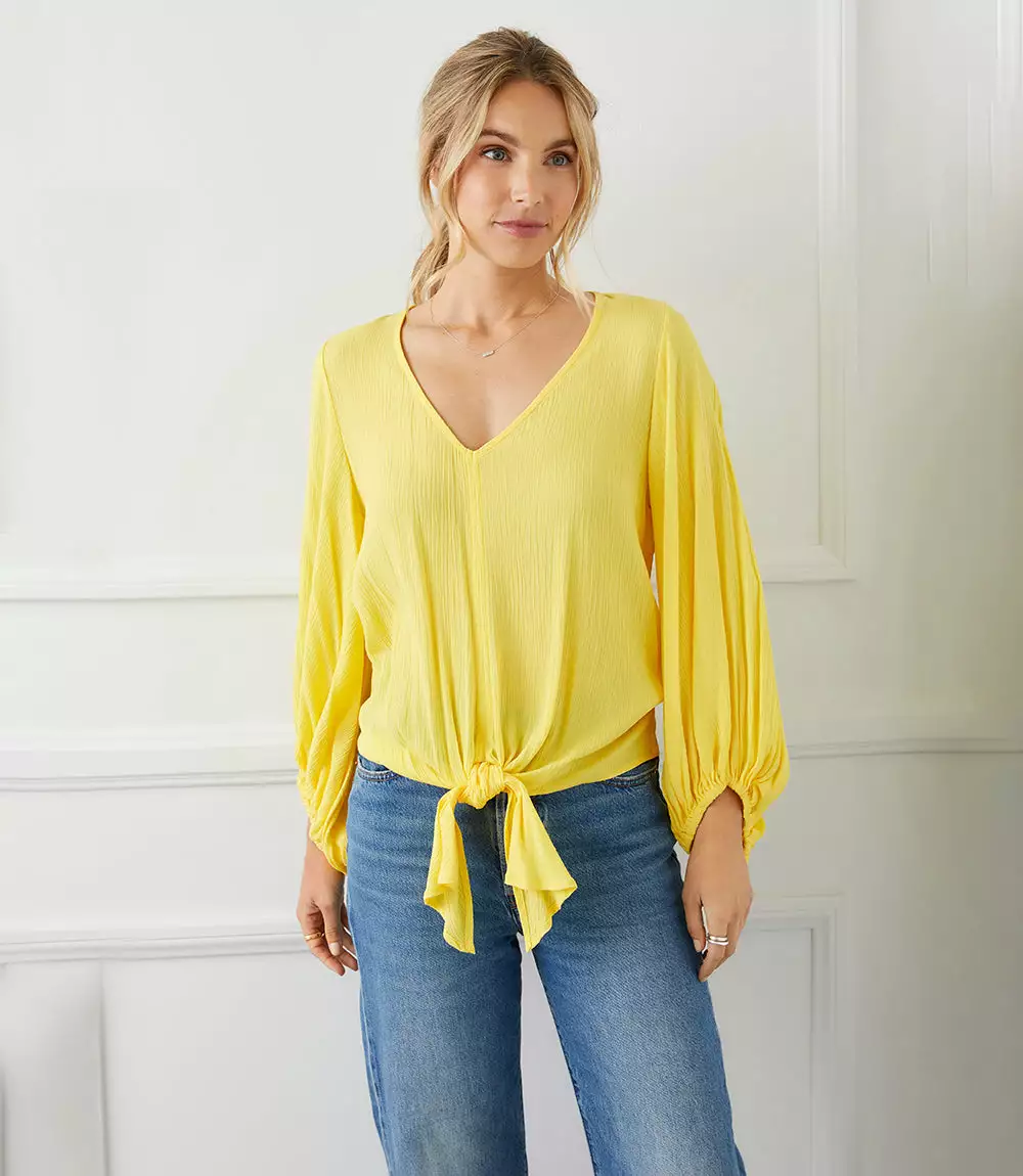 Statement-making blouson sleeves define this breezy gauze top finished with a stylish tie-front.