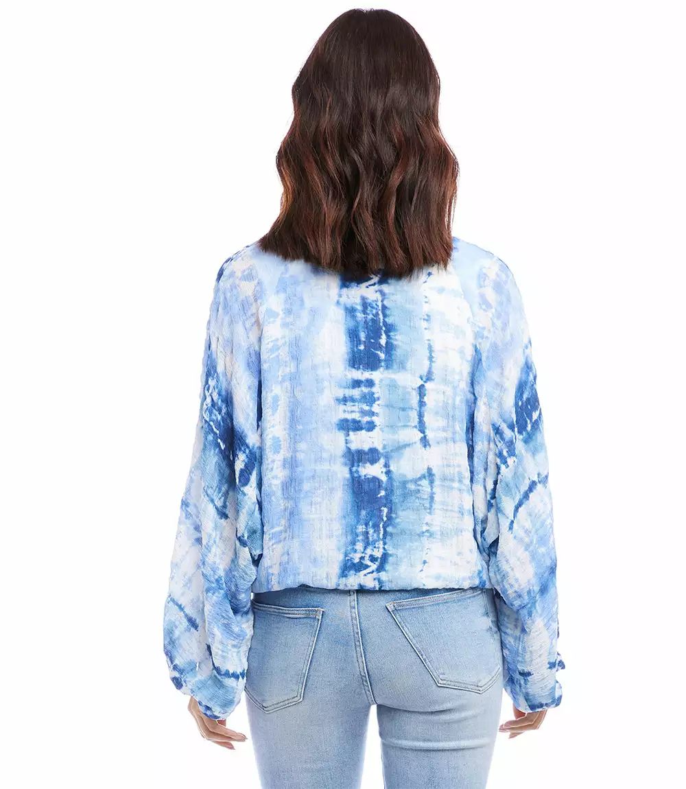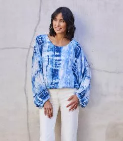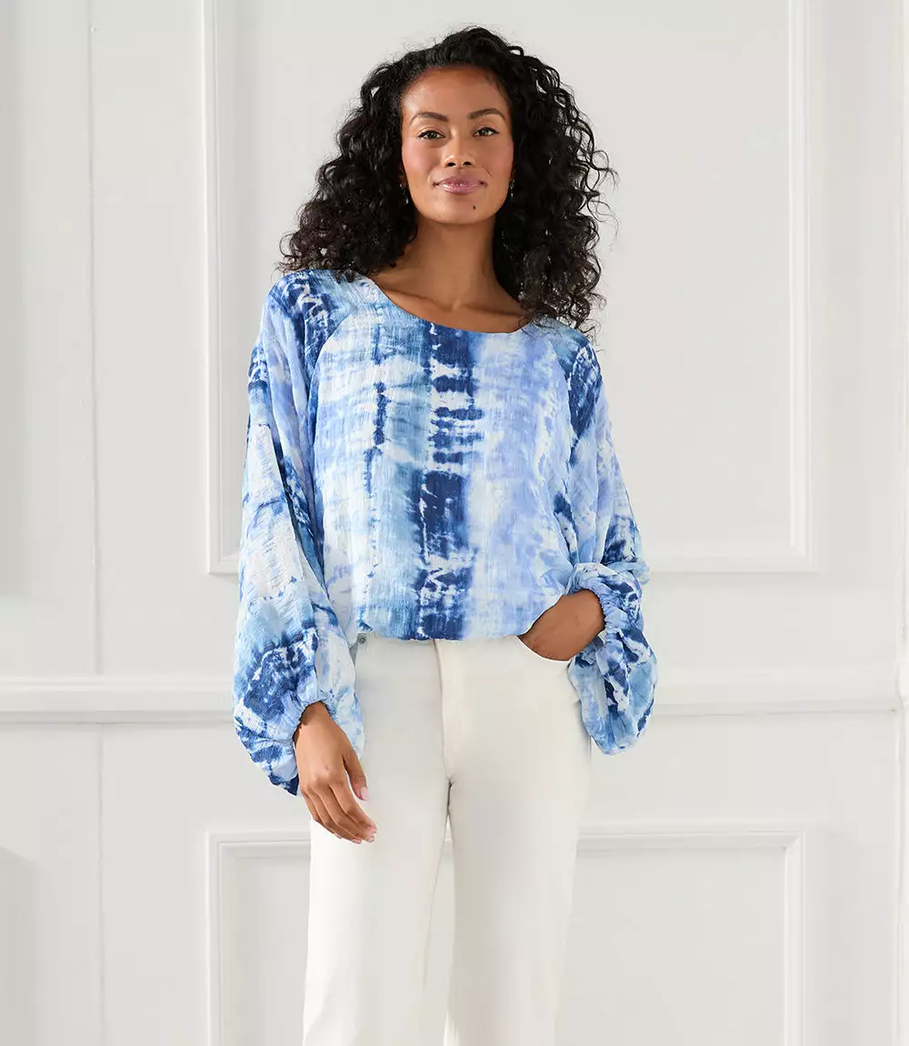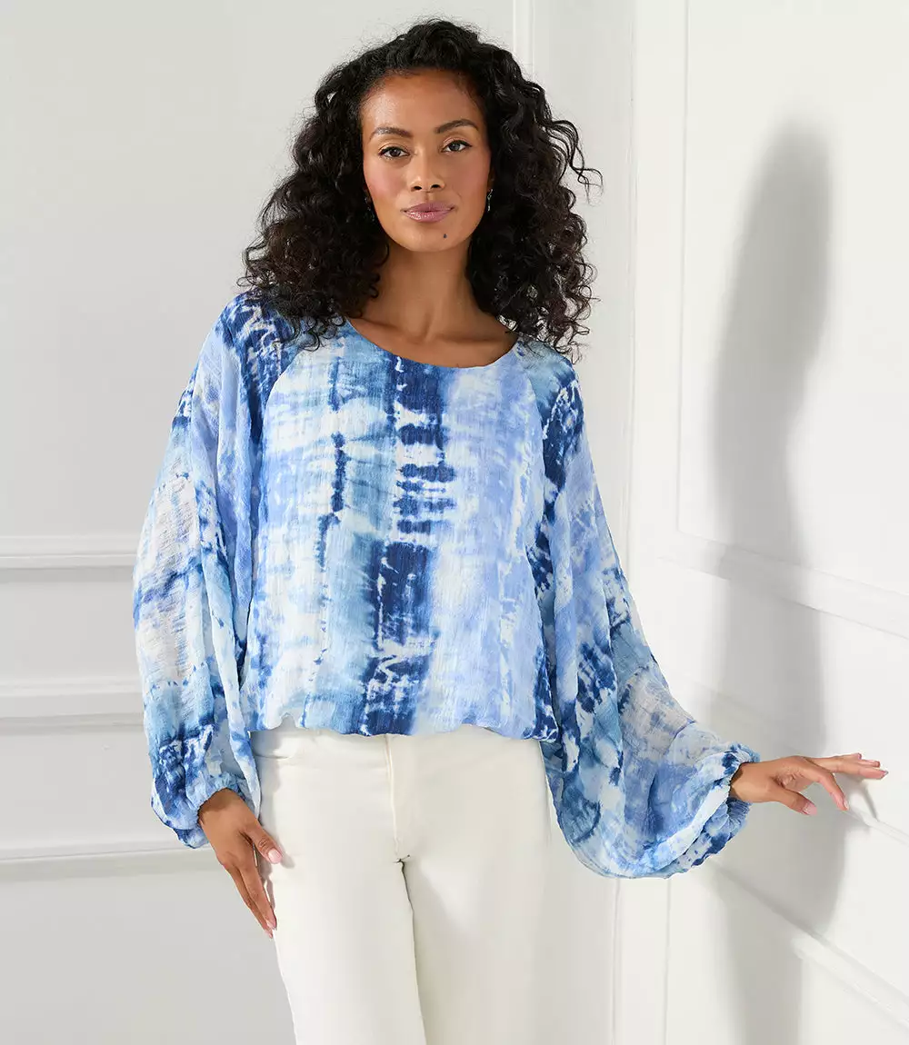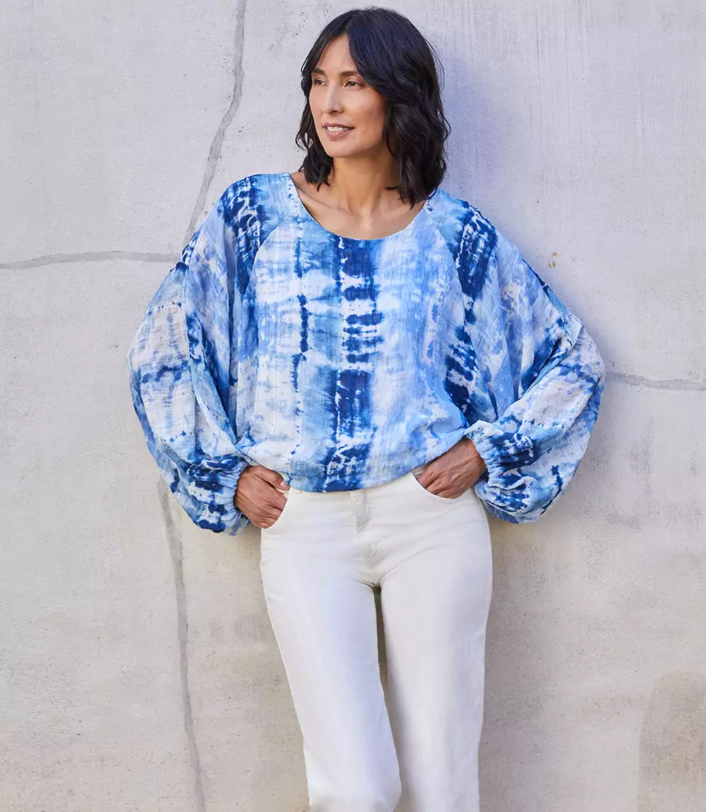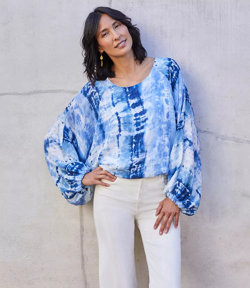 A painterly watercolor print sets a modern tone to this woven top detailed with statement-making lantern sleeves.