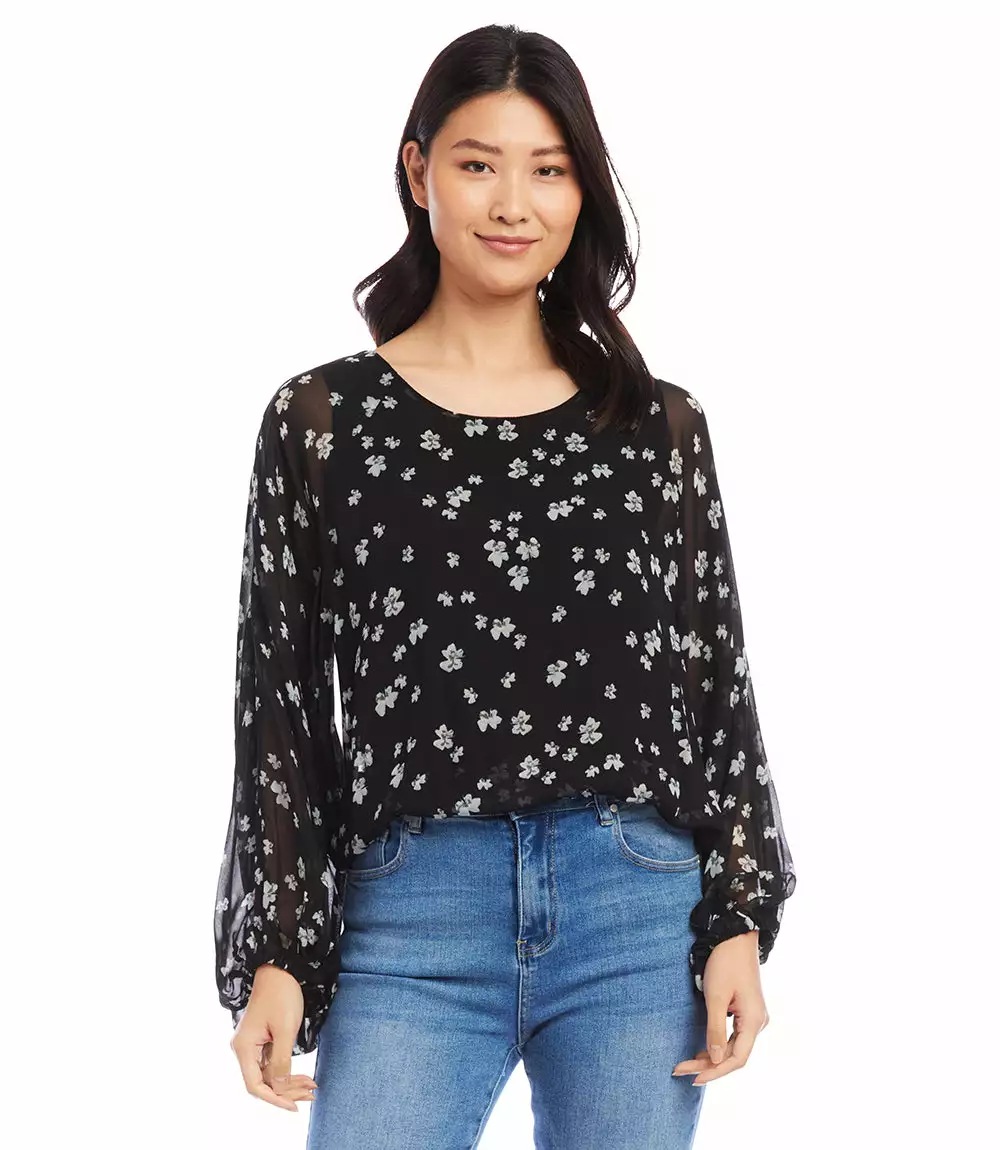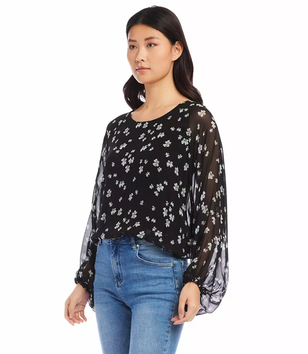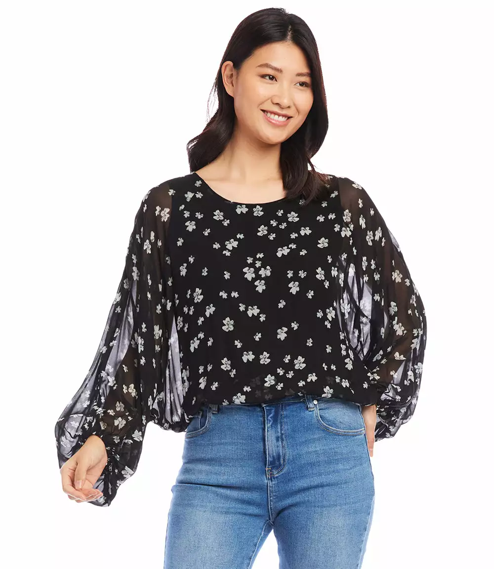A sheer overlay adds soft movement to this billowy top detailed with romantic sheer sleeves and a gentle floral print. This generously size top is lined with stretchy jersey knit.