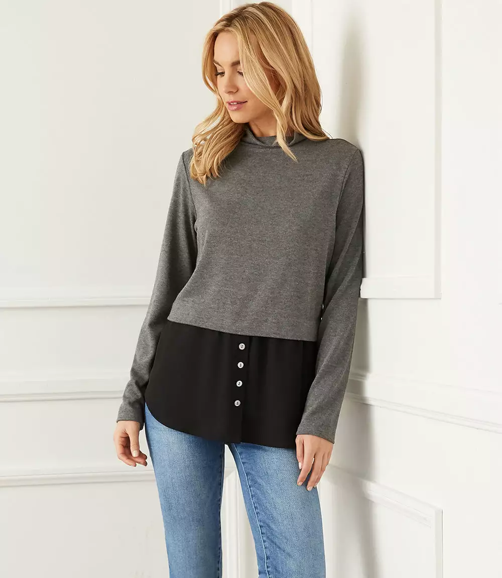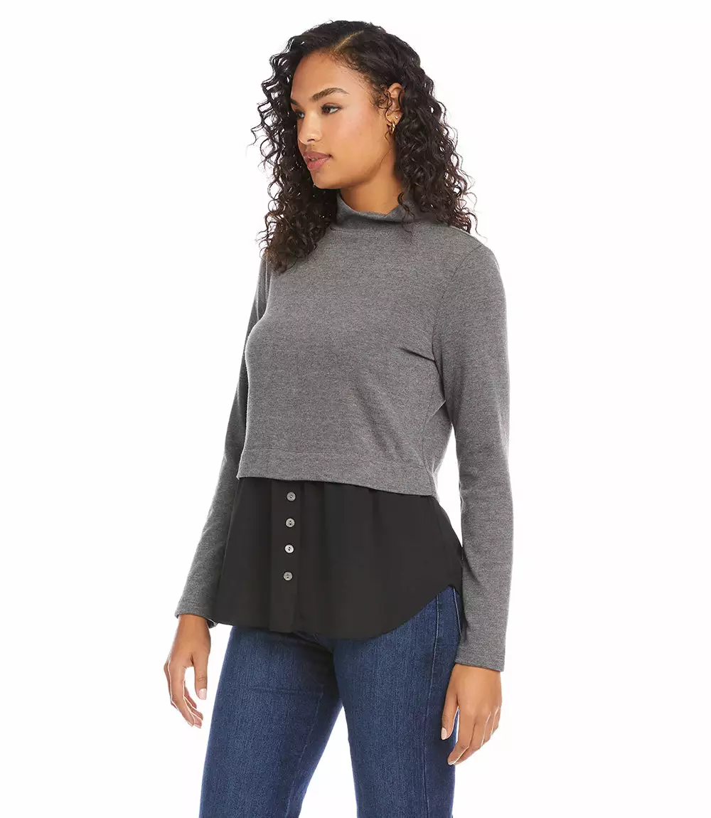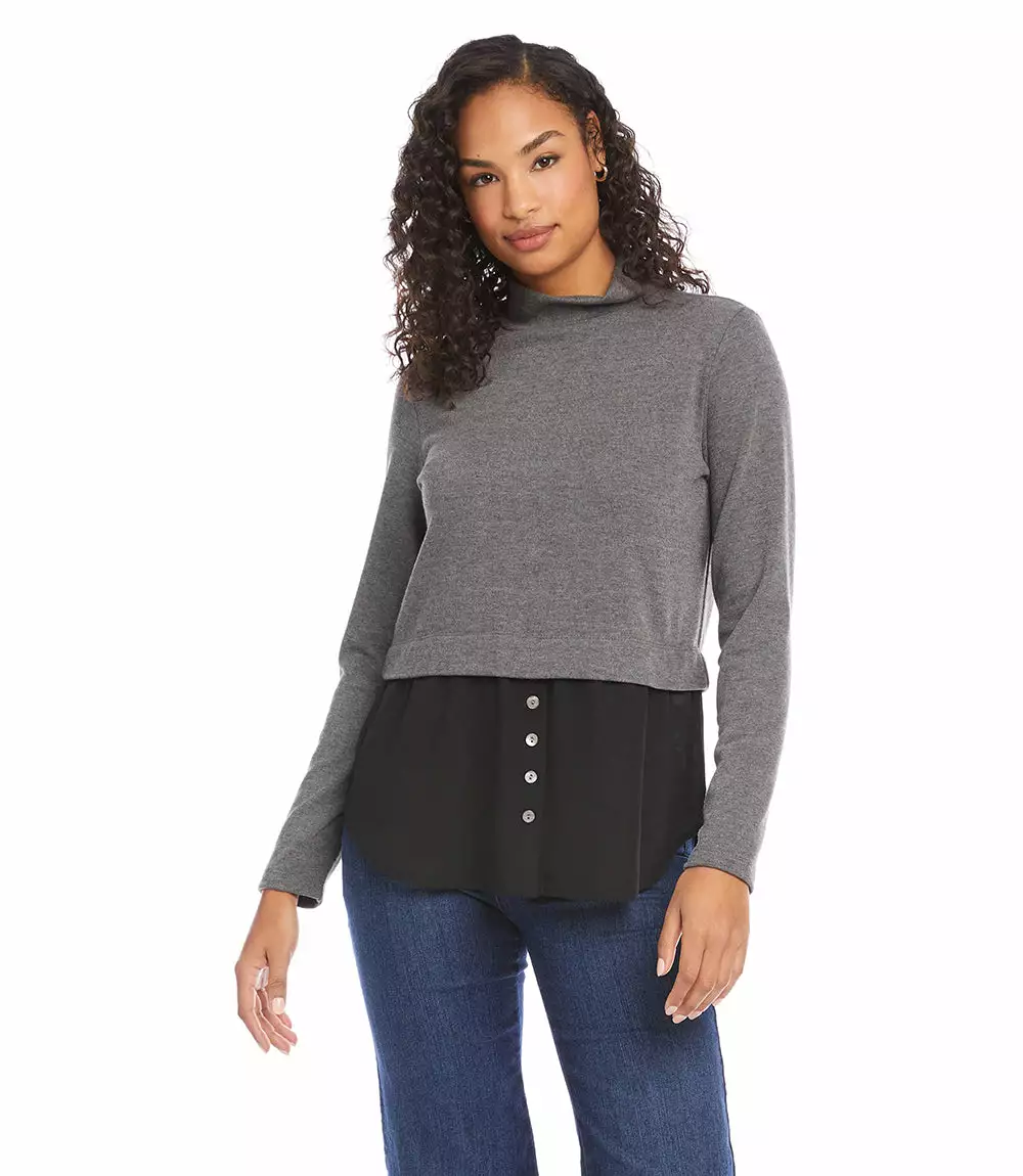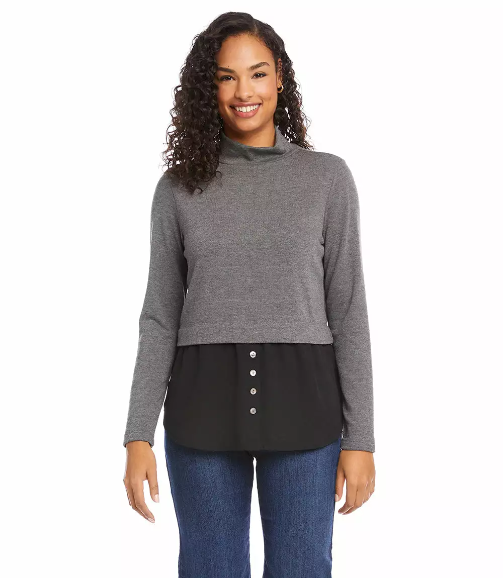 A button-down contrast hem brings a stylish layered illusion to this soft pullover sweater. This layered sweater is perfect for the office and beyond. The ultimate sweater: wear it dressed-up or-down any day of the week. Designed to deliver the illusion of a two-piece look by wearing only one simple style.
