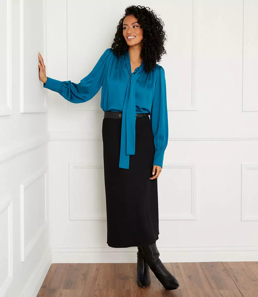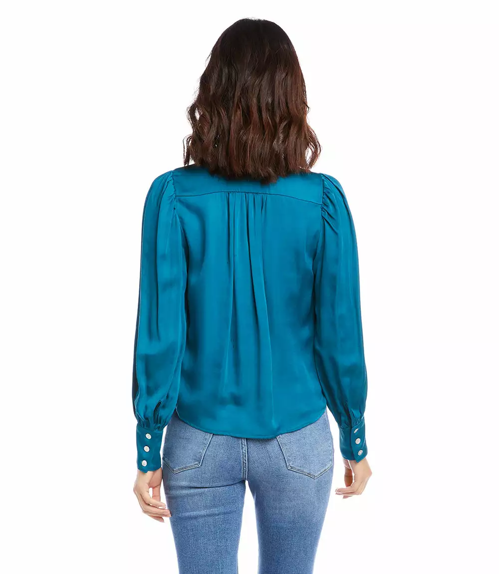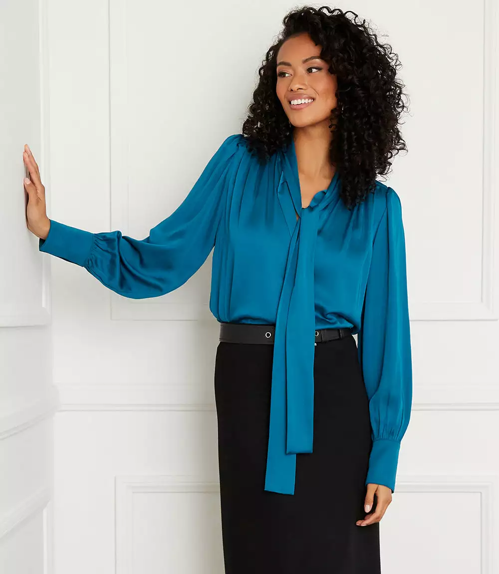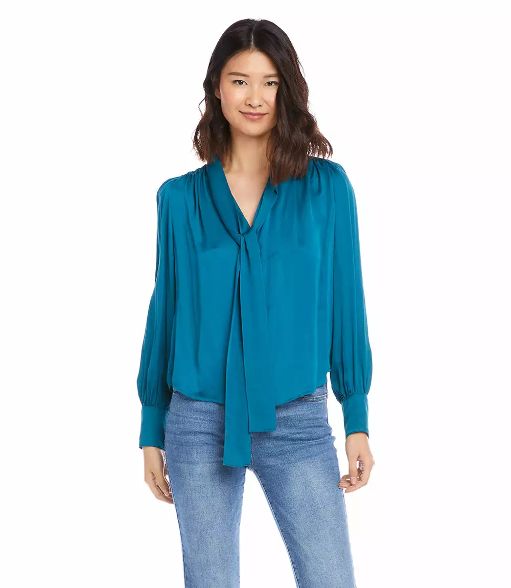 Cut from luxurious silky satin, this top is detailed with a charming neckline bow. It’s also detailed with billowy blouson sleeves. This blouse is the perfect choice for office hours, dinner and beyond.