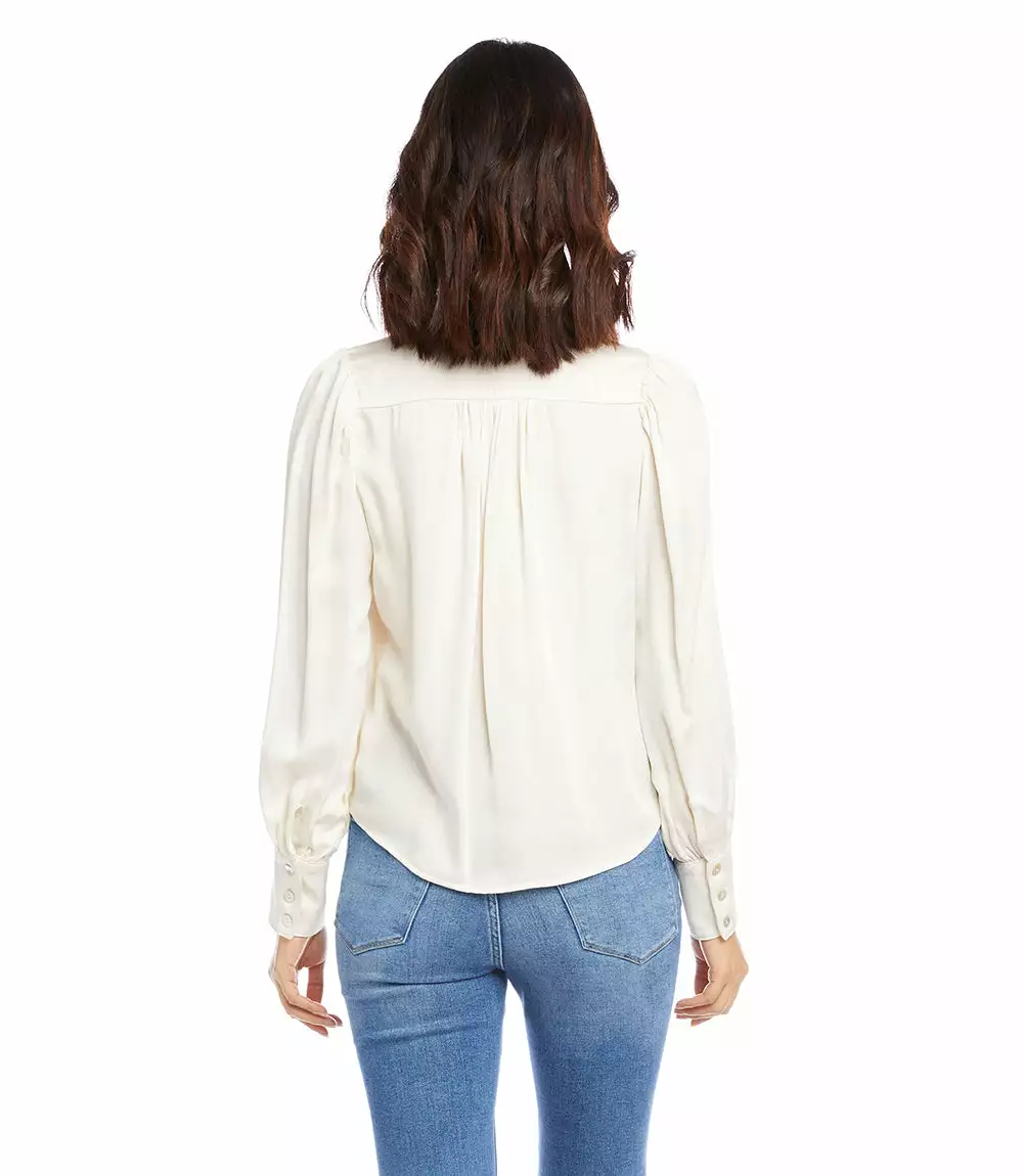 Cut from luxurious silky satin, this top is detailed with a charming neckline bow. It’s also detailed with billowy blouson sleeves. This blouse is the perfect choice for office hours, dinner and beyond.