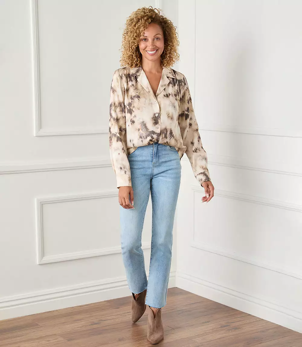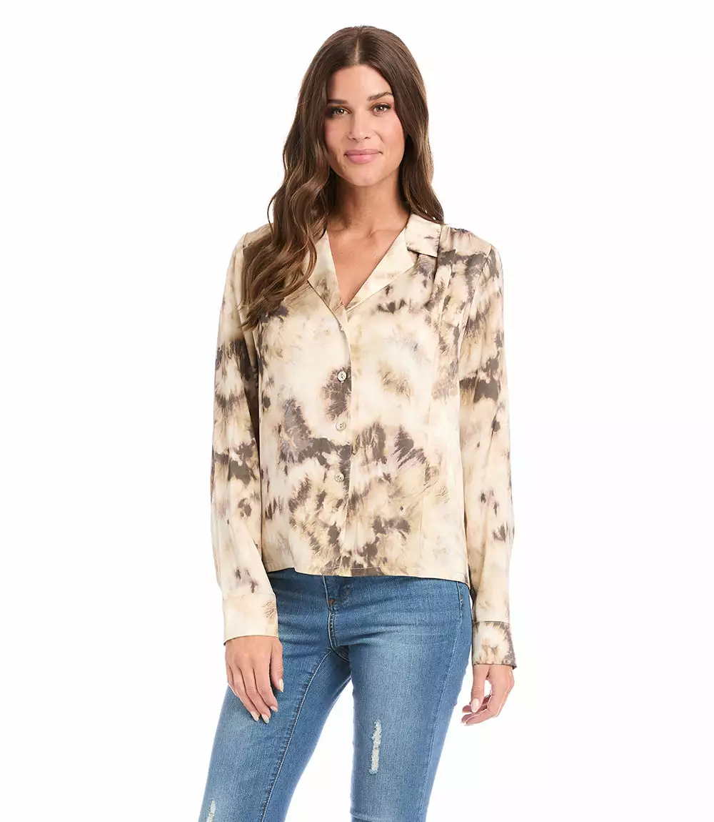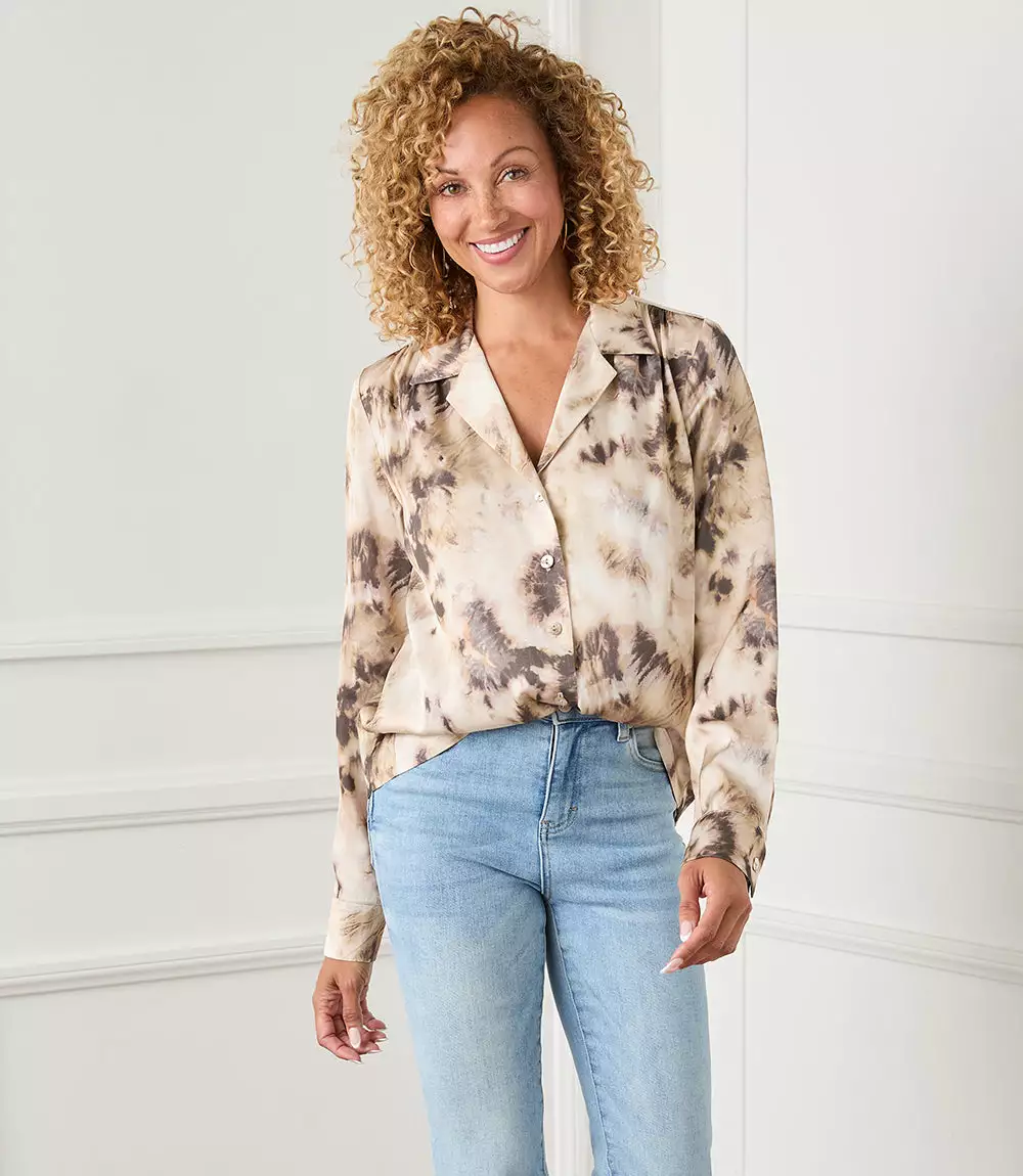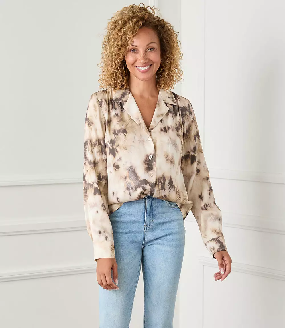 This button-up shirt is both casual and polished with a cloudy tie-dye print and a relaxed fit. It’s detailed with a notched collar and cuffed sleeves.