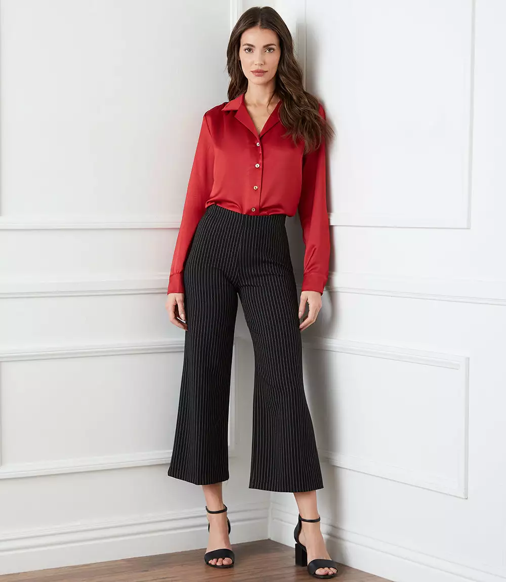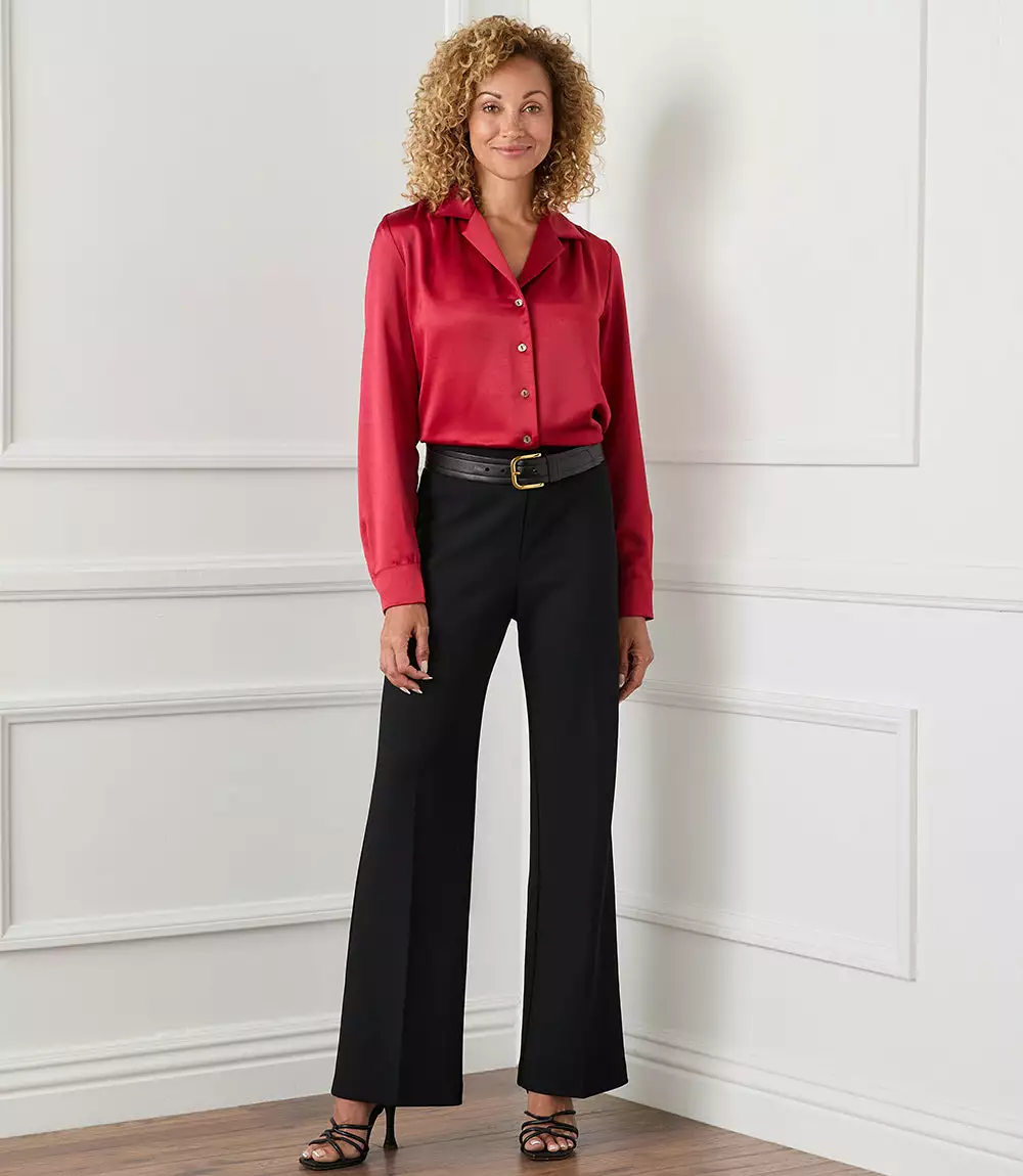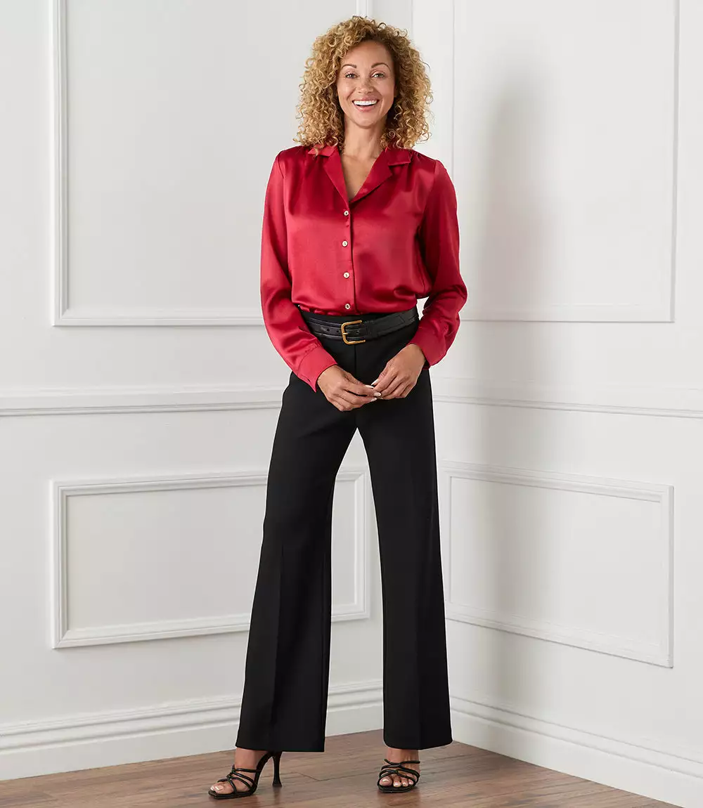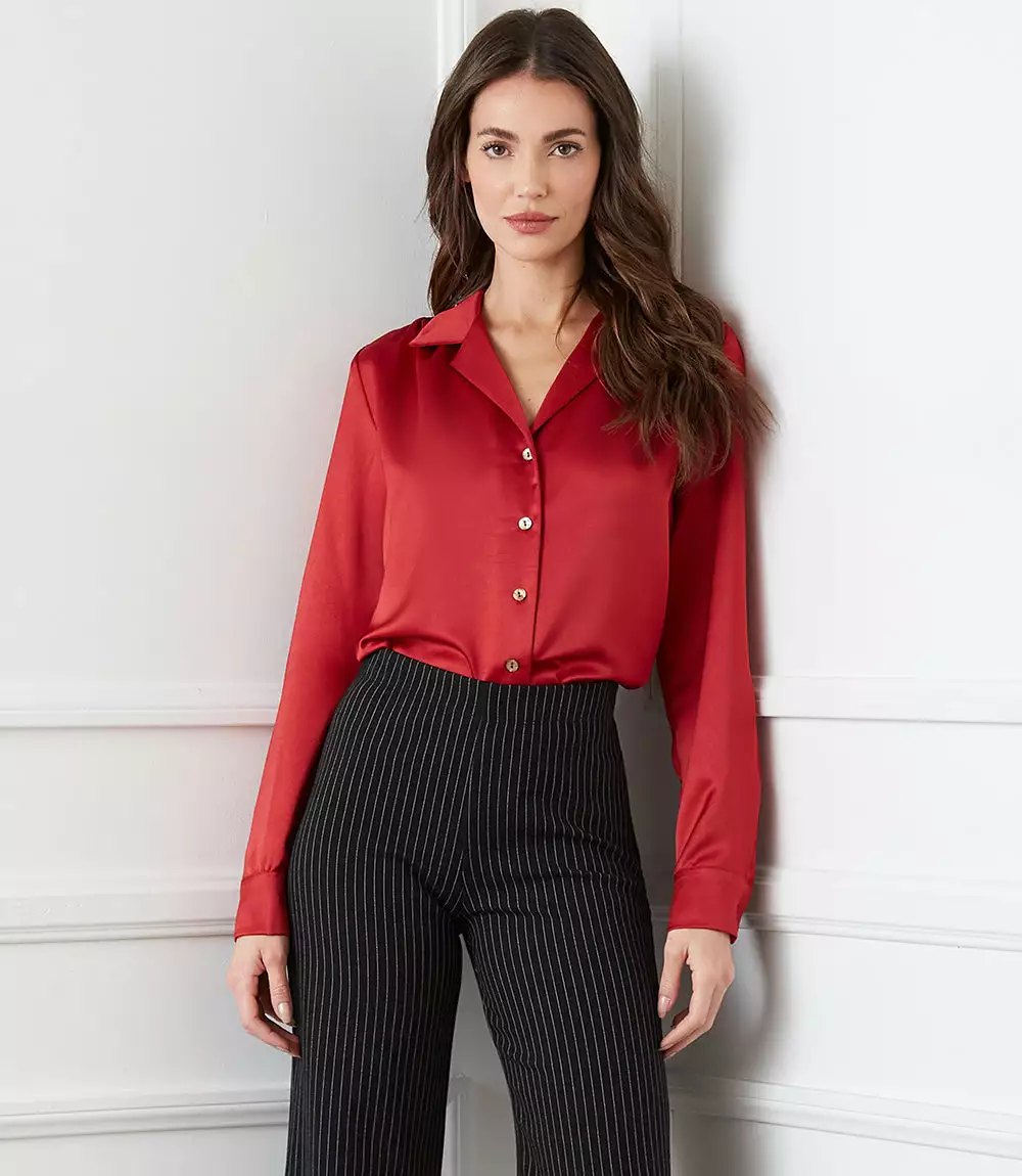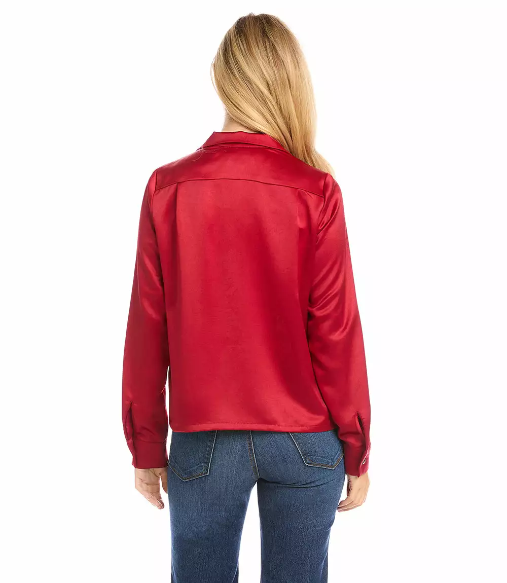 Cut from luxurious vintage heavy satin, this top is detailed with a polished notched collar and cuffed sleeves. The perfect layering piece – soft, shimmering, and easy to dress up or down.