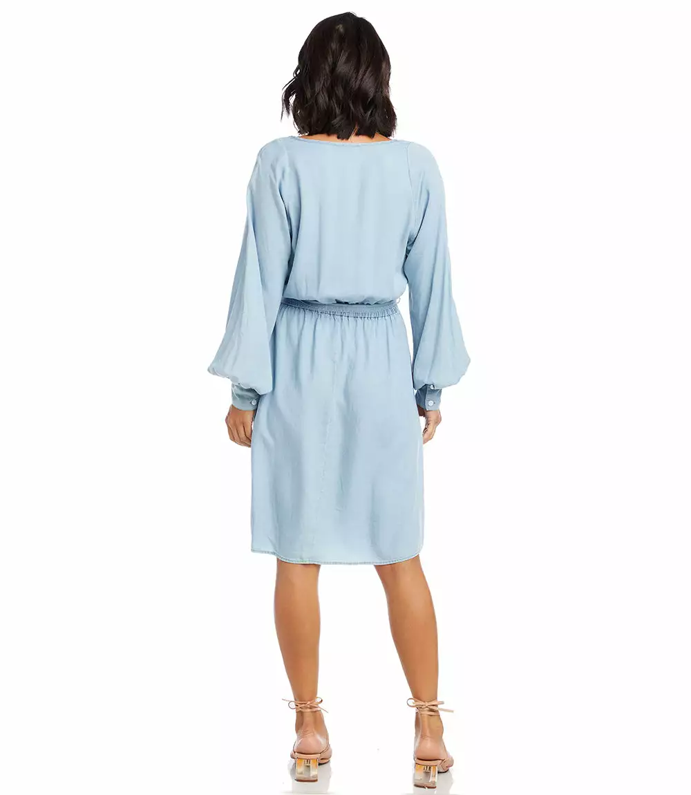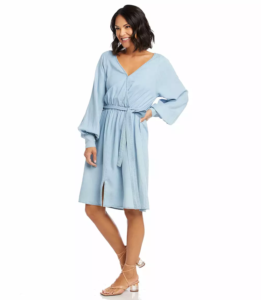 Effortless style and comfort meet in this airy, relaxed faux-wrap dress that’s finished with a waist tie for added shape. Wear this versatile denim dress with sneakers for a casual look or dress it up with heels.