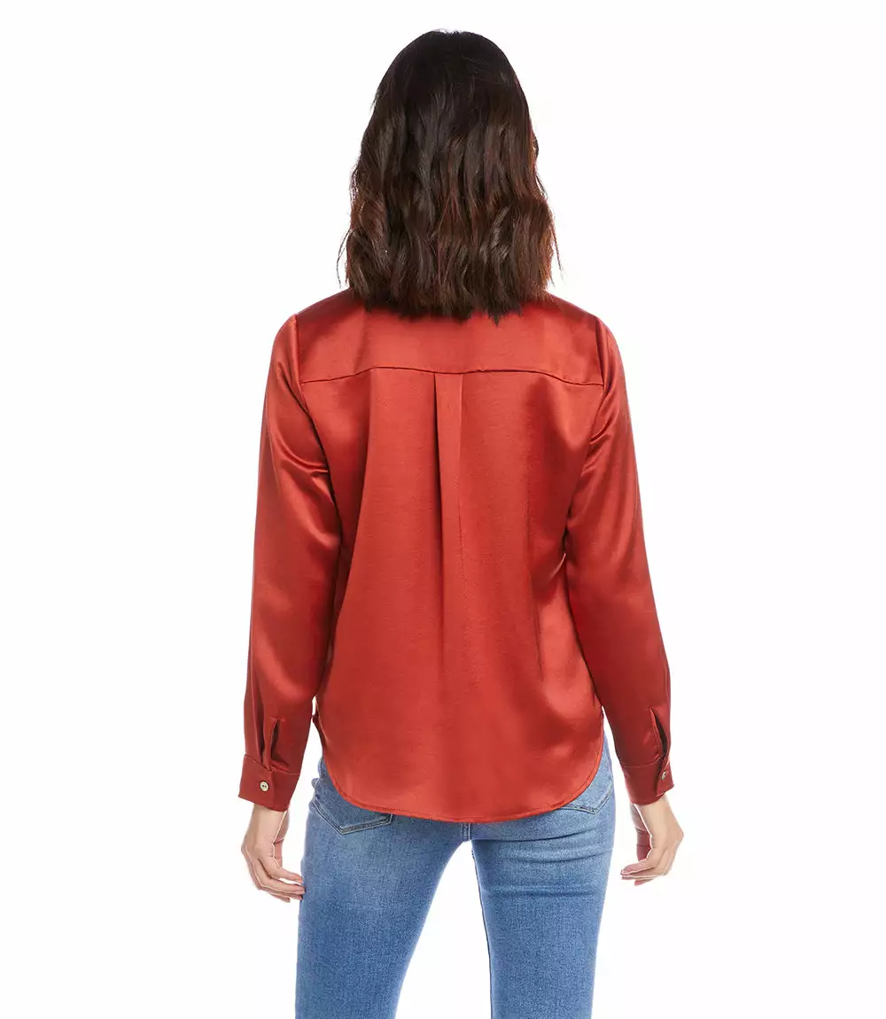 Cut from luxurious heavy satin, this timeless button-down shirt is a wardrobe staple with its classic silhouette and polished cuffed sleeves. This satin shirt is timeless and versatile- wear it to work or on a night out.