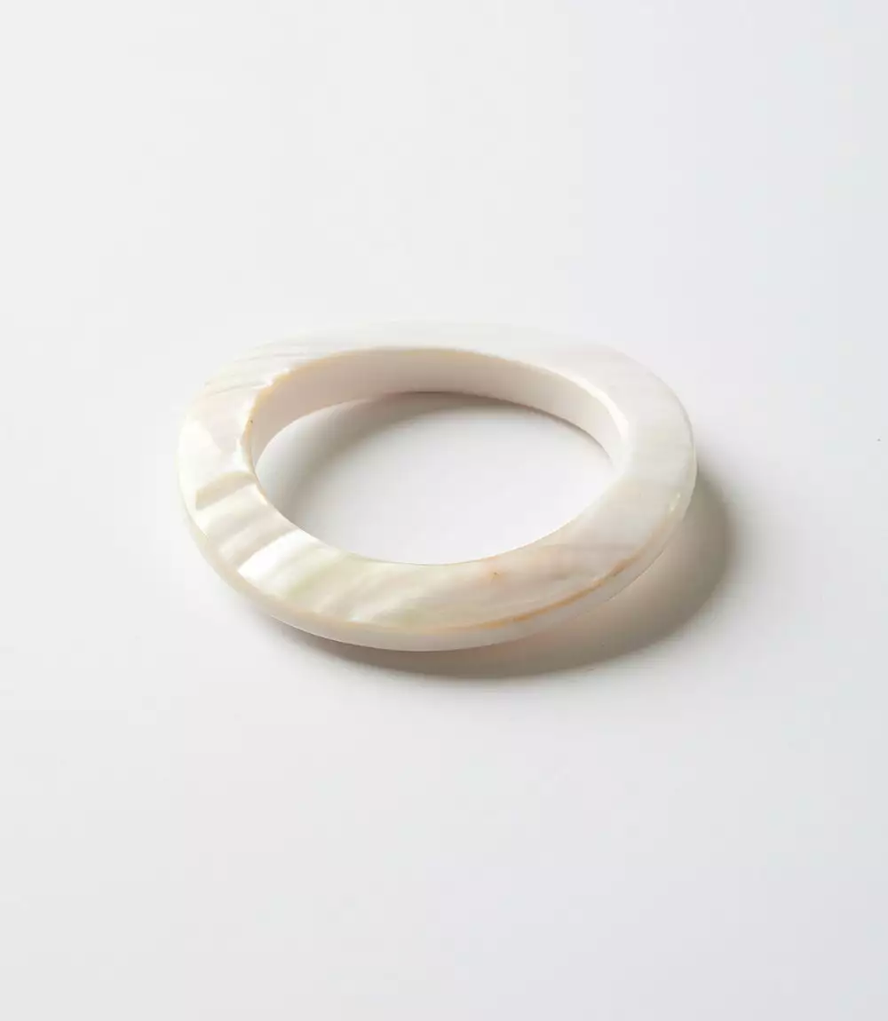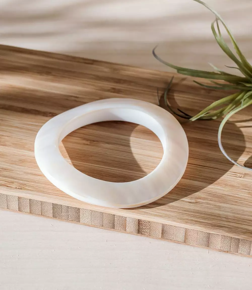 Seamlessly hand carved from a single piece of shell by master artisans, this mother-of-pearl bangle delivers timeless elegance. Due to the material and production process, slight variations in color, pattern, or texture may occur naturally. We invite you to embrace their uniqueness and imperfections.